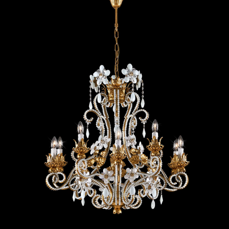 An astonishing and lavish chandelier adorned with gold leaf coating, rows of white ground beads, and white crystal pendants. Using 10 lights this item is able to provide superb illumination that shows every one of its details. Since this piece is original and it can't be found anywhere else, it will make any space so much more unique. Alan Mizrahi Lighting Design uses the latest technology, but also incorporates fine materials traditionally handcrafted by local artisans. Each fixture is meant to be fully integrated, spreading a charming and enchanting play of light. Thus creating a constant interaction between the lamp and the surrounding space.