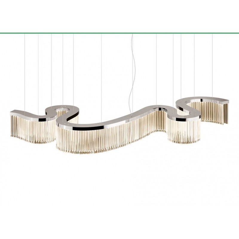 A brilliant, zoomorphic lighting sculpture seemingly suspended in mid-air, this stunning chandelier is sure to bestow a warm and classy ambiance to any modern home. Straight transparent glass pendants neatly follow the contours of the snakelike metal frame, reflecting the light radiating from each of the 23 GX53 bulbs concealed within the seductive glass tunnel. The other two variants and golden options are available. Alan Mizrahi Lighting designs create a wide array of custom designed lighting fixtures and furniture according to the exact proportions, dimensions and specifications, to enhance the beauty of their living or working space.