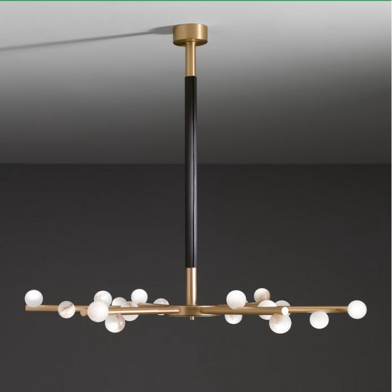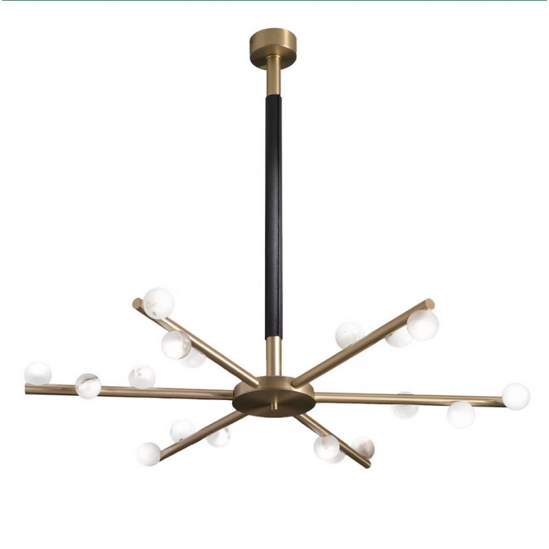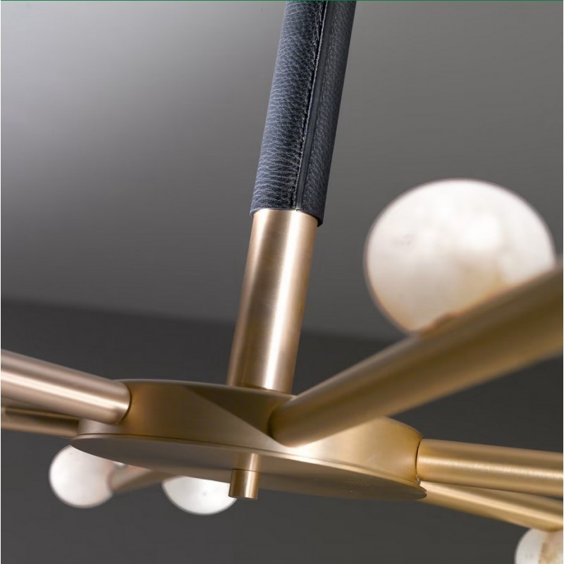 A tribute to Greek Goddess Demeter and her symbolic Torch, this stupendous chandelier will infuse an ethereal charm in a contemporary or minimalist interior. Mounted on a metal frame partly upholstered in fine black leather stitched by hand, it features six arms each completed with three fascinating spherical shades in white alabaster. Each shade supports an LED lightbulb (3000K - 126W - 200mA).
