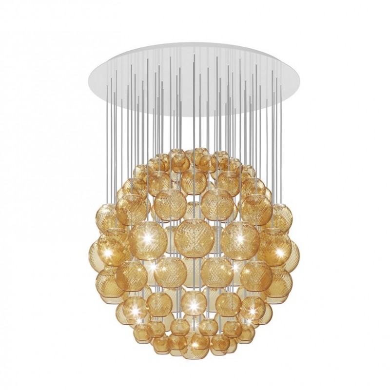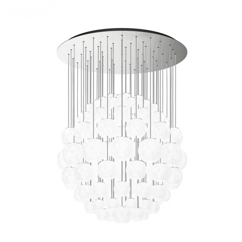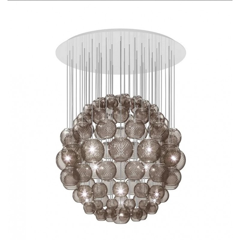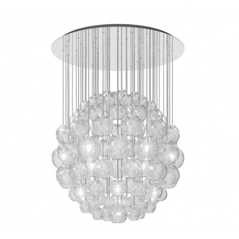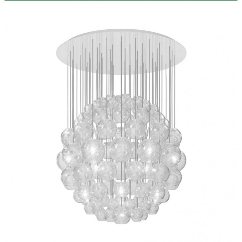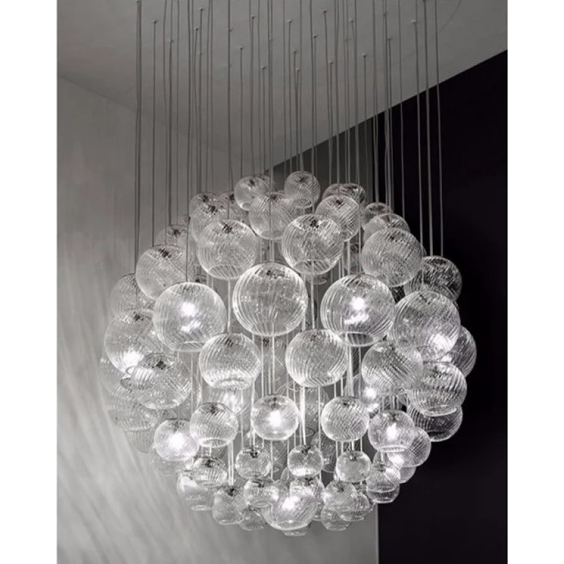 Spherical blown glass elements available in four sizes and two decorations, with and without lighting source. The special design allows the installation of more vertical glass element and infinitive custum combinations.