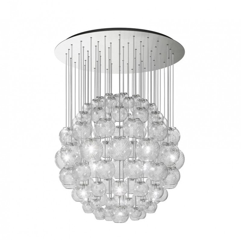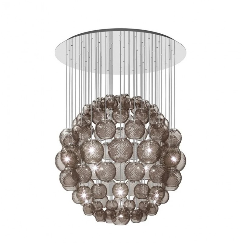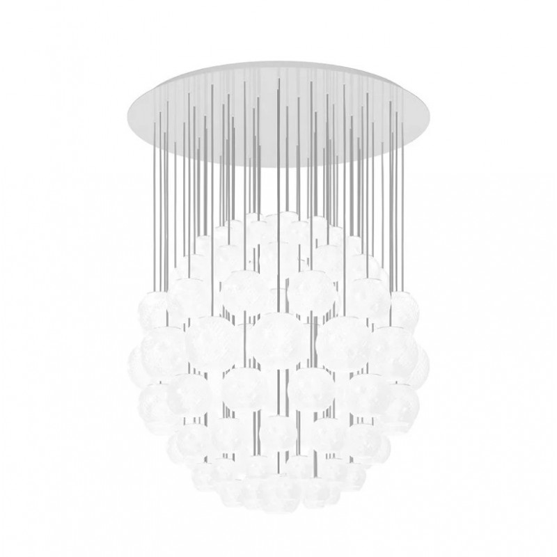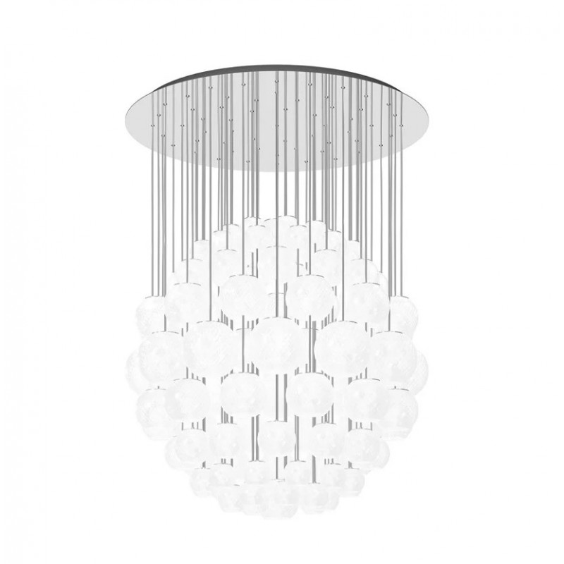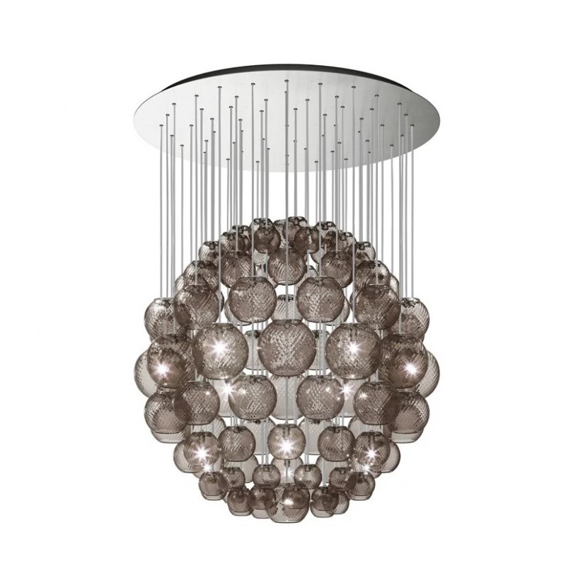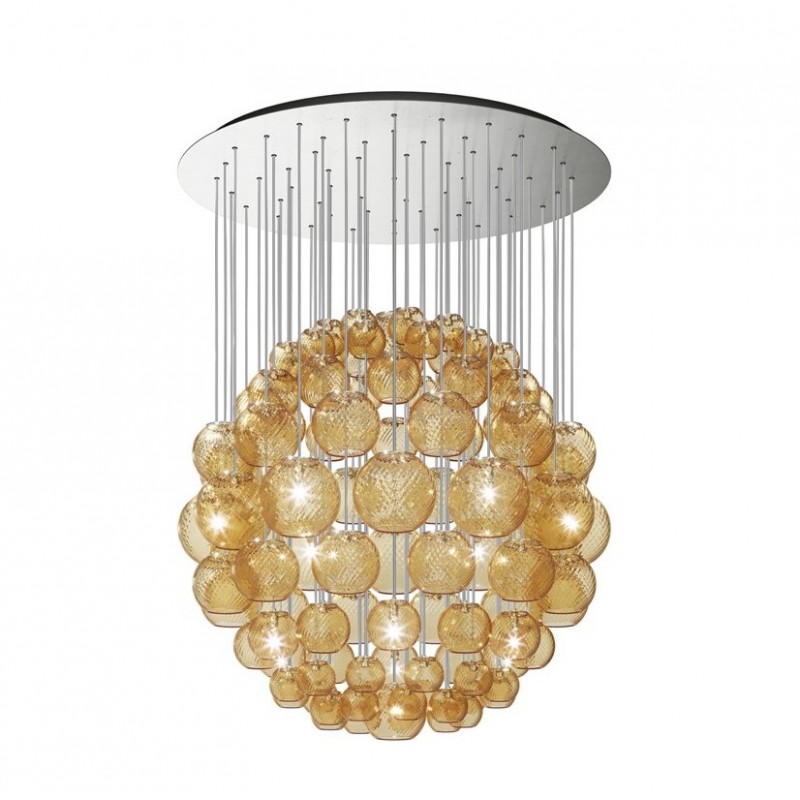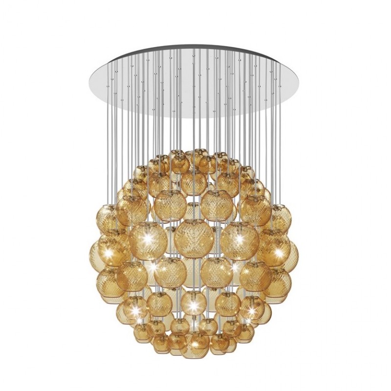 Spherical blown glass elements available in four sizes and two decorations, with and without lighting source. The special design allows the installation of more vertical glass element and infinitive custum combinations.