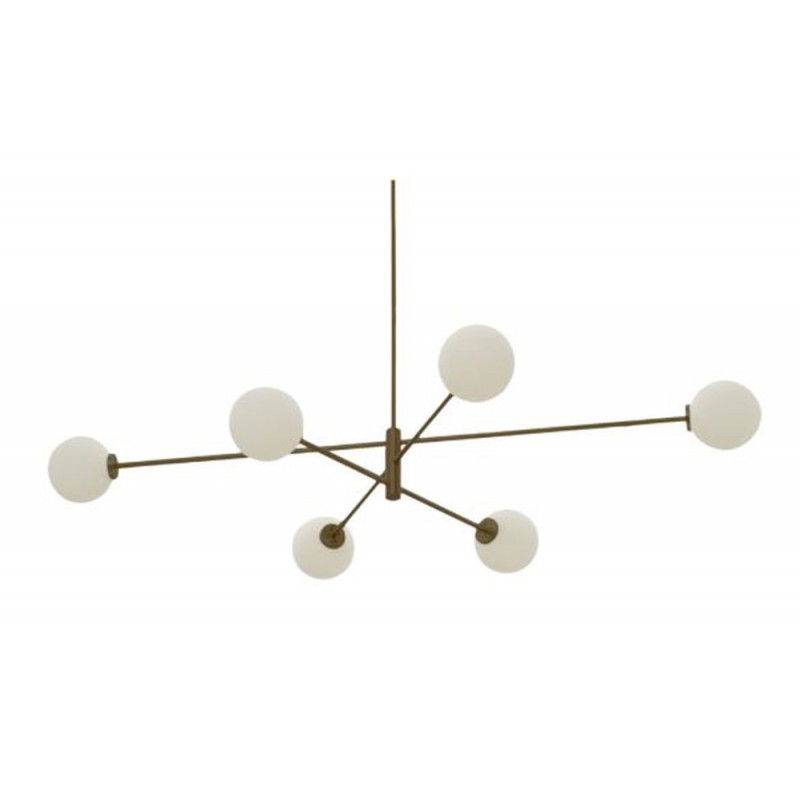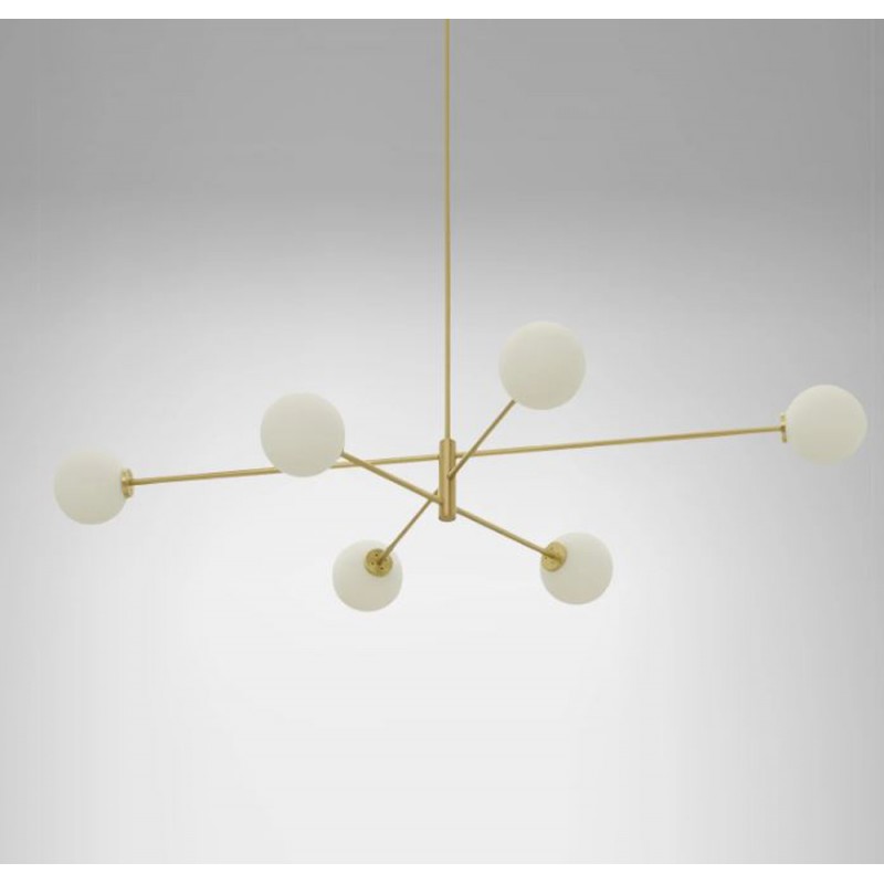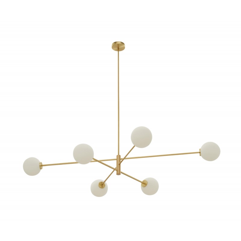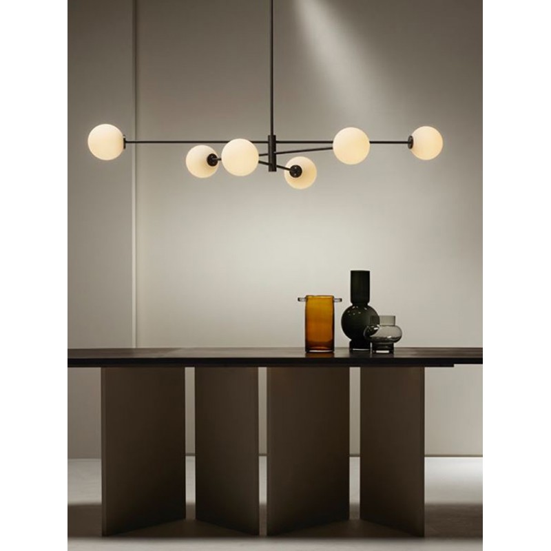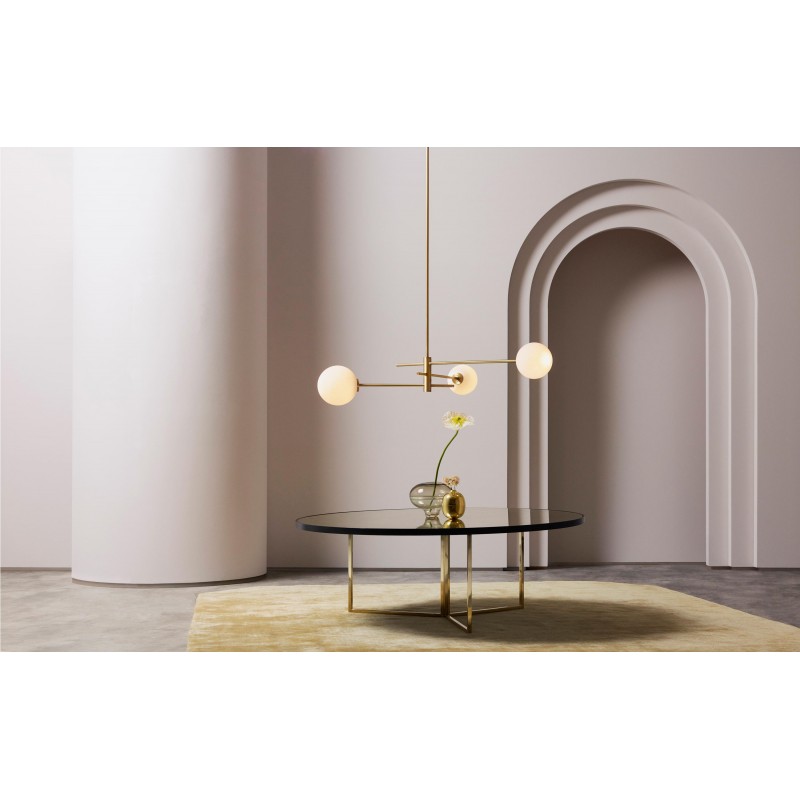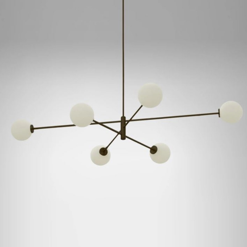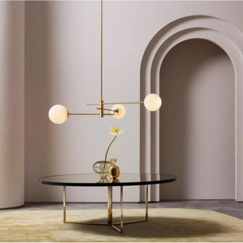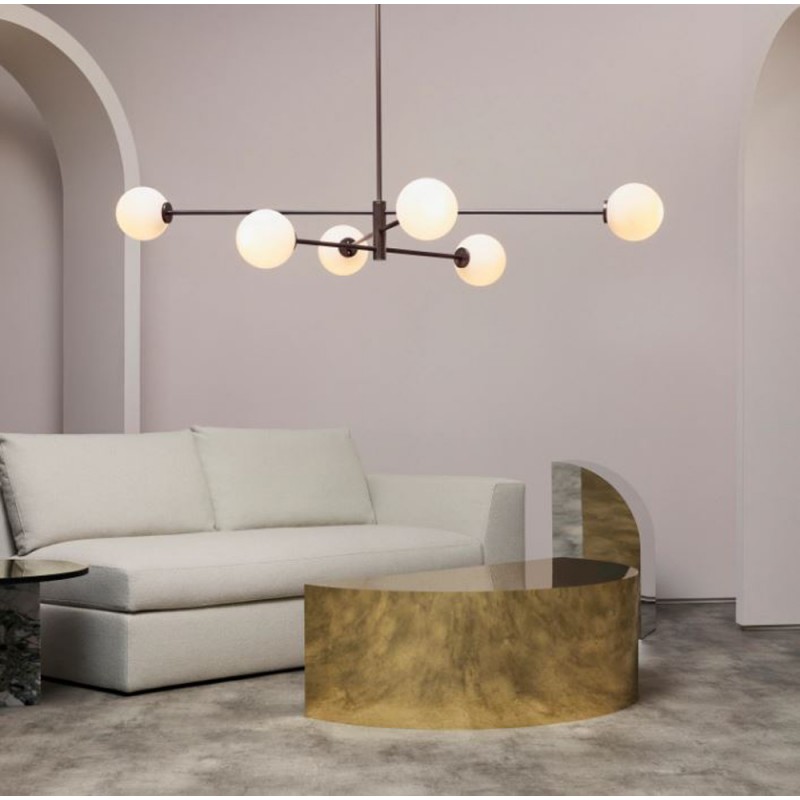 Inspired by the famous fountain at the Piazza di Trevi, the junction of 3 roads which marks the terminal point of an aqueduct. The arms of the Trevi pendant provide a perfectly balanced composition where the lines meet and extend at the precisely formed central pillar. Illuminated with either 3 or 6 glass shades, this contemporary centerpiece has satin brass or bronze finishes with matte opal glass shades.