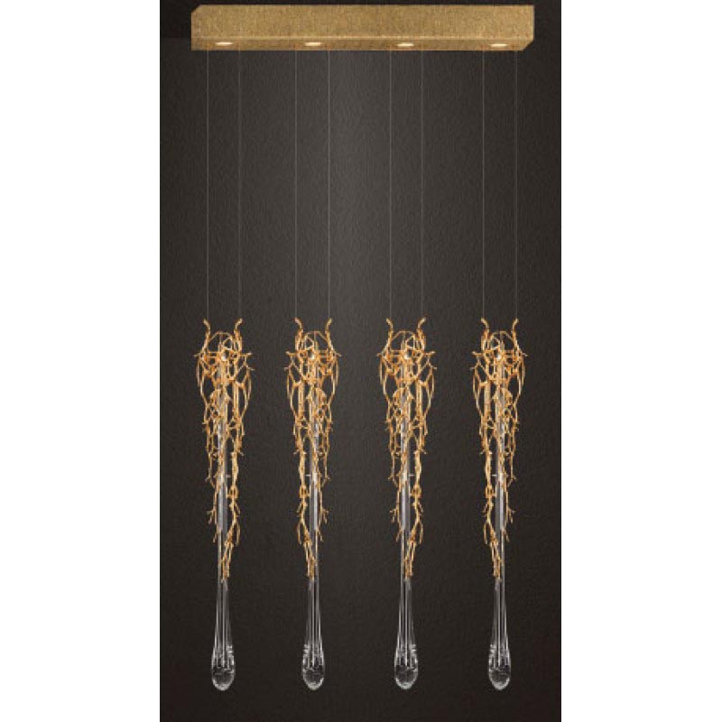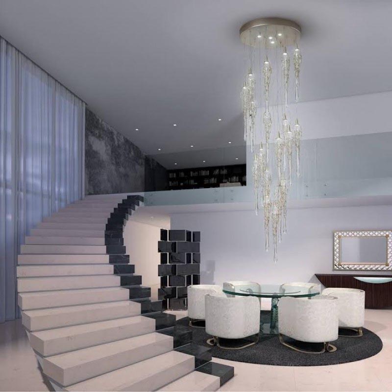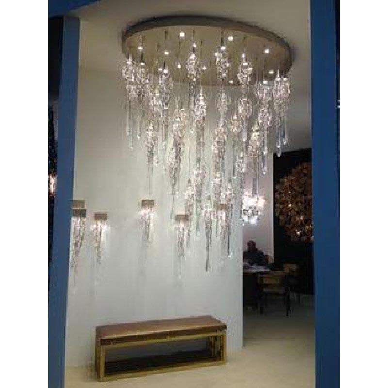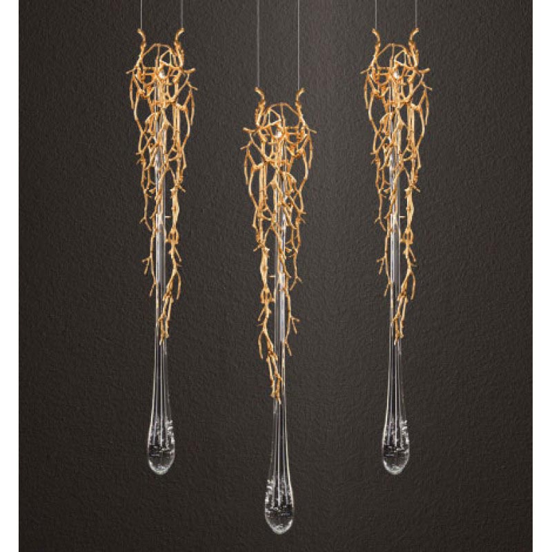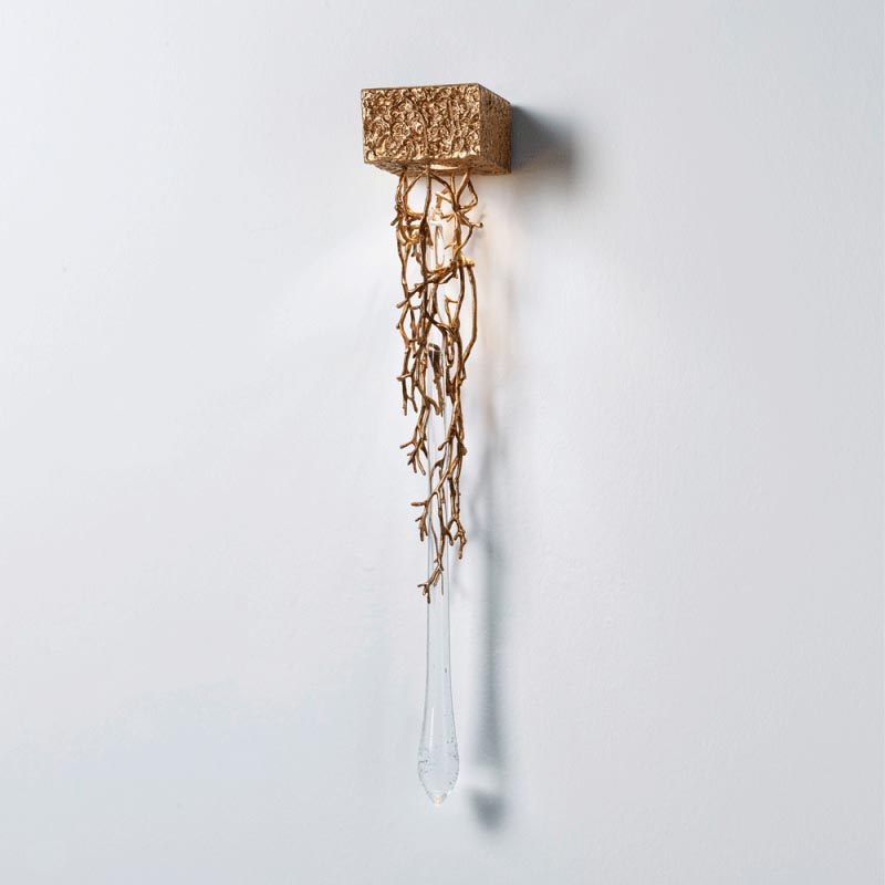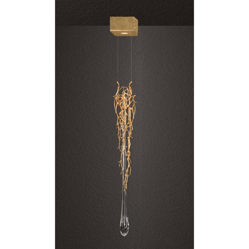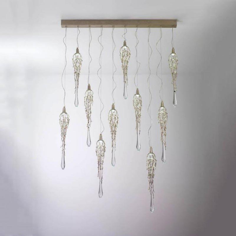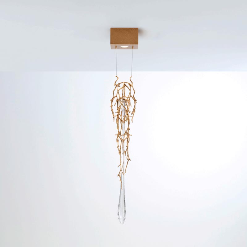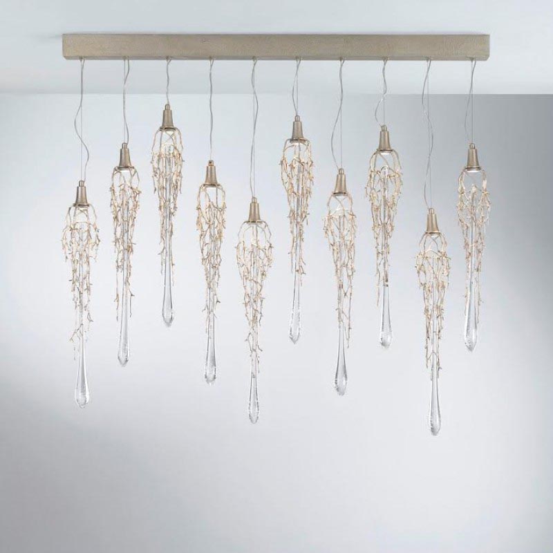 The liquid state has directly withdrawn from nature. Pure and dazzling, the Liquid collection presents itself intentionally as a dense design. The vast branched pattern surrounds a considerable sized glass piece just as an embrace of nature, where the movement of the structure tries to reach the fall of a drop of water. Due to the steel cable solution, the Liquid collection is ideal for situations that require some structure and magnificence, achieving a status of lighting sculpture. Ideal for: Contemporary interiors, framing perfectly in a vertical display.