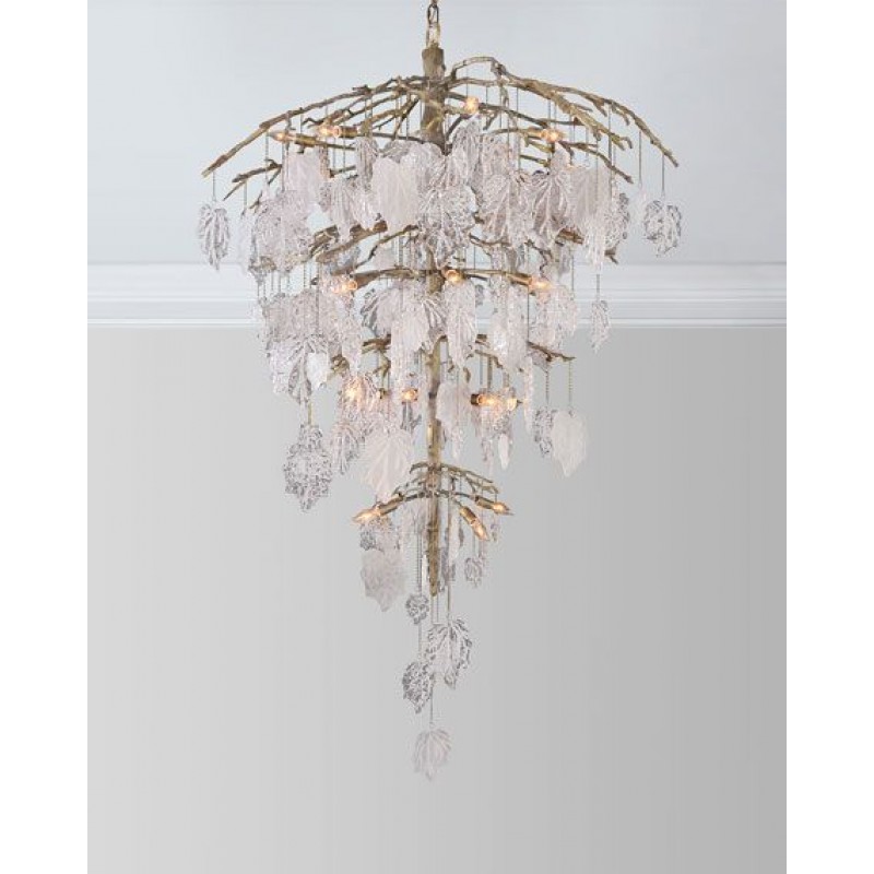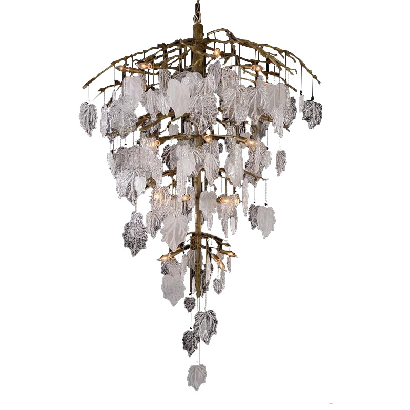Magnificent glass sugar leaves drip from organic branches on this twenty-six-light chandelier in a brushed brass finish. Having created custom chandeliers for over three decades, we specialize in bringing lighting concepts to reality, whether your inspiration comes from a rough sketch, an existing chandelier, our original concepts, or even your own creative imagination. Large or small, our team can meet the challenge, and can even coordinate the production of a private collection, where all finishes are kept consistent. Let us create the perfect lighting fixtures for your individual needs, to your individual specifications, and with attention to detail throughout production.
