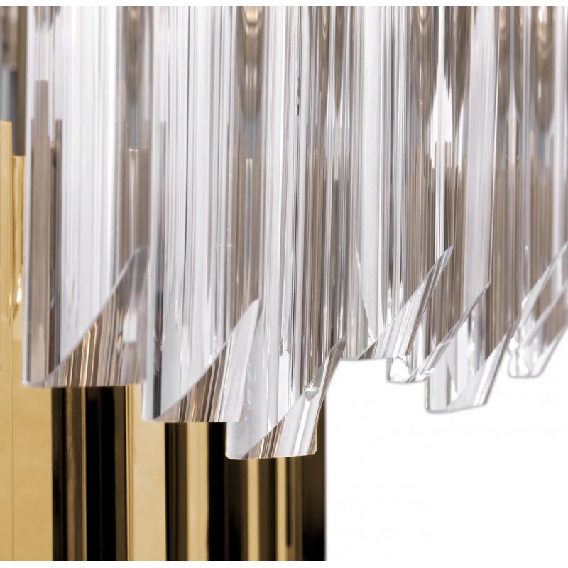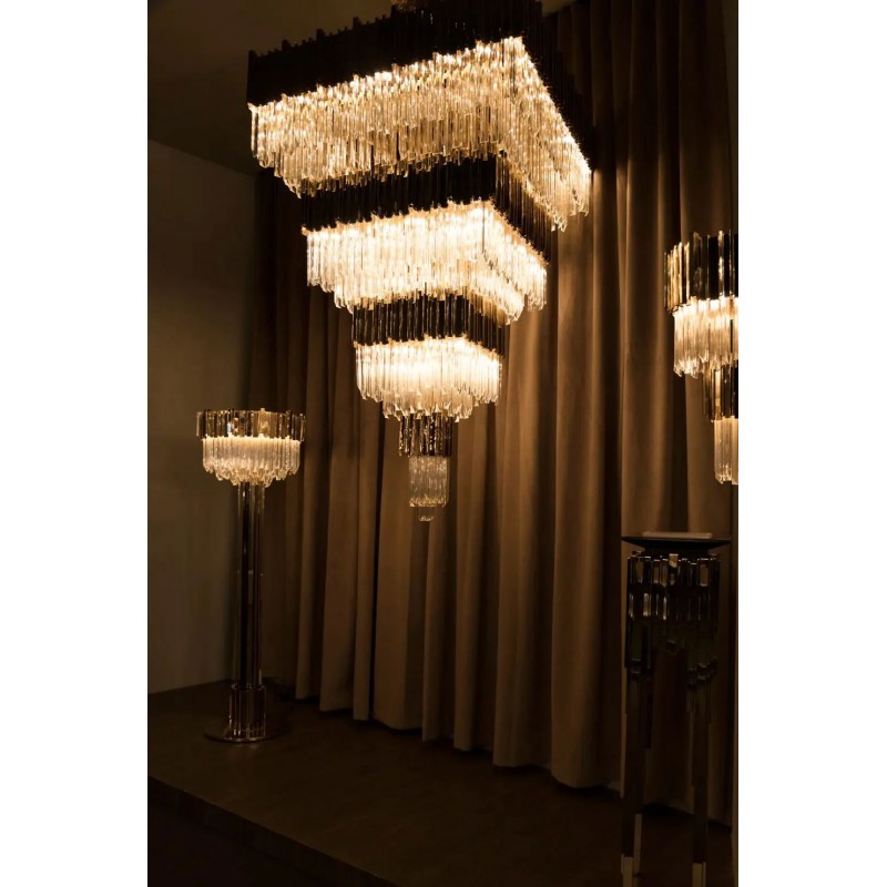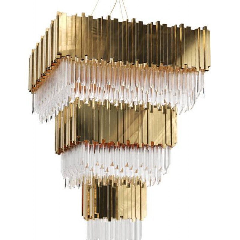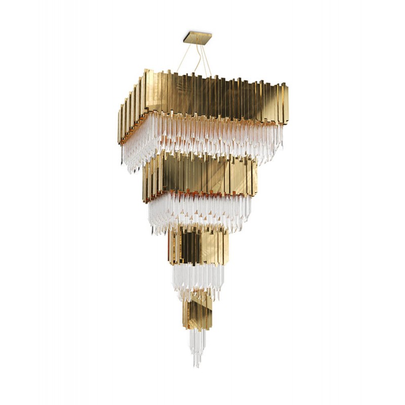 An extravagant and modern chandelier with a twist, granted by the vintage-looking crystals. Inspired by the stunning architecture of the Empire State Building all the details contribute to a piece fill with personality and a vigorous splendor. Made of gold-plated brass, the Empire Chandelier Square becomes a unique object of desire.