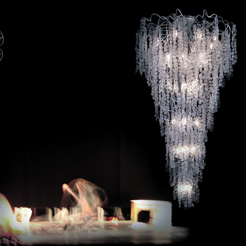 An object of spectacular visual impact thanks to its sumptuous design, this chandelier boasts a silhouette whose cascade of graceful petals in transparent glass is minutely hand-fixed. The 35 es bulbs (g9 33w each) are distributed on various tiers of the sinuous, dainty metal frame that is embellished with a covering in silver leaf. Contract and commercial certifications available upon request.