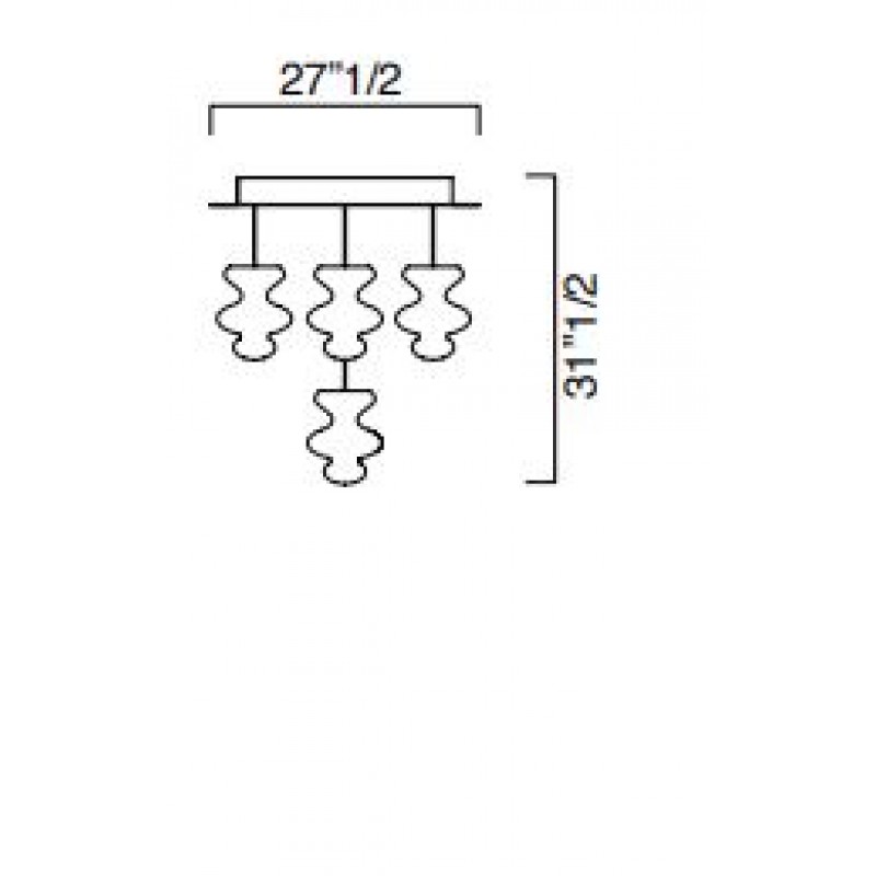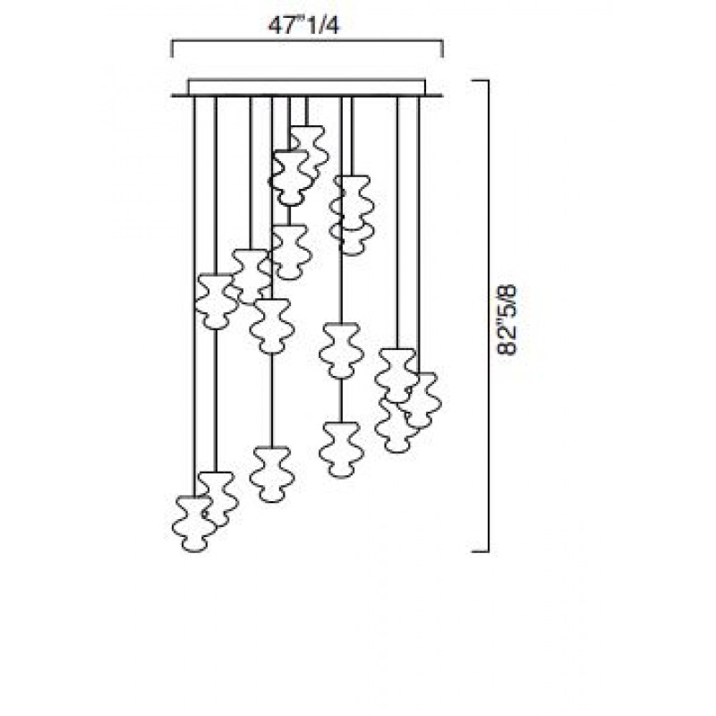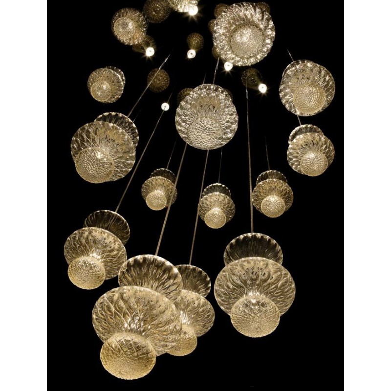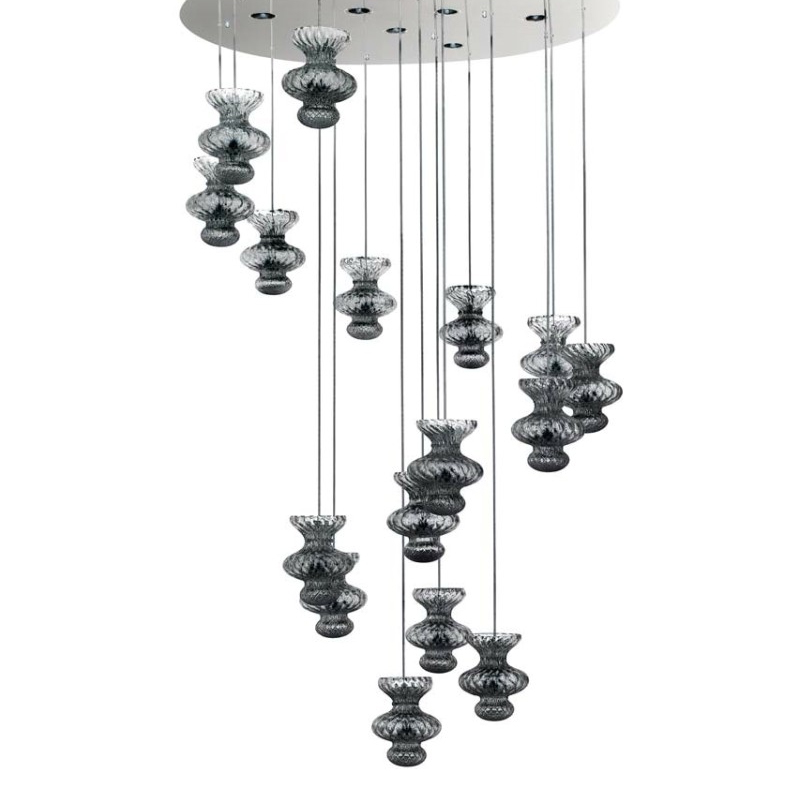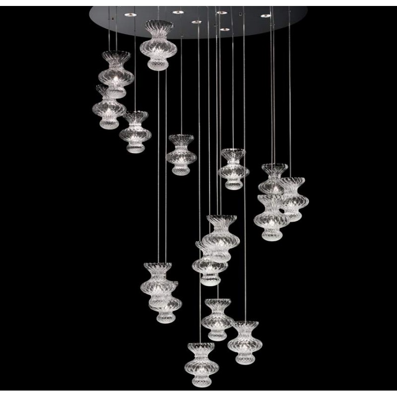 The ''bambolina'' is an element used in chandeliers of the Muranese tradition. Spirally arranged and internally lit by halogen light bulbs, they form a bright swirl that adorns the setting with designs and shadows thanks to the typical glass working called ''a balotón'' (giving a cross-relief effect on glass). The chromed fixture is equipped with low-voltage halogen downlights and is also available in rectangular form with the elements arranged linearly.