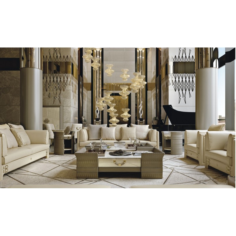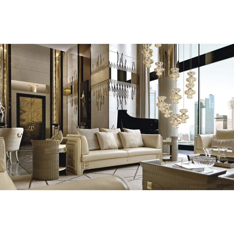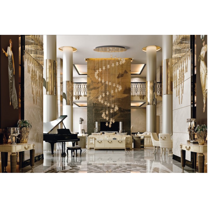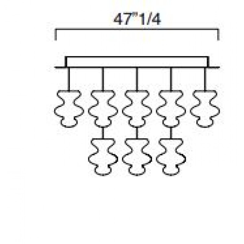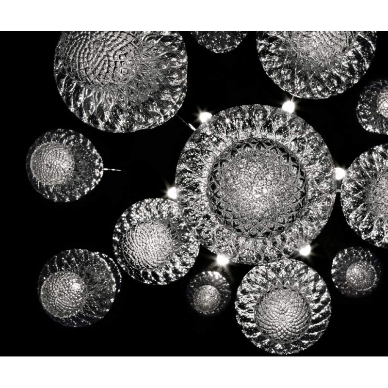 The ''bambolina'' is an element used in chandeliers of the Muranese tradition. Spirally arranged and internally lit by halogen light bulbs, they form a bright swirl that adorns the setting with designs and shadows thanks to the typical glass working called ''a balotón'' (giving a cross-relief effect on glass). The chromed fixture is equipped with low-voltage halogen downlights and is also available in rectangular form with the elements arranged linearly.