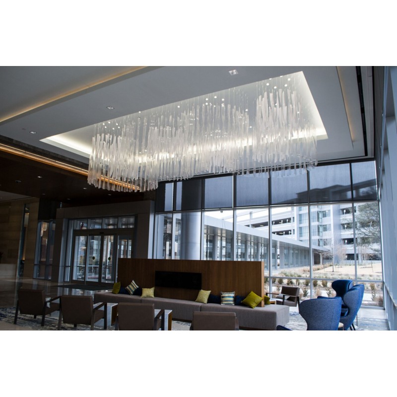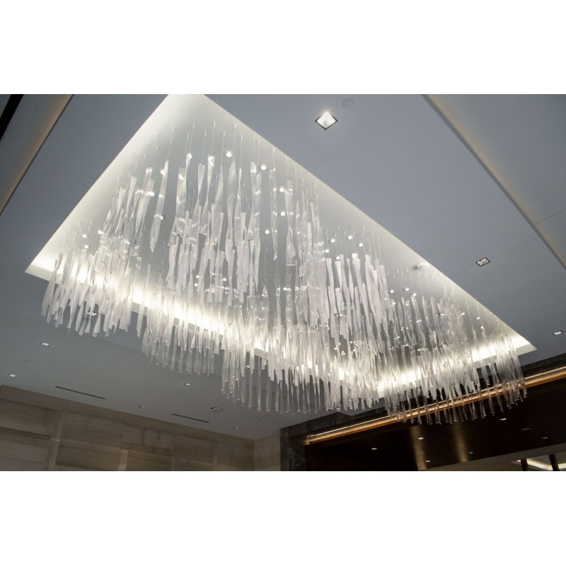 With 508 pieces, this installation fills the voluminous space by using 27” – 36” long pieces in three different textures, with can lighting angled to give the glass presence while maintaining the understated elegance desired by the customer.