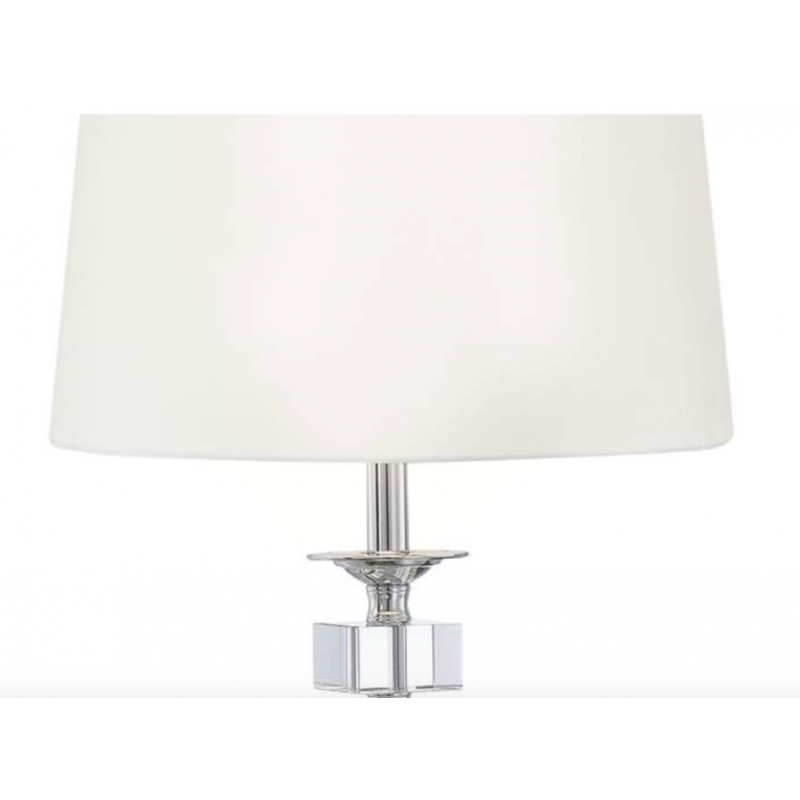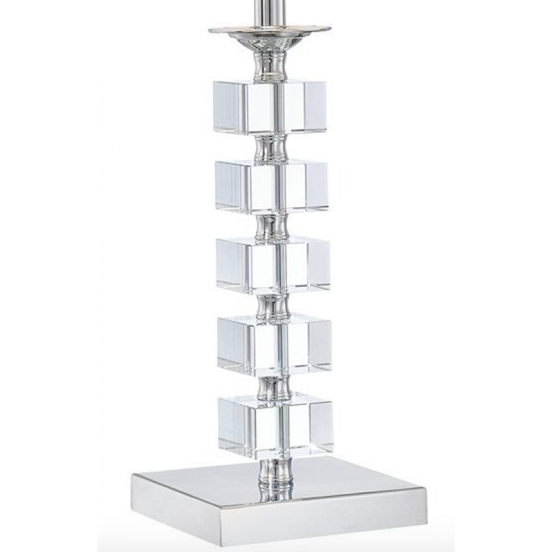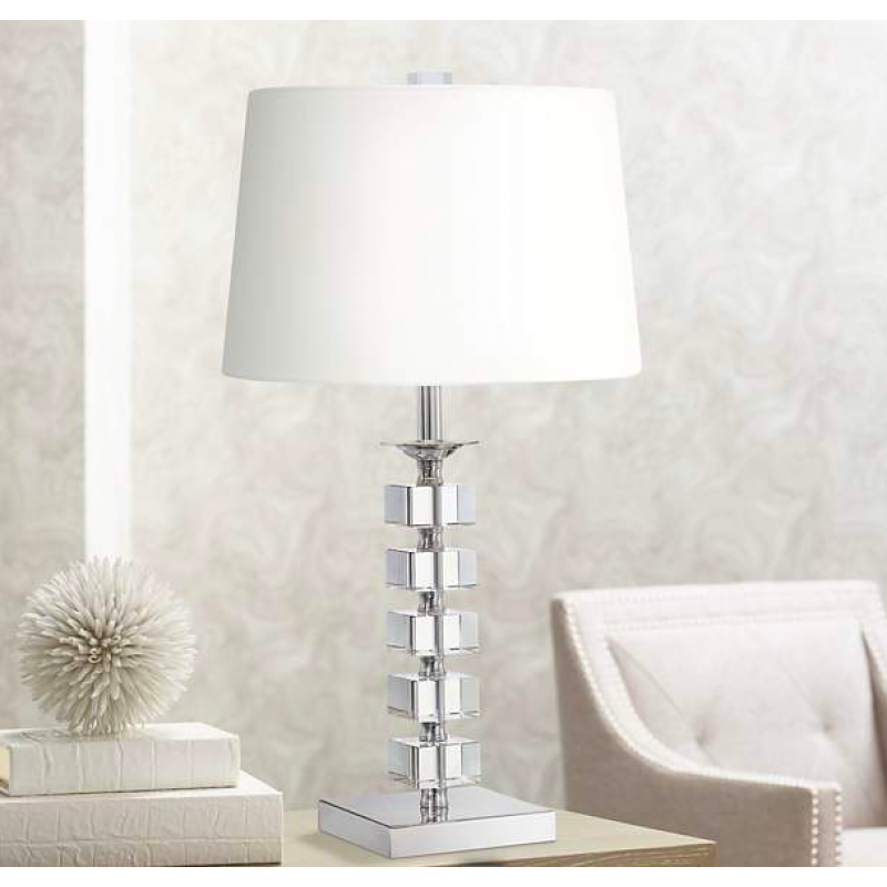 Add sparkle to any room with this contemporary crystal glass table lamp. The body features stacked cubes of clear crystal accented by chrome finish elements. This appealing design is topped with a white fabric drum shade.