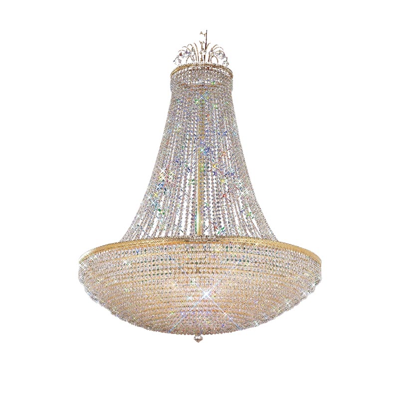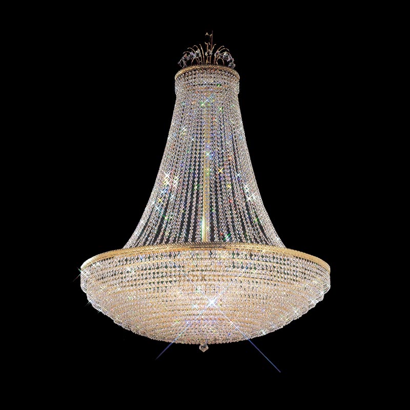 Faithful to the traditional empire design, our Fuaro chandelier offers a stately, presidential form that is bejeweled with hundred of delicate crystals. The round base is densely packed with faceted crystals that dance and shimmer. Able to complement a variety of decorating styles and applications the Fuaro is capped by an ornate coronet that contributes to this regal fixture timeless elegance.