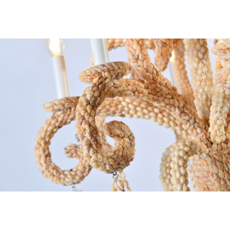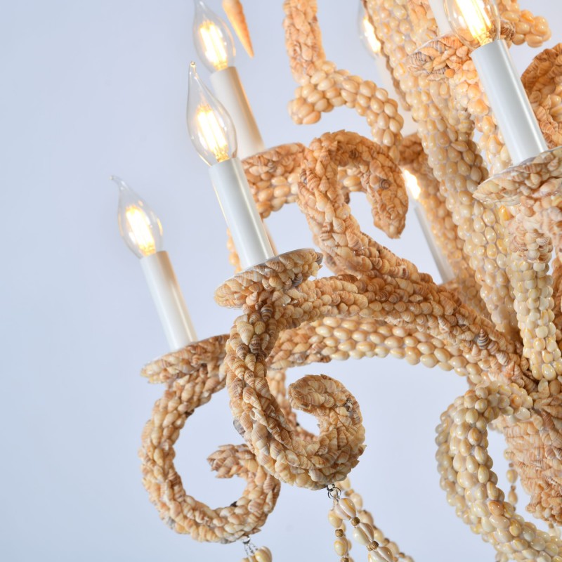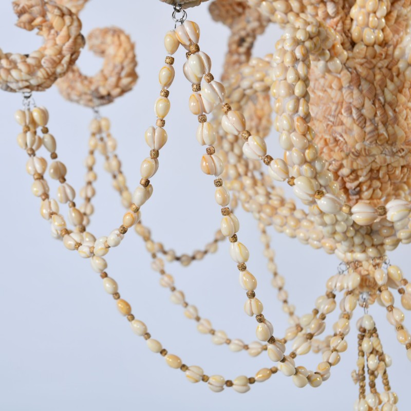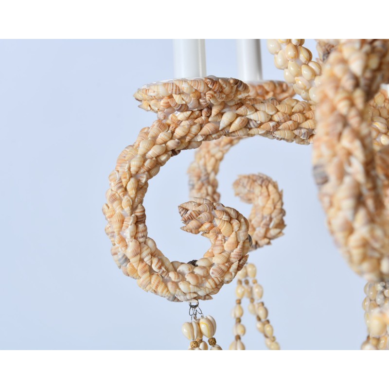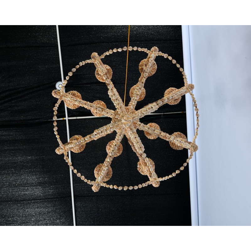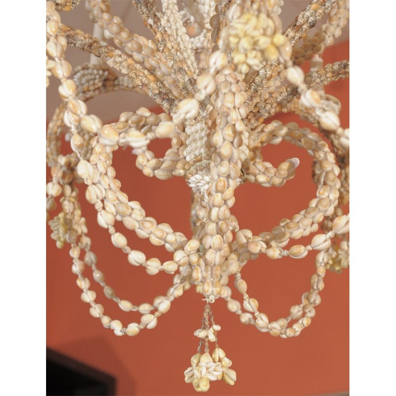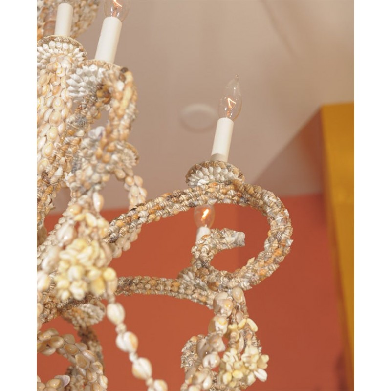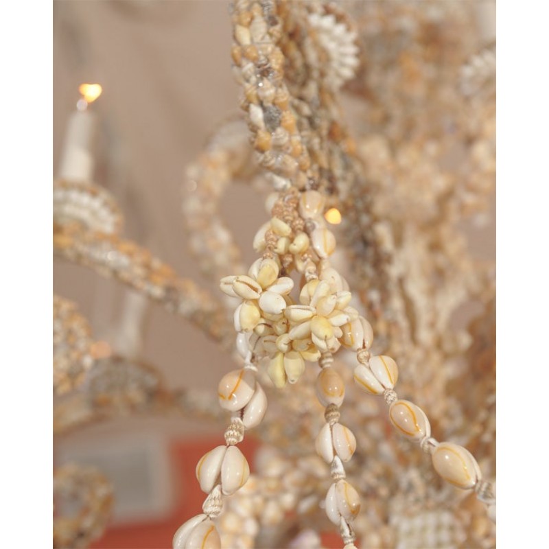 An intricately detailed chandelier of natural shells with imposing size and presence. It never ceases to amaze with its sheer quantity of shells. Alan Mizrahi Lighting Design uses the latest technology, but also incorporates fine materials traditionally handcrafted by local artisans. Each fixture is meant to be fully integrated, spreading a charming and enchanting play of light. Thus creating a constant interaction between the lamp and the surrounding space.