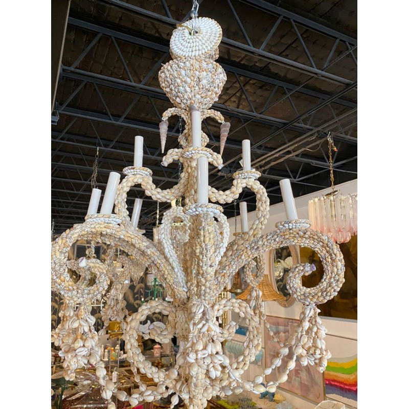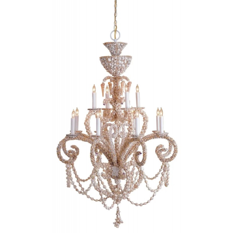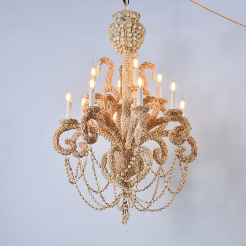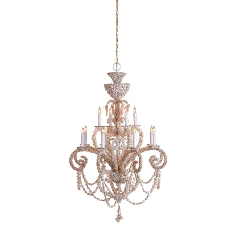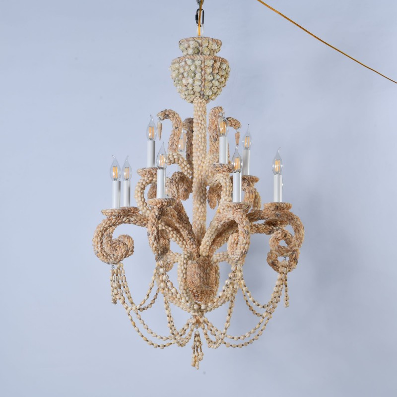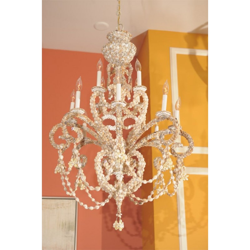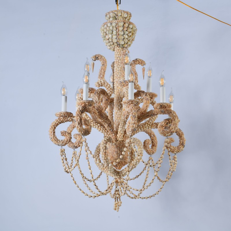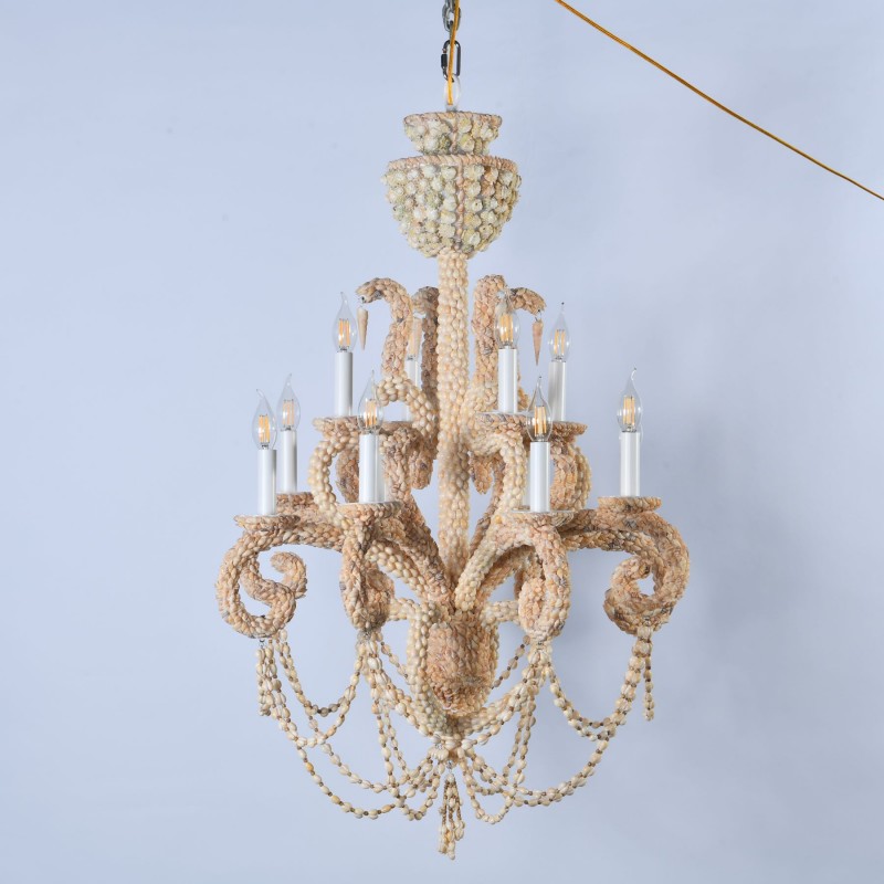 An intricately detailed chandelier of natural shells with imposing size and presence. It never ceases to amaze with its sheer quantity of shells. Alan Mizrahi Lighting Design uses the latest technology, but also incorporates fine materials traditionally handcrafted by local artisans. Each fixture is meant to be fully integrated, spreading a charming and enchanting play of light. Thus creating a constant interaction between the lamp and the surrounding space.