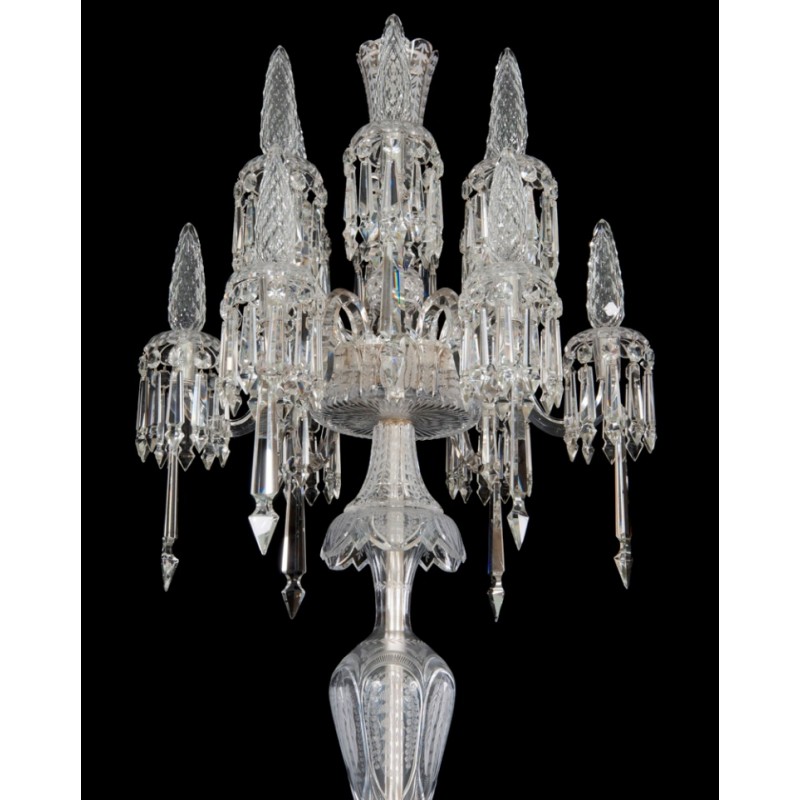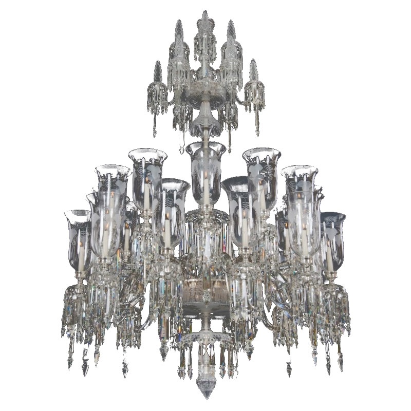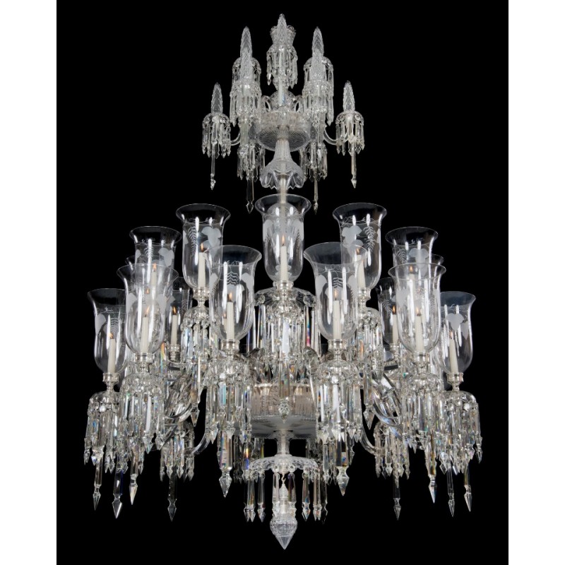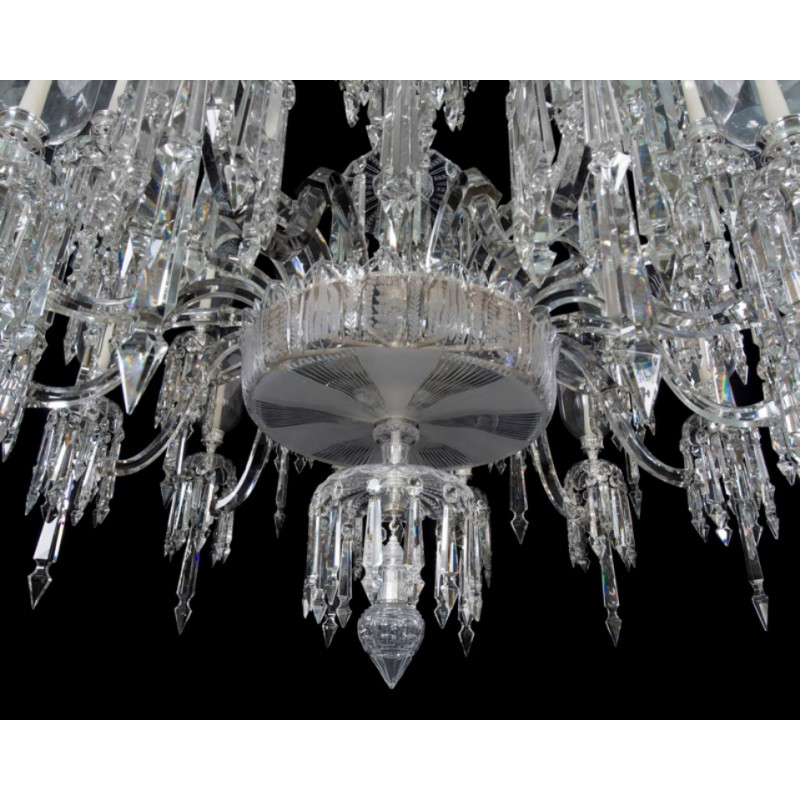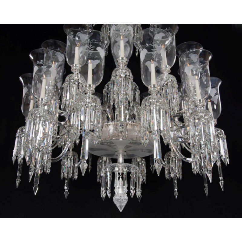 The cut crystal shaft of the fountain form unusually engraved with anthemion the upper section with twelve scroll branches arranged on two levels these with scallop edged turnover canopies and pine cone finials. The main receiver bowl with under canopy and finial the receiver mount surmounted by twenty-four candle branches arranged on two tiers these with corresponding canopies to the upper section these hung with eight sided spangles and spear shaped drops the branches surmounted with finely engraved hurricane shades the chandelier must likely be made for the India market because of the use of this type of shades.