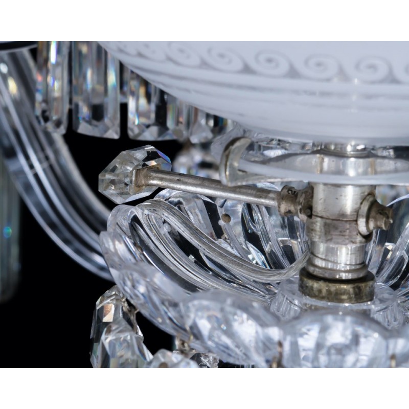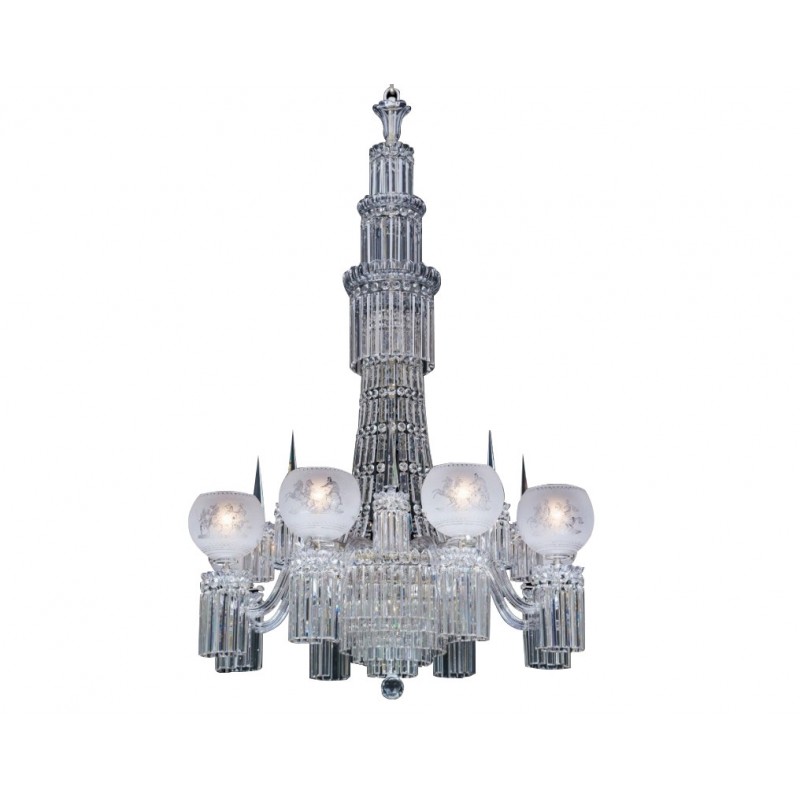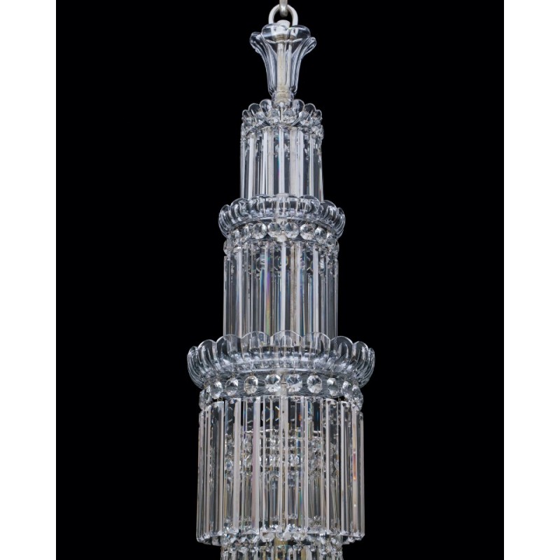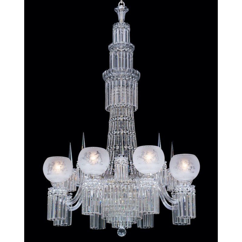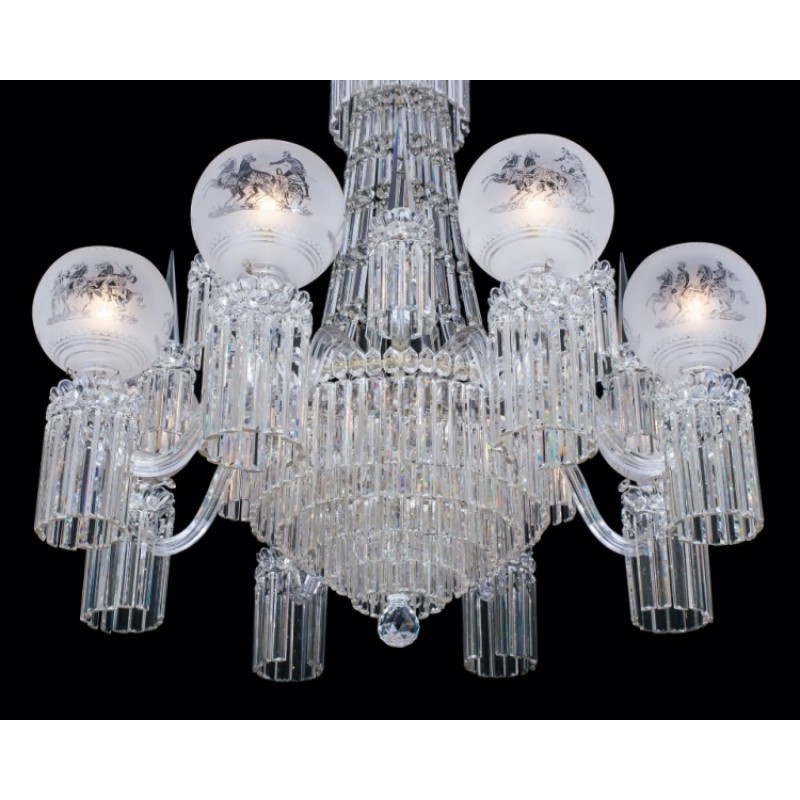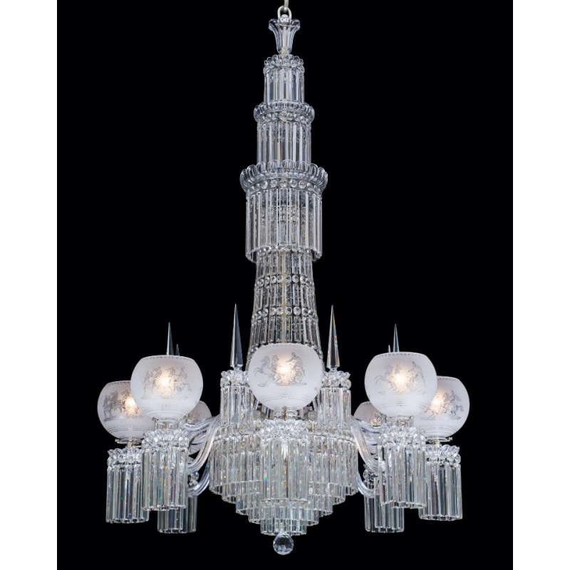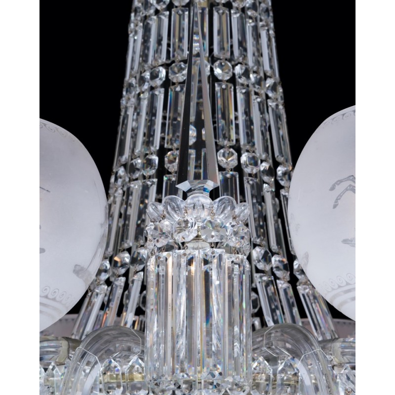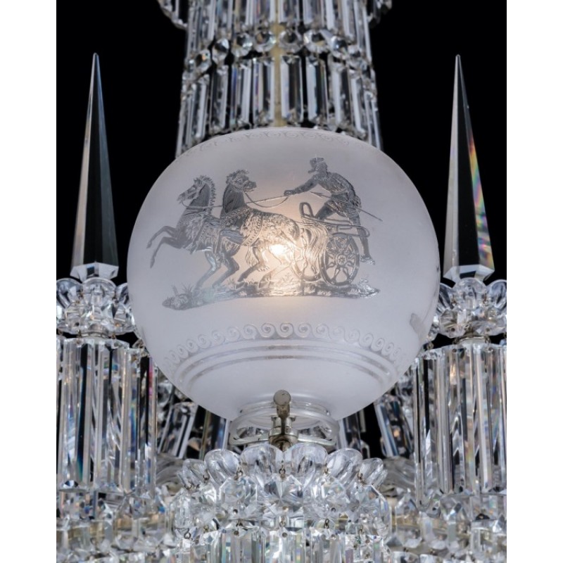 A fine eight light of tent and waterfall with graduating drop hung dishes cascading to a rule drop tent, this draped to the main ring issuing eight decorative six sided branches mounted with drop hung drip pans and spires, the central mount issuing a further eight hollow six sided arms for gas still retaining their original glass gas taps, each supporting a drop hung drip pan and engraved frosted shades with classic roman scenes, the main ring supporting five concentric rings of drops and lapidary cut finial, the chandelier hung with eight sided spangles and rule drops.