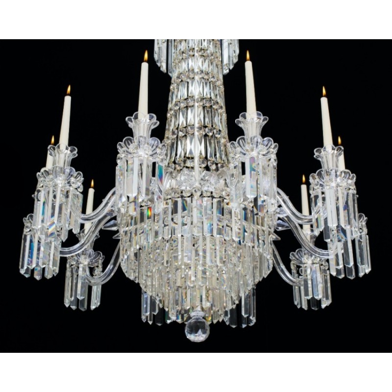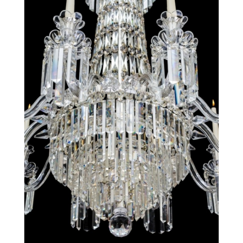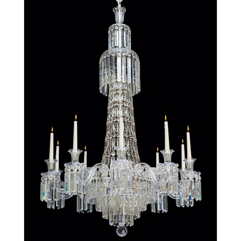 A fine ten light cut glass and silvered mounted chandelier of classic tent and waterfall design the stem consisting of a tent of drops above which there is two drop hung canopy's terminating with scalloped top piece. The main ring supporting ten six sided candle arms terminating with flute cut drip pan and scalloped slice cut candle nozzles. The main ring mounted with star cut six sided flower rosettes and faceted spikes, below this the waterfall is made up of concentric rings hung with prismatic drops and eight sided spangles terminating with a lapidary cut finial.