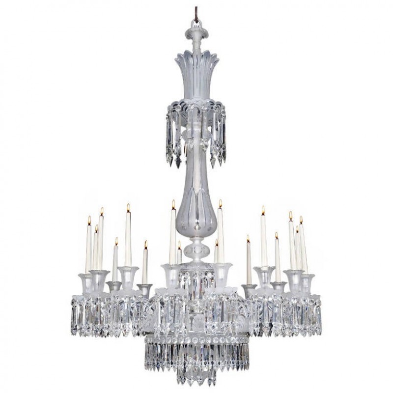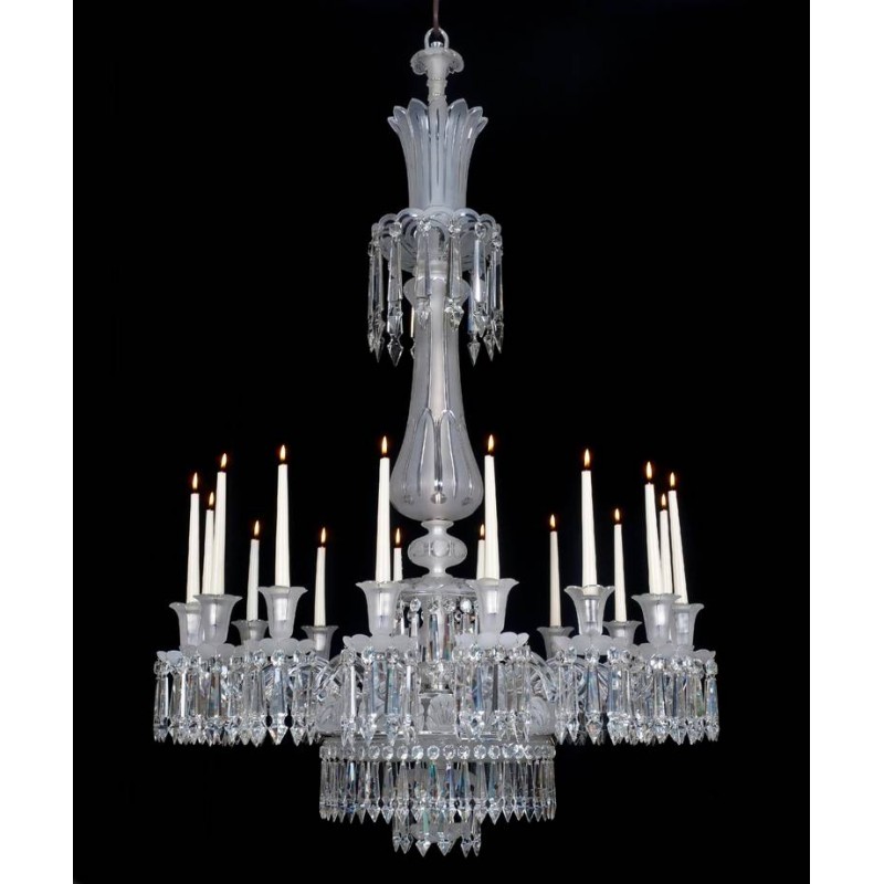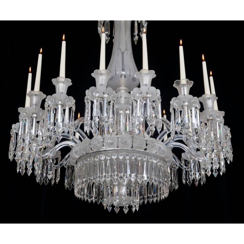 A fine quality mid-Victorian cut-glass silvered mounted sixteen-light chandelier the baluster stem with drop hung top canopy, terminating with petal edged frosted glass crown, the main frame surmounted by frosted glass shells, separated by sixteen leaf cut candle arms supporting petal edge nozzles and drip pans hung with spear shaped drops and eight sided spangles, the drop hung receiver bowl with lower canopy, also hung with spear drops terminating with finial.