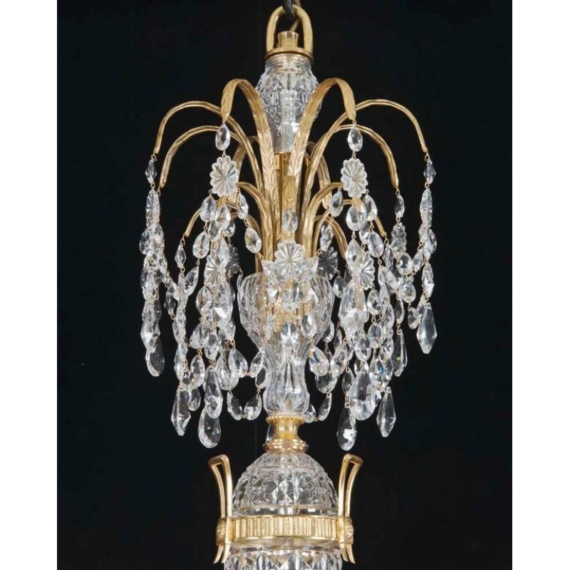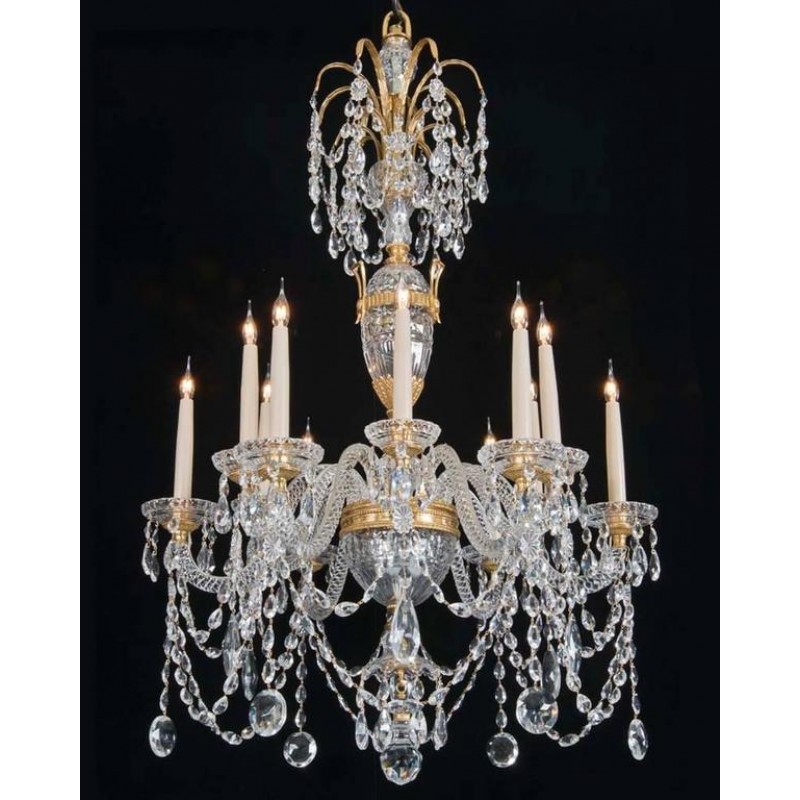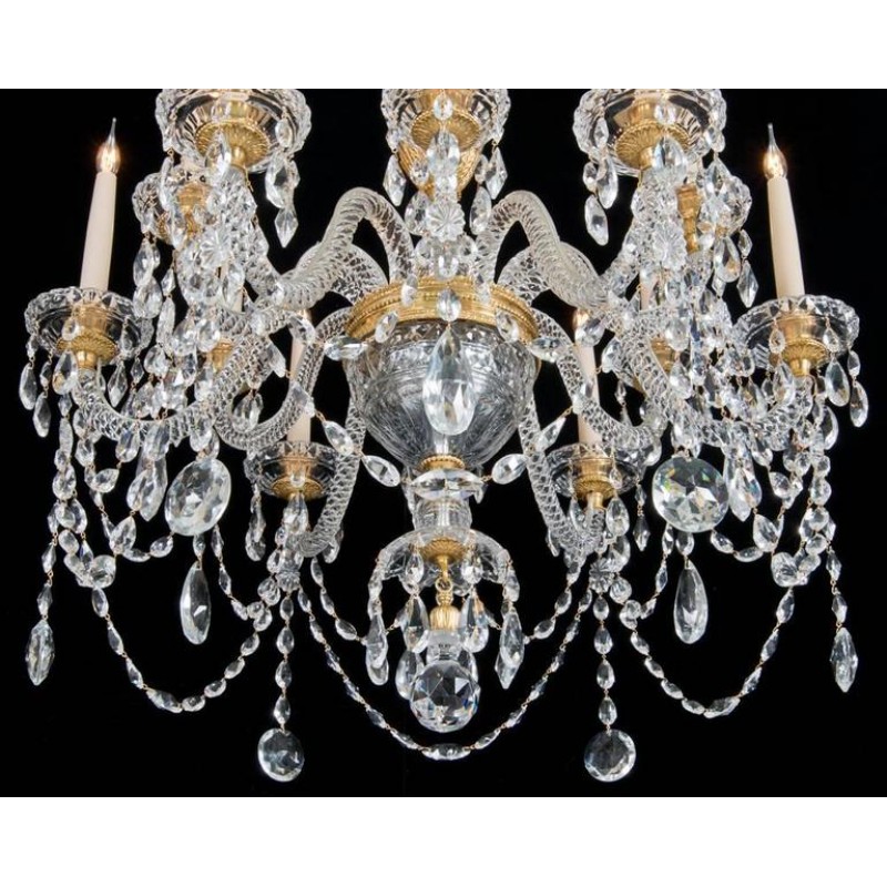 A fine quality twelve-light chandelier in the style of Perry & Co the ormolu-mounted and cut crystal shaft centered by an ormolu-mounted urn this surmounted with a double ormolu drop hung palm tree. The ormolu mounted receiver plate supporting twelve candle arms arranged on two levels these arms with finely chased ormolu mounts and diamond cut crystal drip pans. The diamond cut container with lower canopy and ormolu mounted lapidary cut crystal finial the chandelier richly draped with chain and finial pear shaped drops.