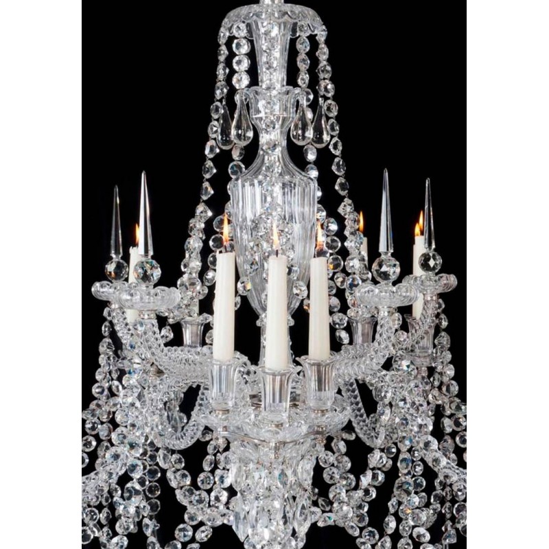 A fine quality cut glass fifteen-light chandelier the main baluster shaped shaft surmounted by a drop hung canopy and a draping pan with cascading drapery terminating at the back of the drip pans. The main flute cut receiver bowl with lower lapidary cut finial this receiver bowl surmounted by five rope twist candle arms these unusual spitting in the three lights these arms separated by five upper arms these with flute cut collars and tapered faceted ball spires. The chandelier of unusual type and richly draped with flat back spangles pear shaped finial drops all the finest quality.