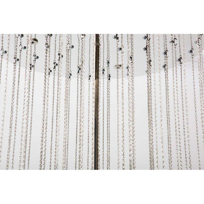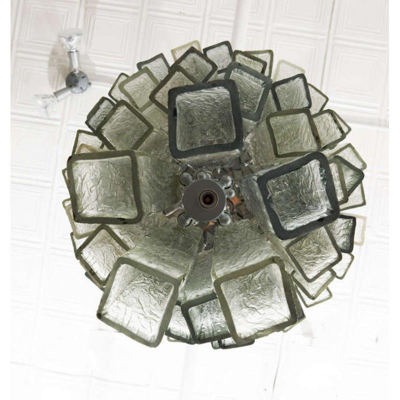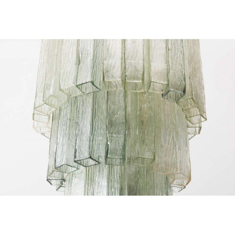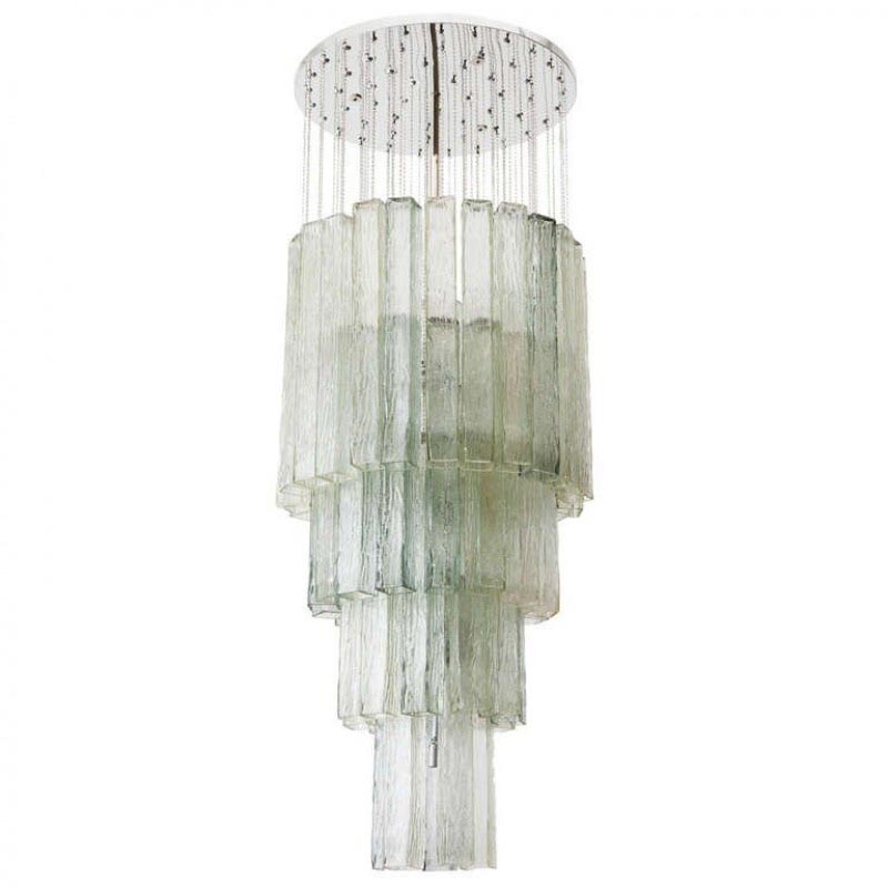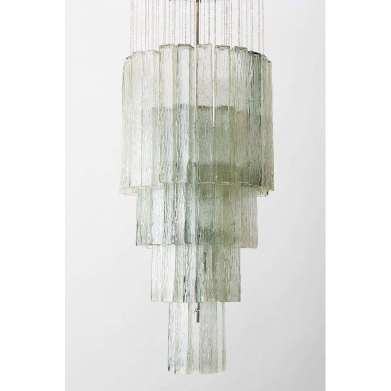 Beautiful Italian four-tier chandelier of glass tubes suspended from circular chrome ceiling cap with metal chain. Maximum wattage 40 W bulbs for 13 sockets.