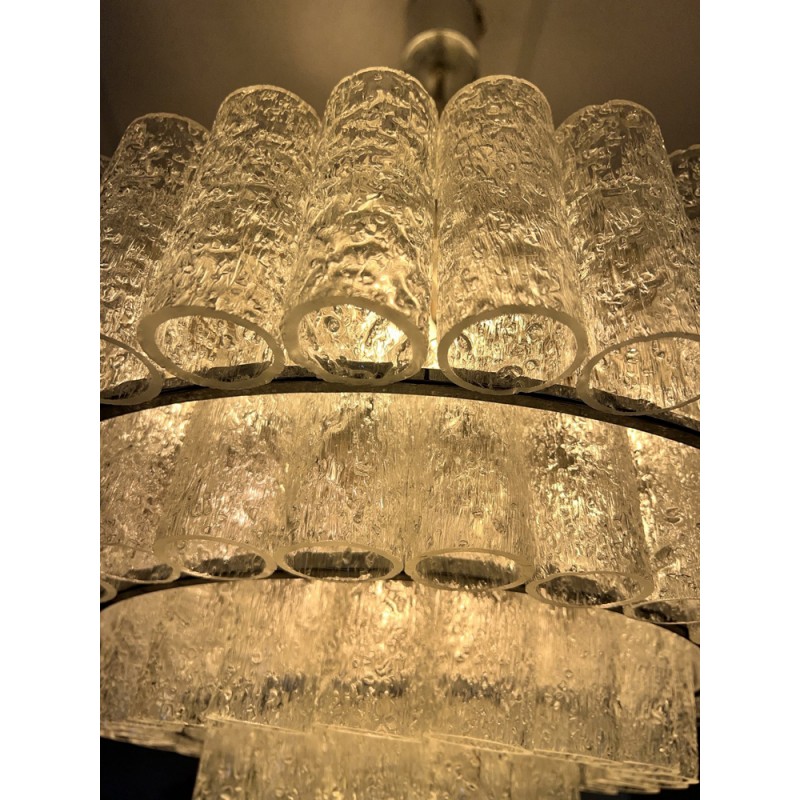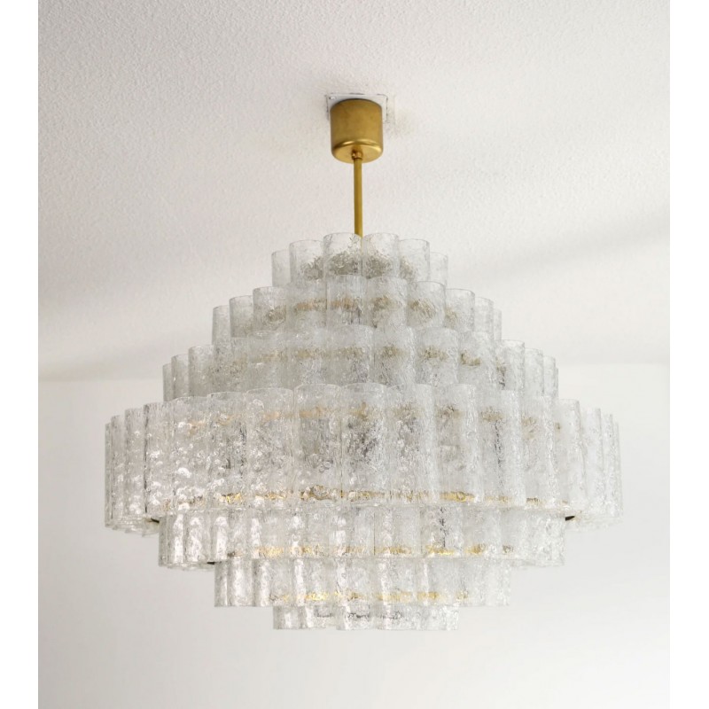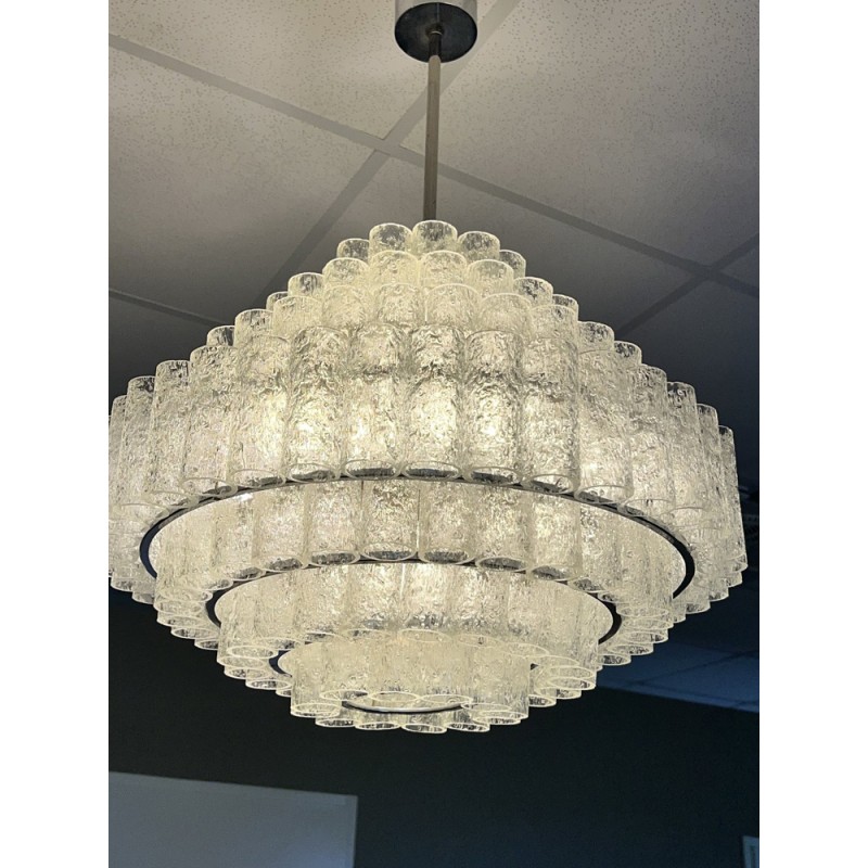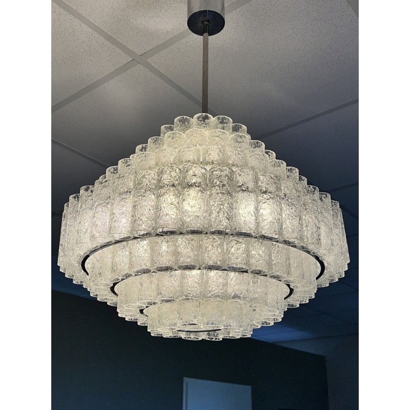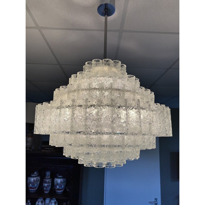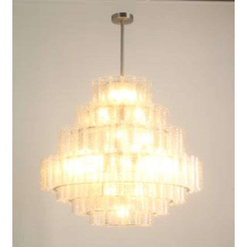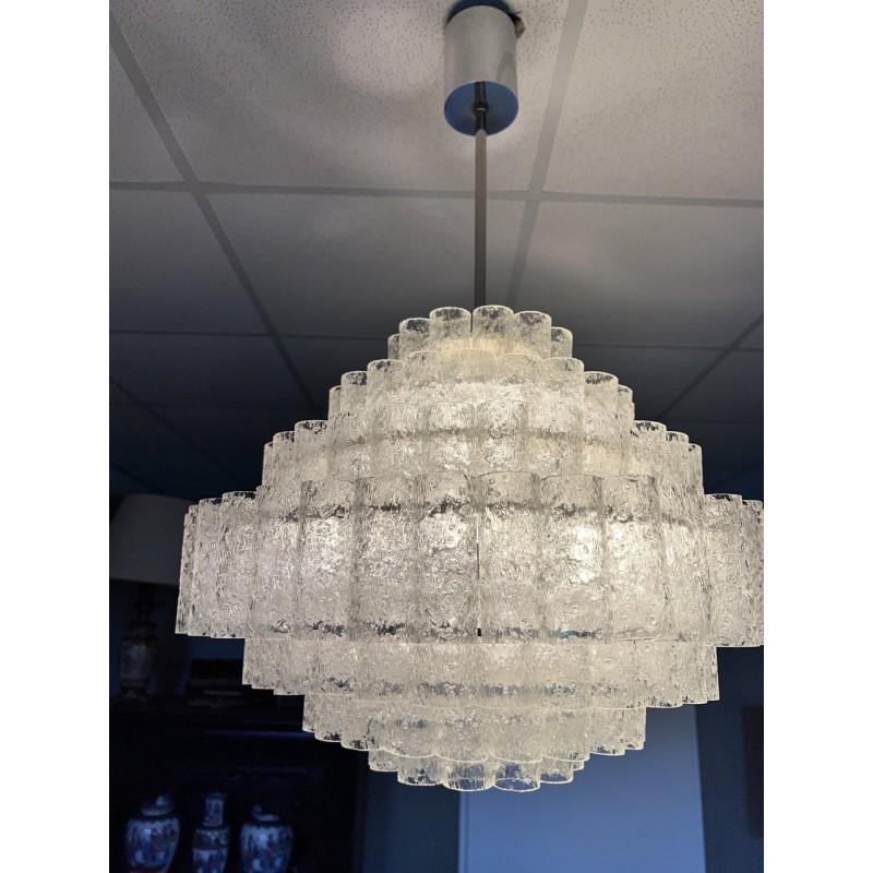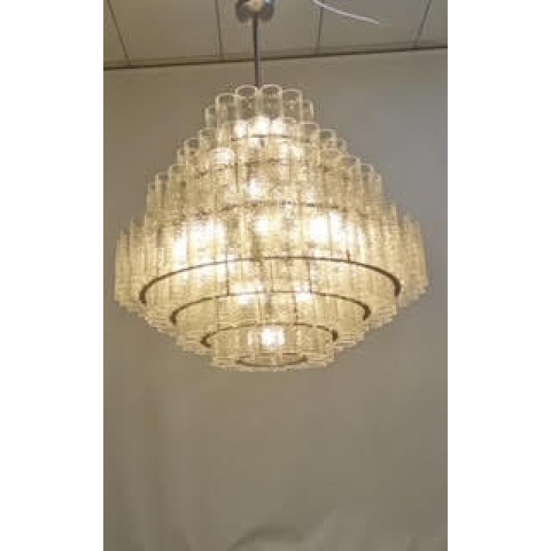 This stunning light is made up of seven tiers of molded, frosted glass cylinders mounted on a brass frame arranged in concentric rings. As artistic as it is elegant, this chandelier makes a dignified statement. This beautiful piece is adorned by gorgeous clear tubular Venetian glass pieces gorgeously laid out over every inch of the piece in a rectangular tiered fashion. It's fully supported by a chrome mirror finished base and is available in three to six tiers. Its high-end luxury appeal and meld of sensational “Venini” style glass pieces make it a stunning fixture to treasure in your venue, home, or wherever it's placed.