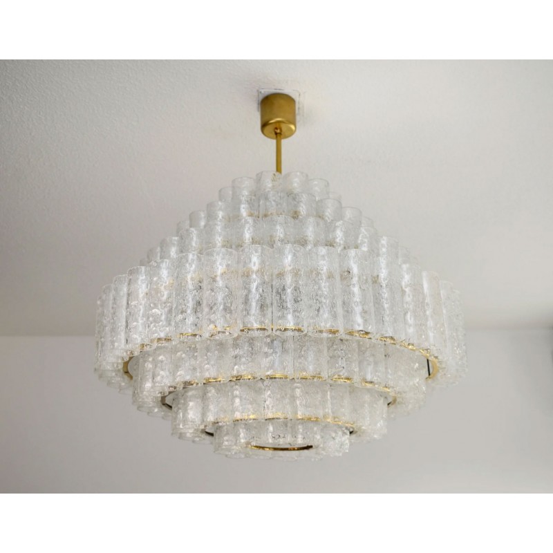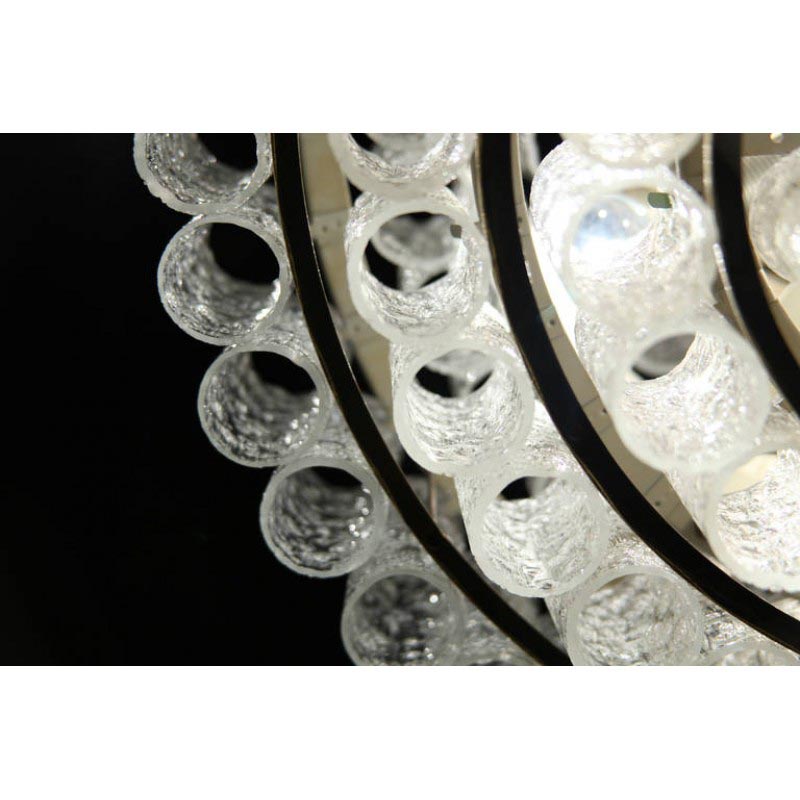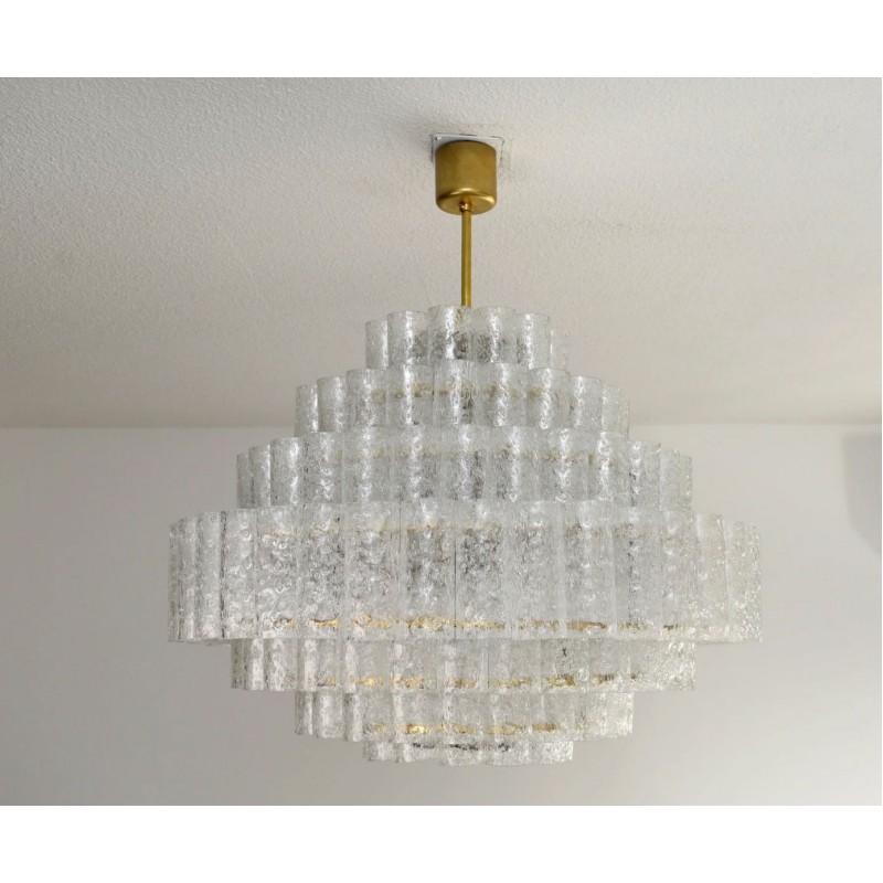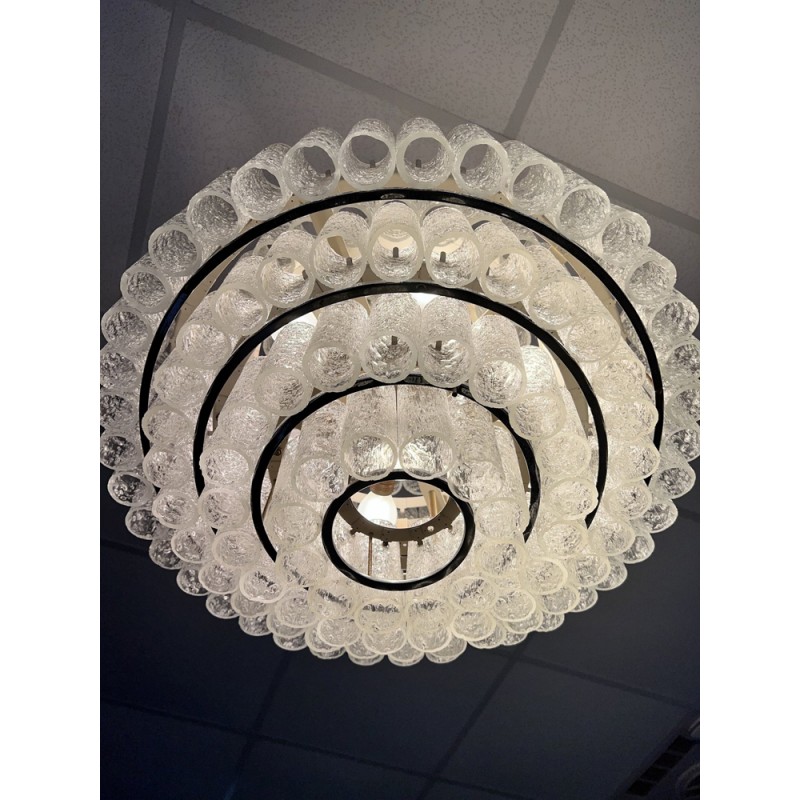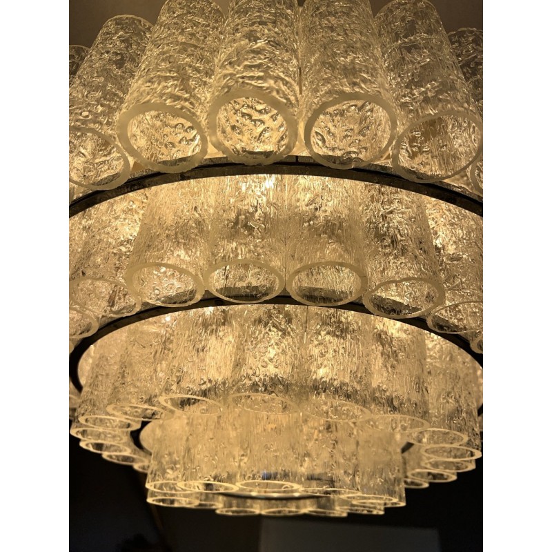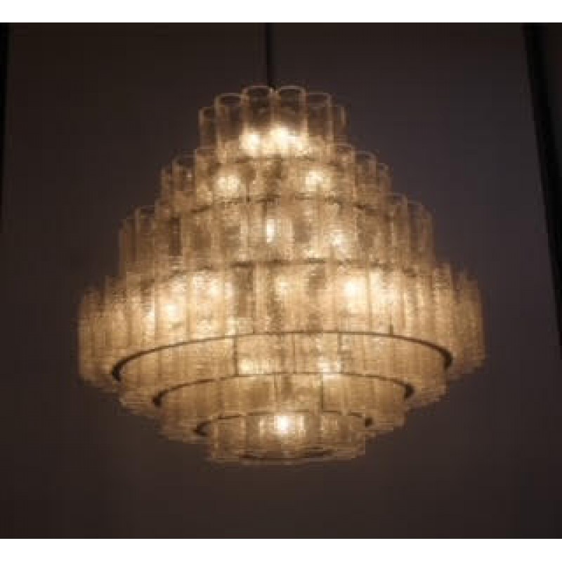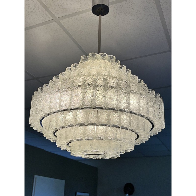 This stunning light is made up of seven tiers of molded, frosted glass cylinders mounted on a brass frame arranged in concentric rings. As artistic as it is elegant, this chandelier makes a dignified statement. This beautiful piece is adorned by gorgeous clear tubular Venetian glass pieces gorgeously laid out over every inch of the piece in a rectangular tiered fashion. It's fully supported by a chrome mirror finished base and is available in three to six tiers. Its high-end luxury appeal and meld of sensational “Venini” style glass pieces make it a stunning fixture to treasure in your venue, home, or wherever it's placed.
