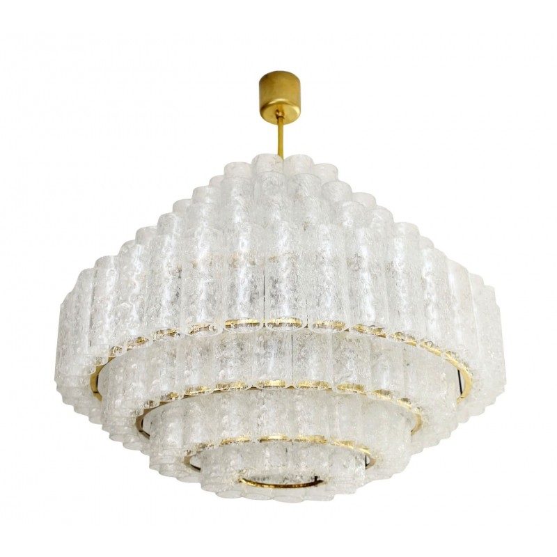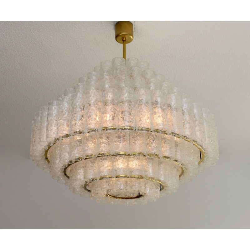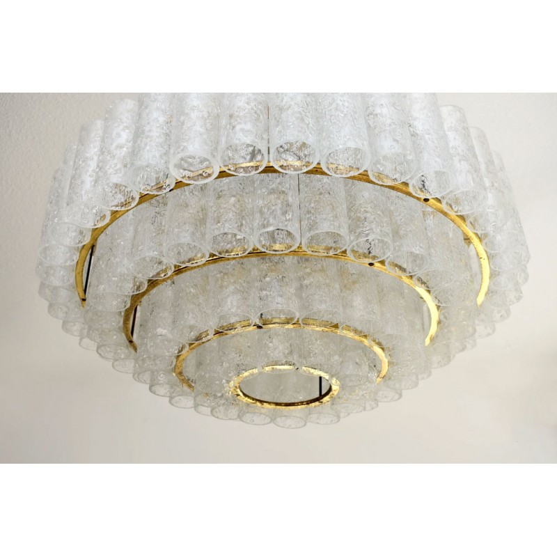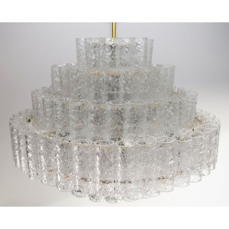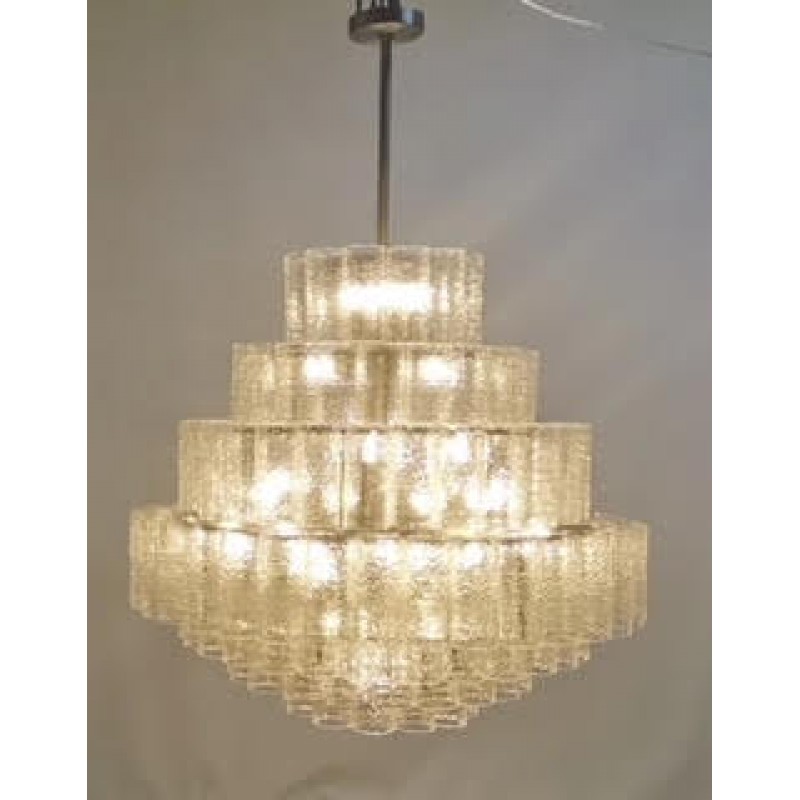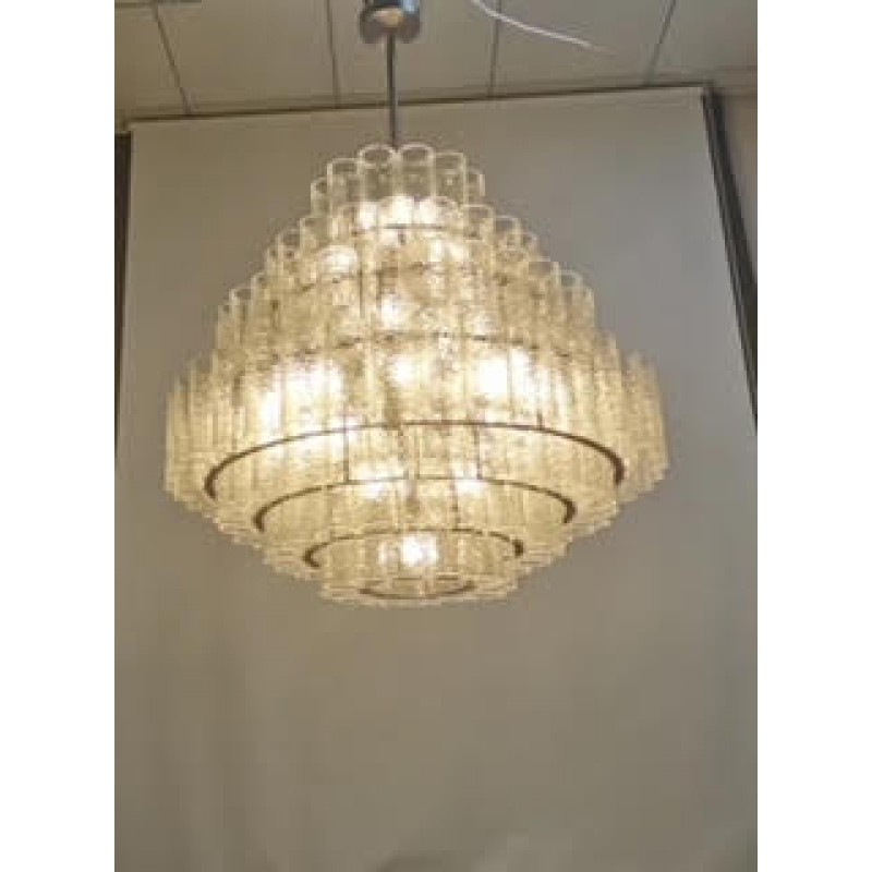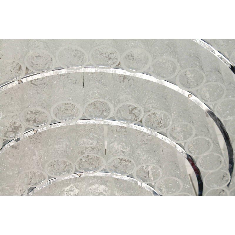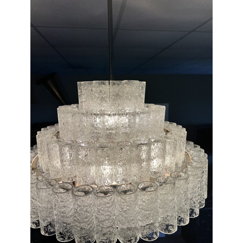 This stunning light is made up of seven tiers of molded, frosted glass cylinders mounted on a brass frame arranged in concentric rings. As artistic as it is elegant, this chandelier makes a dignified statement. This beautiful piece is adorned by gorgeous clear tubular Venetian glass pieces gorgeously laid out over every inch of the piece in a rectangular tiered fashion. It's fully supported by a chrome mirror finished base and is available in three to six tiers. Its high-end luxury appeal and meld of sensational “Venini” style glass pieces make it a stunning fixture to treasure in your venue, home, or wherever it's placed.