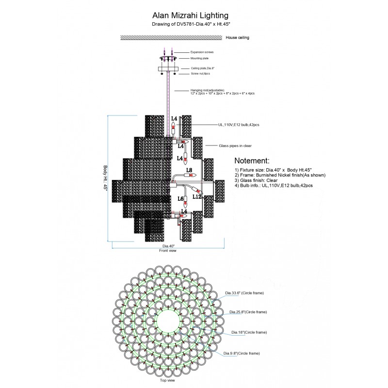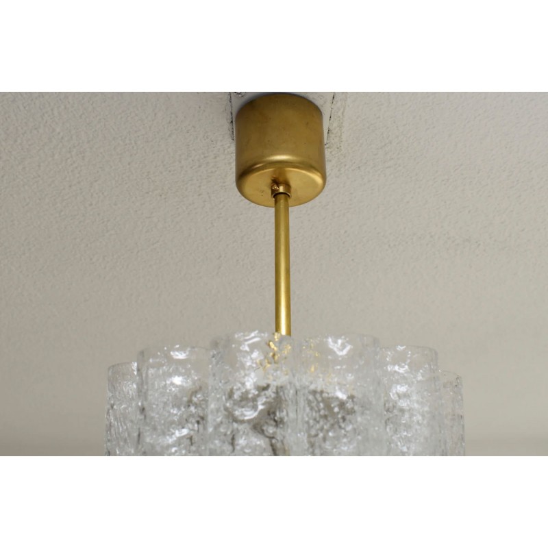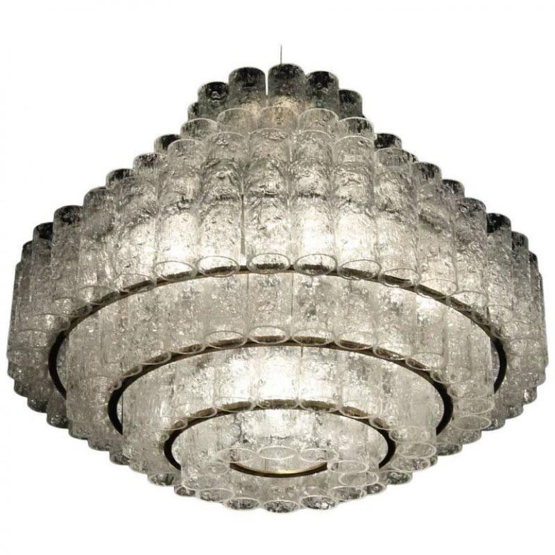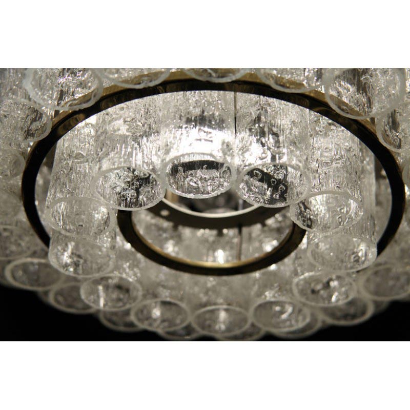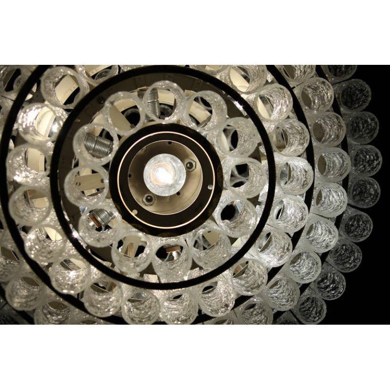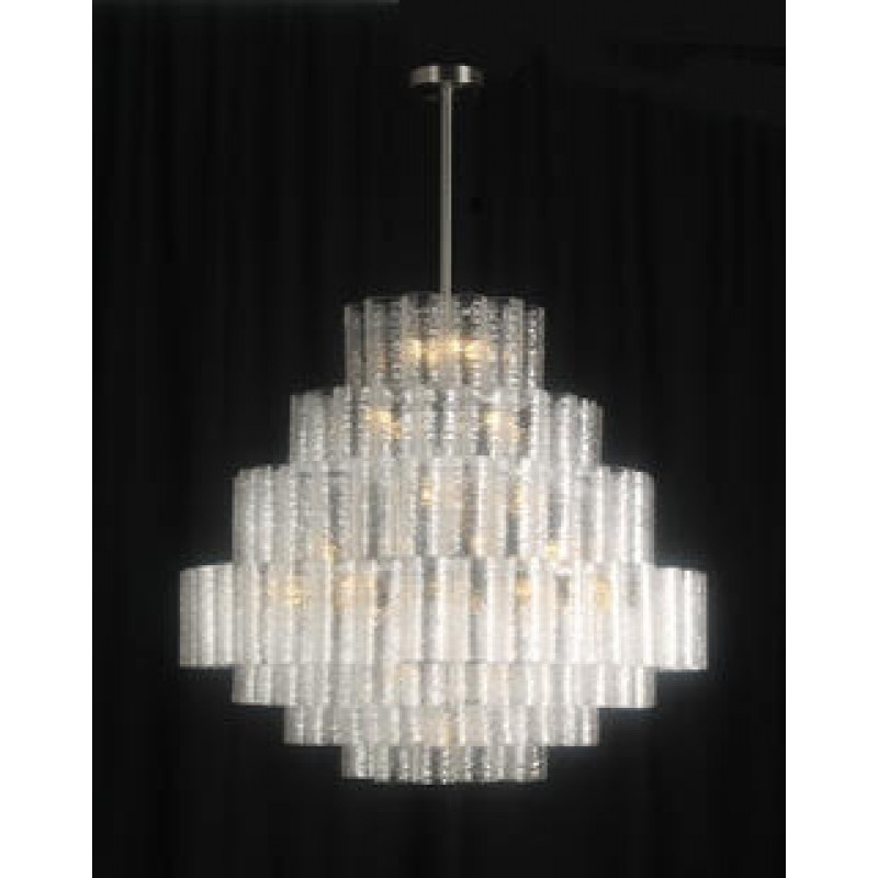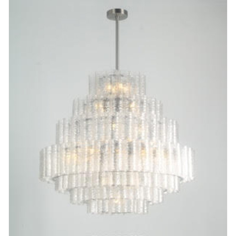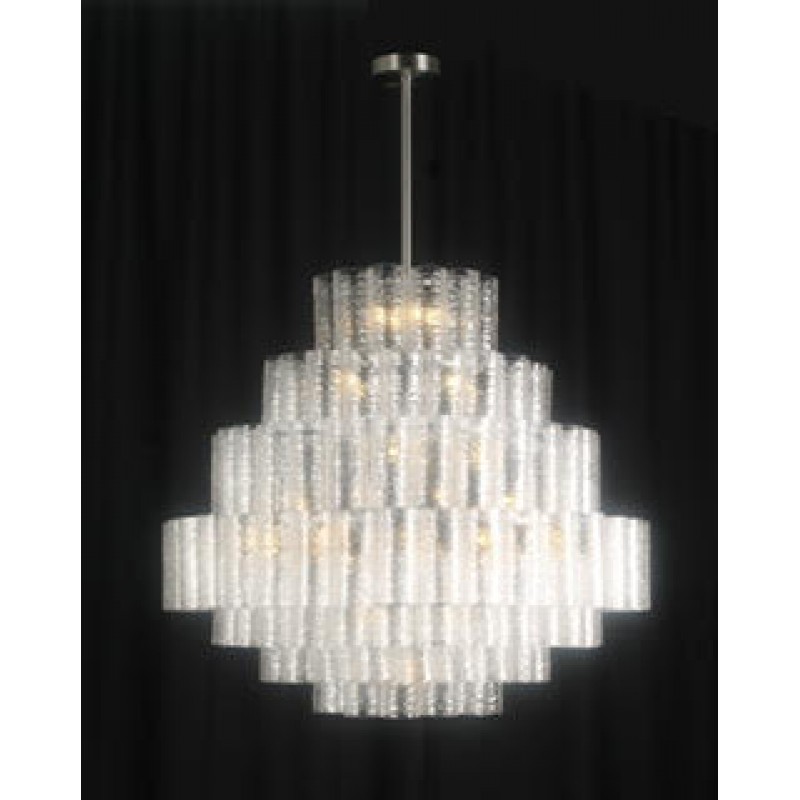 This stunning light is made up of seven tiers of molded, frosted glass cylinders mounted on a brass frame arranged in concentric rings. As artistic as it is elegant, this chandelier makes a dignified statement. This beautiful piece is adorned by gorgeous clear tubular Venetian glass pieces gorgeously laid out over every inch of the piece in a rectangular tiered fashion. It's fully supported by a chrome mirror finished base and is available in three to six tiers. Its high-end luxury appeal and meld of sensational “Venini” style glass pieces make it a stunning fixture to treasure in your venue, home, or wherever it's placed.