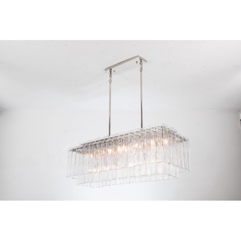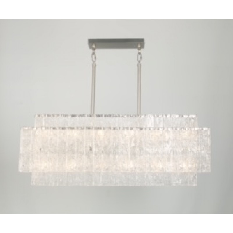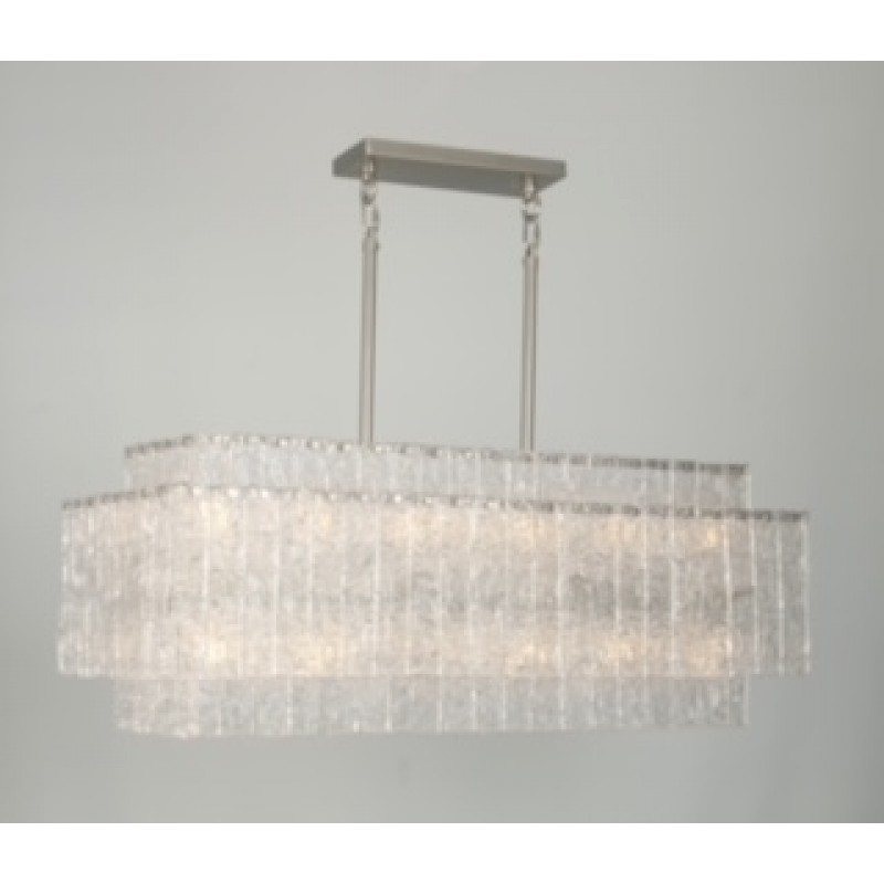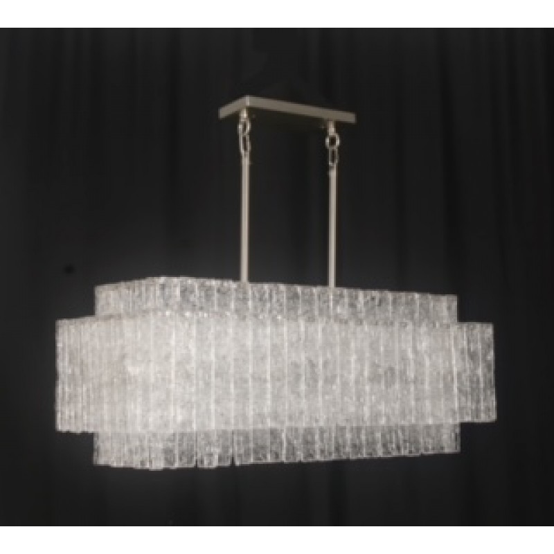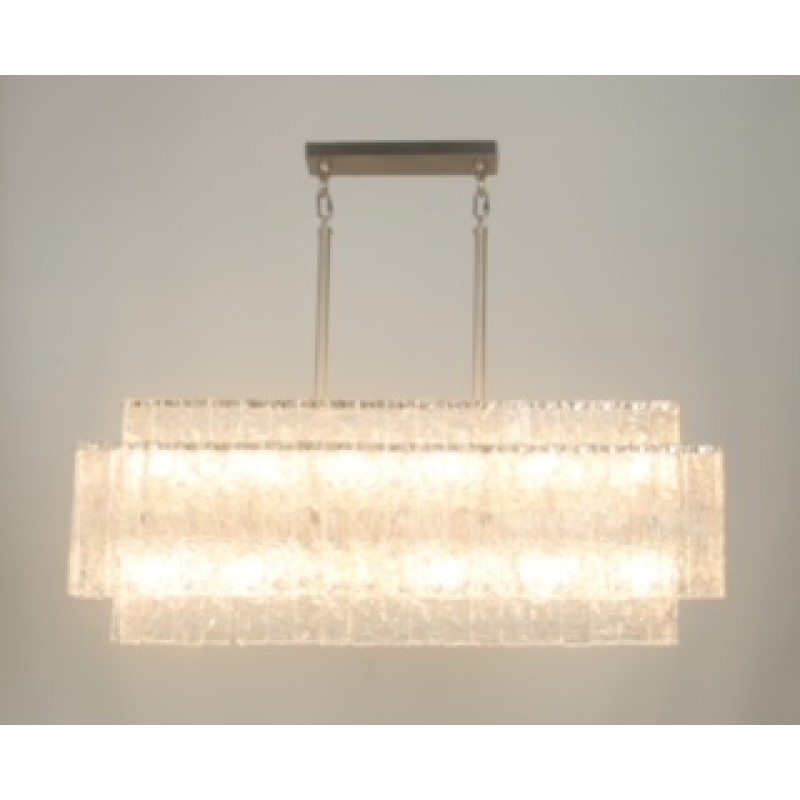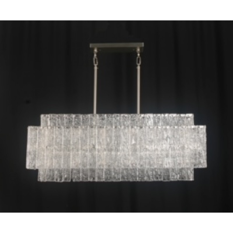 The Symphonia tiered rectangular glass chandelier has 14 lights behind clear, textured glass, creating a glamorous and luxurious focal point in the room, whether lit or not. Brushed nickel accents on the ceiling canopy and hanging rods accentuate the sparkle as they reflect the light. At Alan Mizrahi Lighting Design, we supply and manufacture many highly sought after designer pieces. All Chandeliers can be customized by number of lights, style, color and size to meet your specific needs. Every chandelier can also be combined with a matching table lamp and wall lamp to accomplish the best room design. Our company provides collections that can make all your project dreams come true.