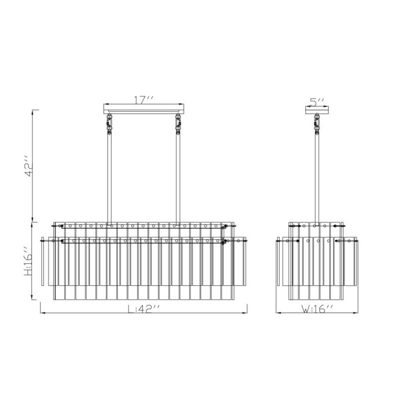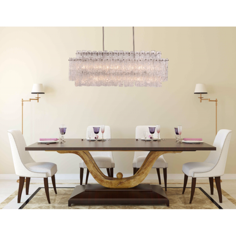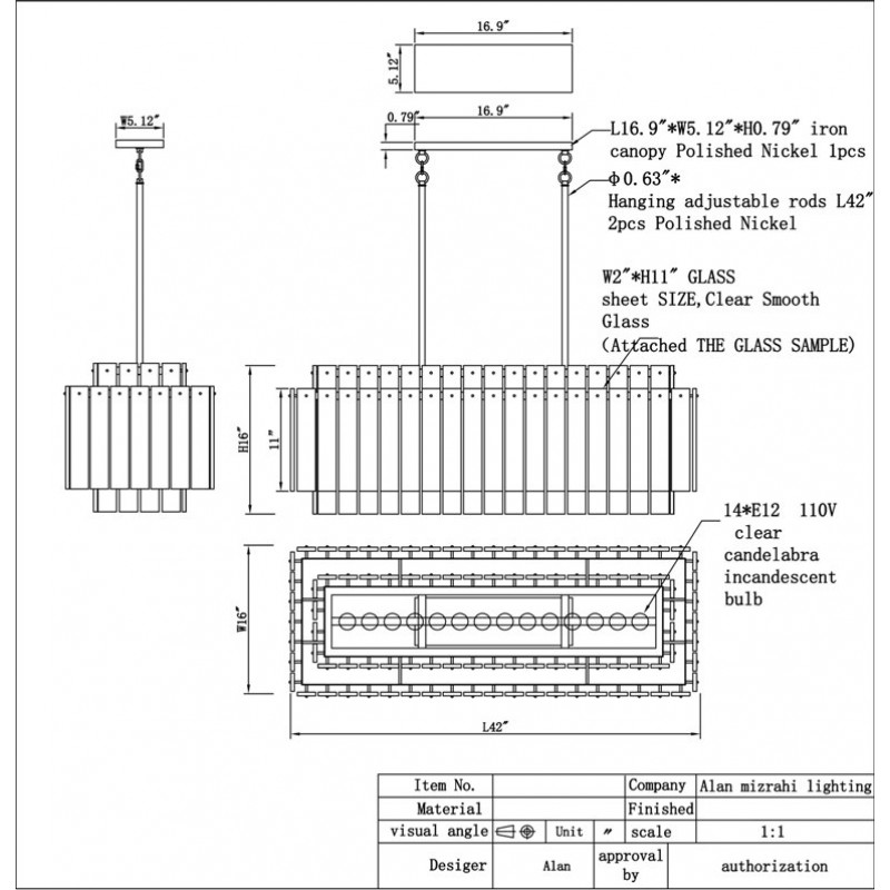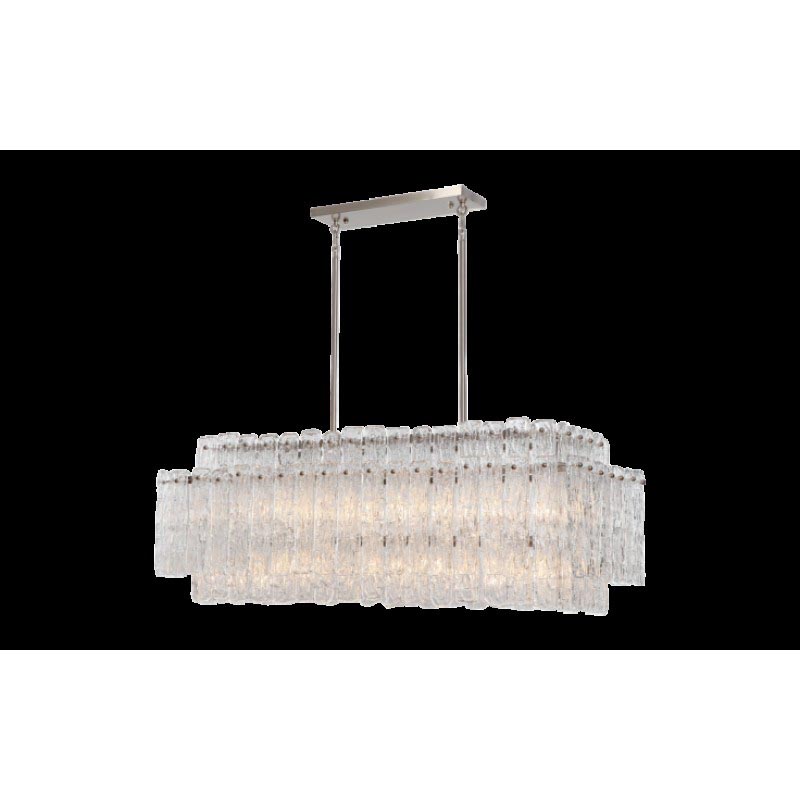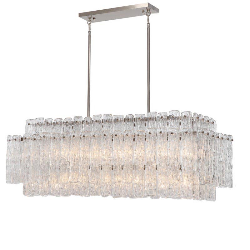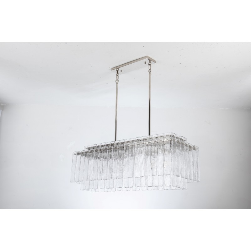The Symphonia tiered rectangular glass chandelier has 14 lights behind clear, textured glass, creating a glamorous and luxurious focal point in the room, whether lit or not. Brushed nickel accents on the ceiling canopy and hanging rods accentuate the sparkle as they reflect the light. At Alan Mizrahi Lighting Design, we supply and manufacture many highly sought after designer pieces. All Chandeliers can be customized by number of lights, style, color and size to meet your specific needs. Every chandelier can also be combined with a matching table lamp and wall lamp to accomplish the best room design. Our company provides collections that can make all your project dreams come true.