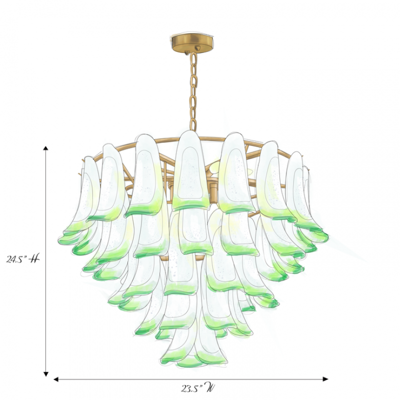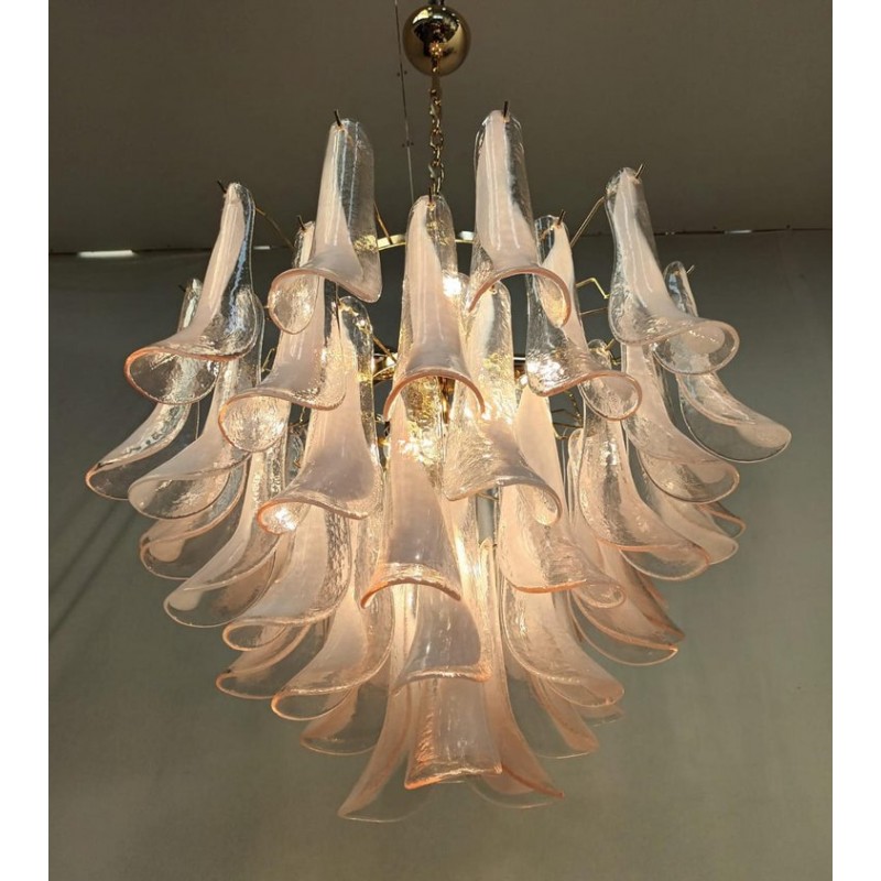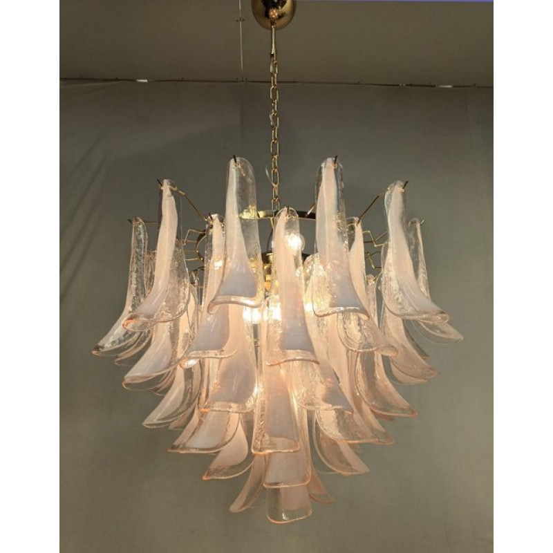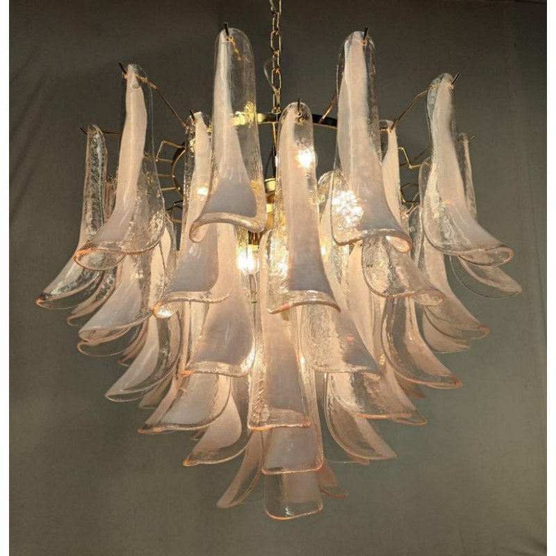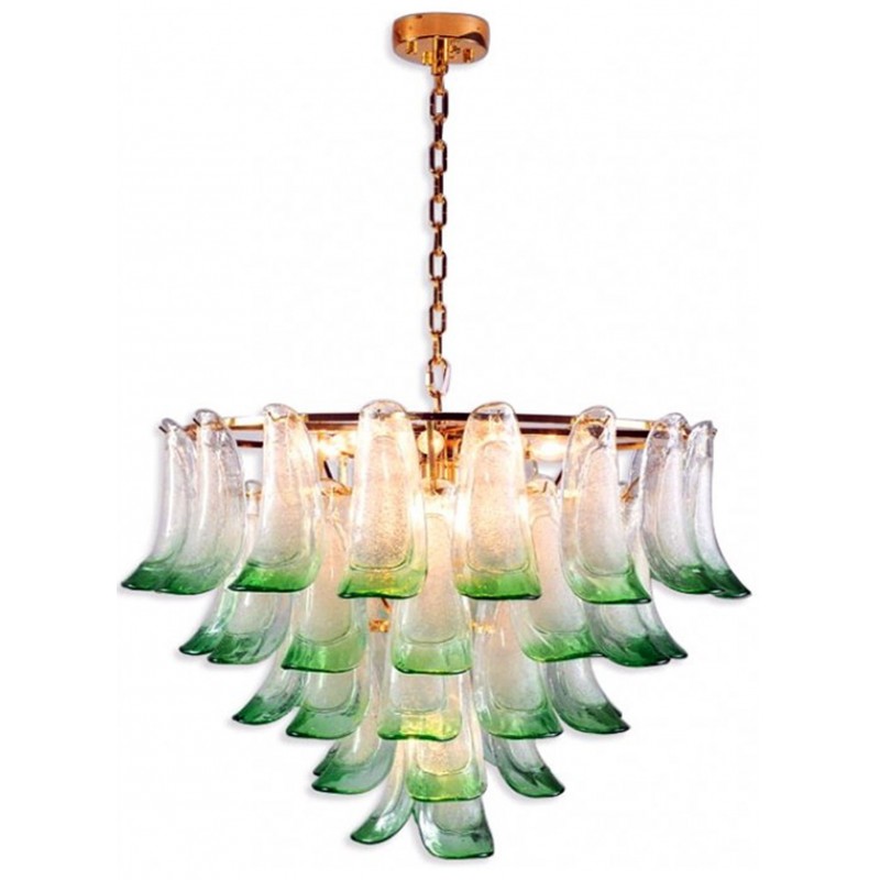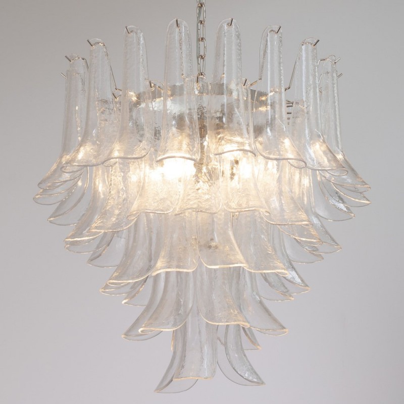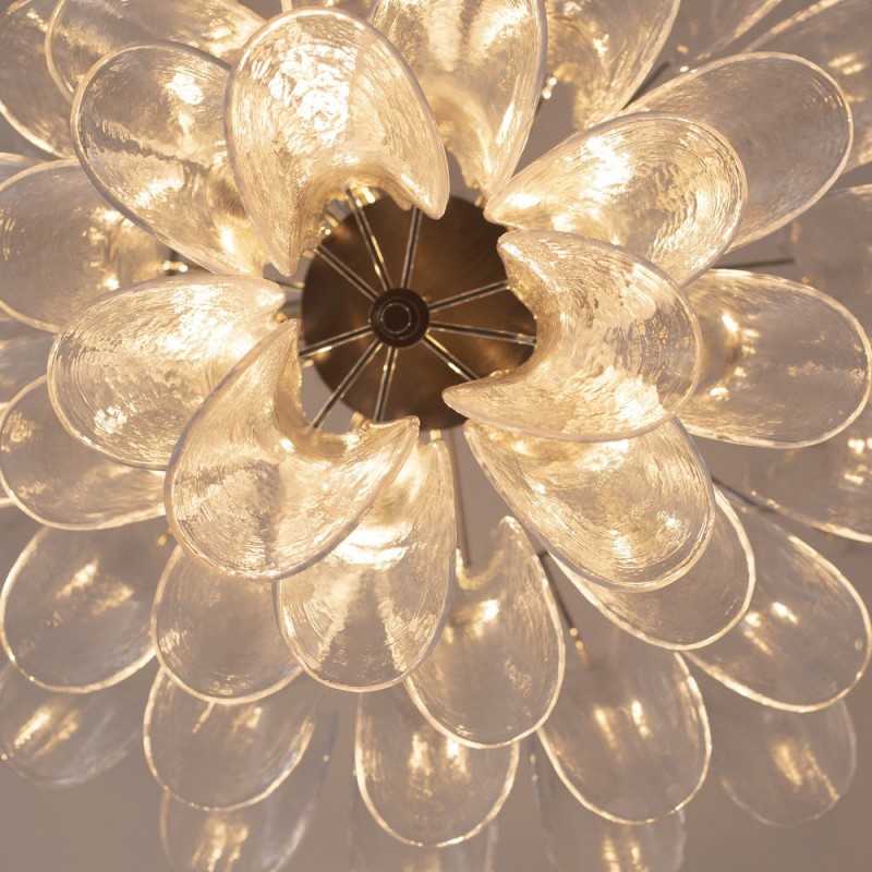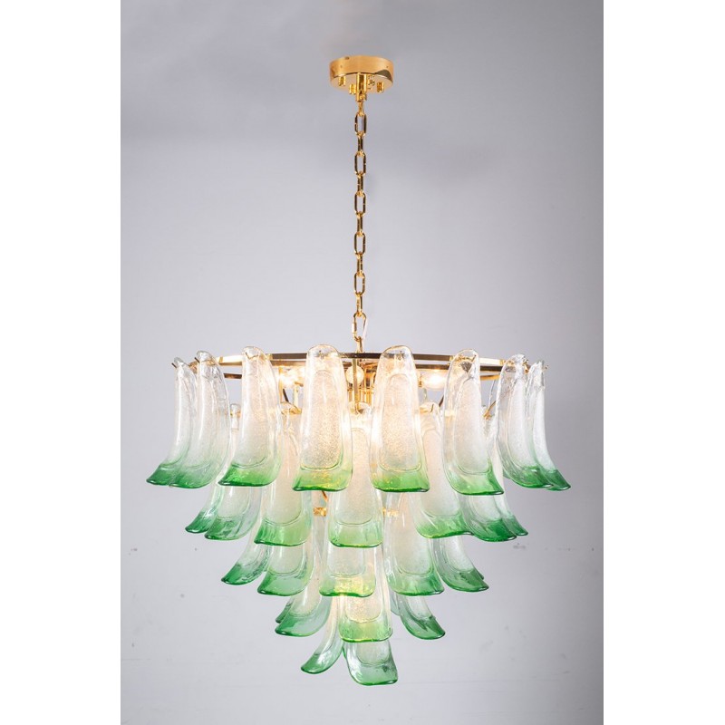 A maximalist chandelier with ombre-painted glass and a delicate, blooming design. Marielle's mid-century petal chandelier marries the best of grand nouveau lighting and maximalism in interior design. The gold chrome on this unique chandelier frame completes this truly stand-out piece. This waterfall chandelier made with faux Murano glass takes your home to the next level. A decorative light fixture with an elegant floral shape accentuates your transitional interior design into a beautiful modern house. This unique chandelier is a masterpiece as a dining room light fixture, lounge or living room ceiling light.