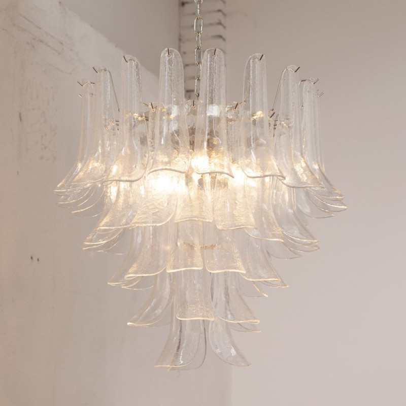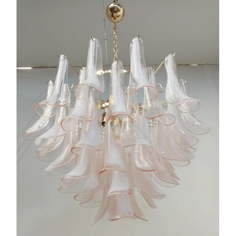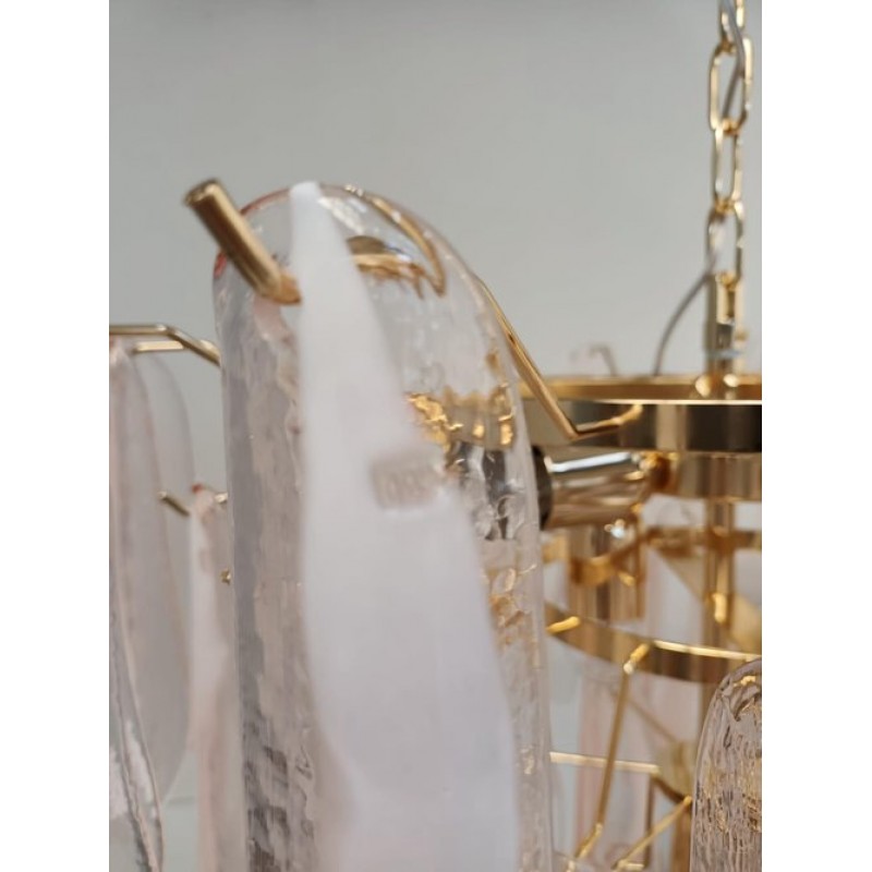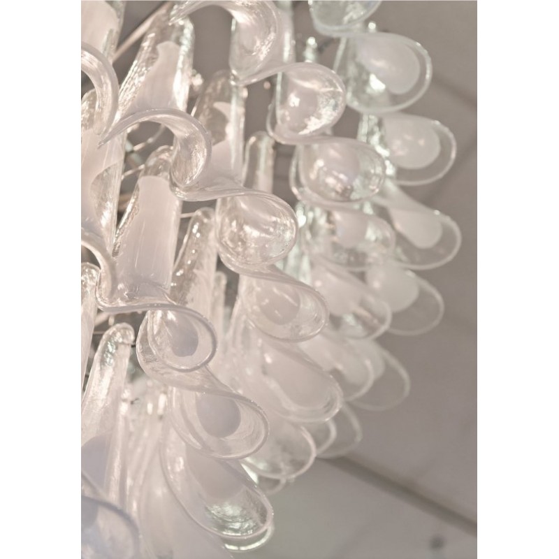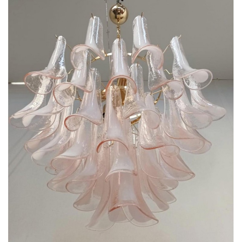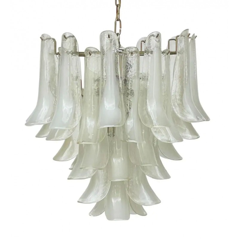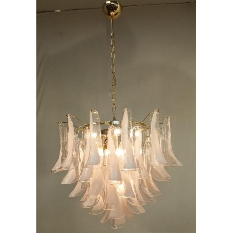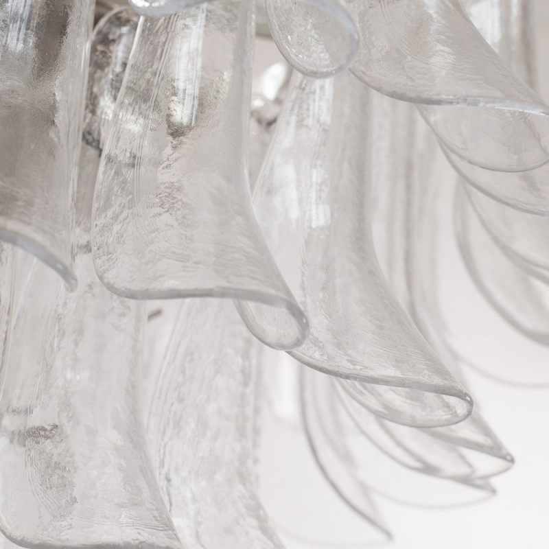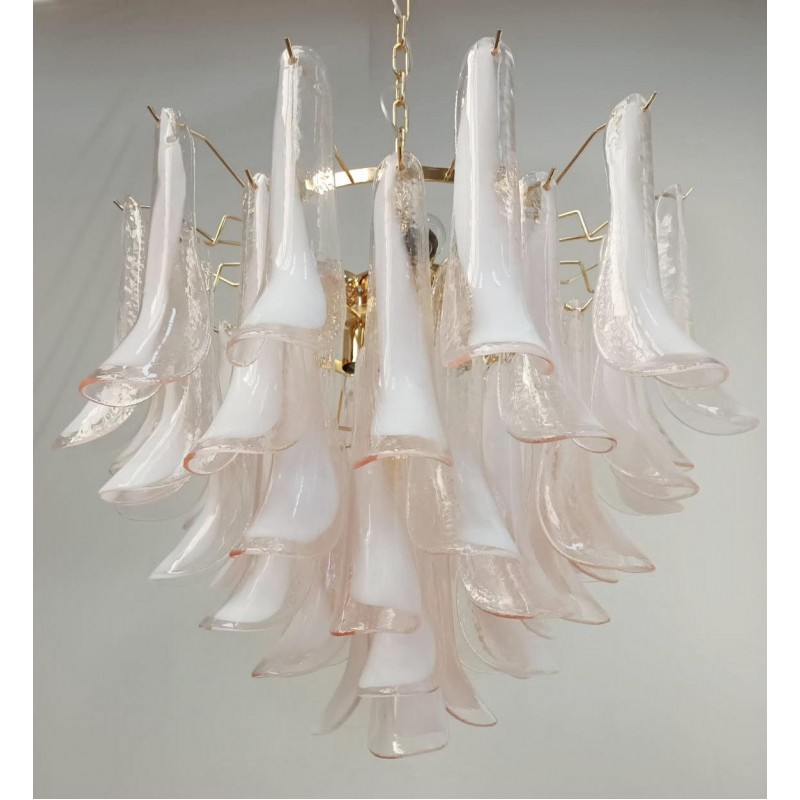 A maximalist chandelier with ombre-painted glass and a delicate, blooming design. Marielle's mid-century petal chandelier marries the best of grand nouveau lighting and maximalism in interior design. The gold chrome on this unique chandelier frame completes this truly stand-out piece. This waterfall chandelier made with faux Murano glass takes your home to the next level. A decorative light fixture with an elegant floral shape accentuates your transitional interior design into a beautiful modern house. This unique chandelier is a masterpiece as a dining room light fixture, lounge or living room ceiling light.