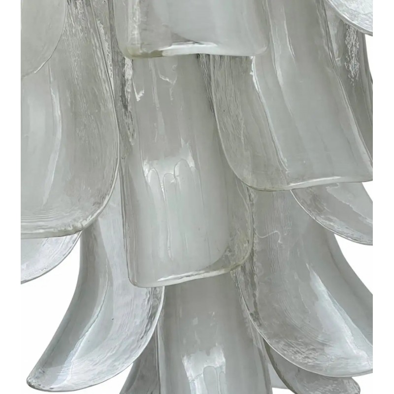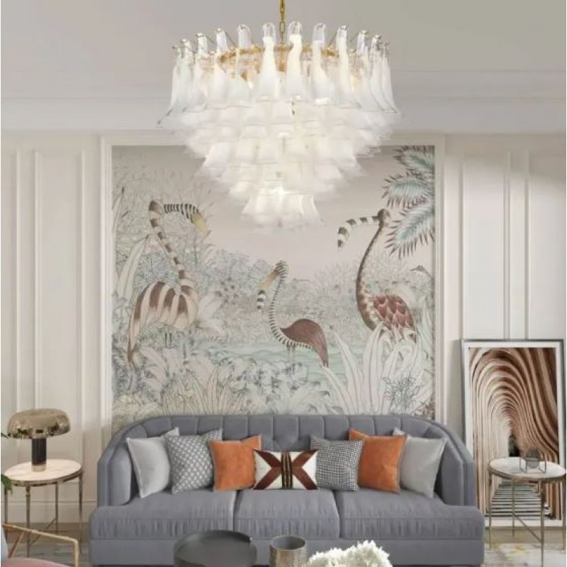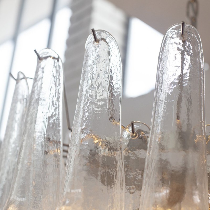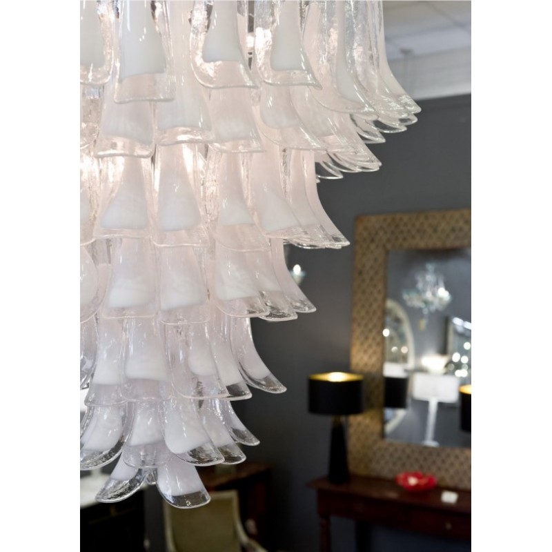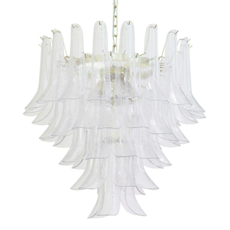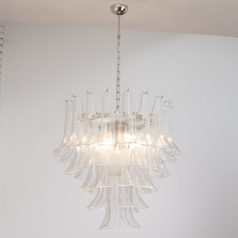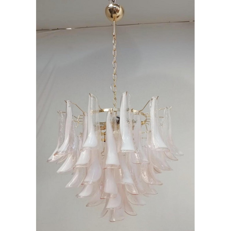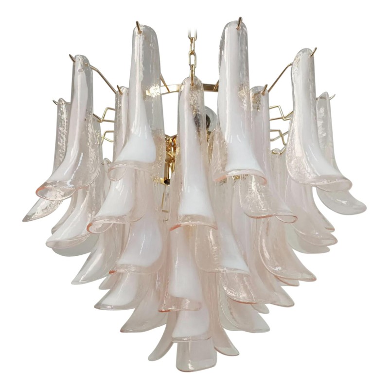 A maximalist chandelier with ombre-painted glass and a delicate, blooming design. Marielle's mid-century petal chandelier marries the best of grand nouveau lighting and maximalism in interior design. The gold chrome on this unique chandelier frame completes this truly stand-out piece. This waterfall chandelier made with faux Murano glass takes your home to the next level. A decorative light fixture with an elegant floral shape accentuates your transitional interior design into a beautiful modern house. This unique chandelier is a masterpiece as a dining room light fixture, lounge or living room ceiling light.