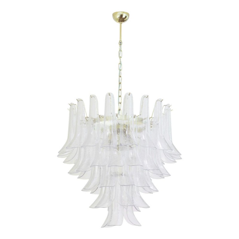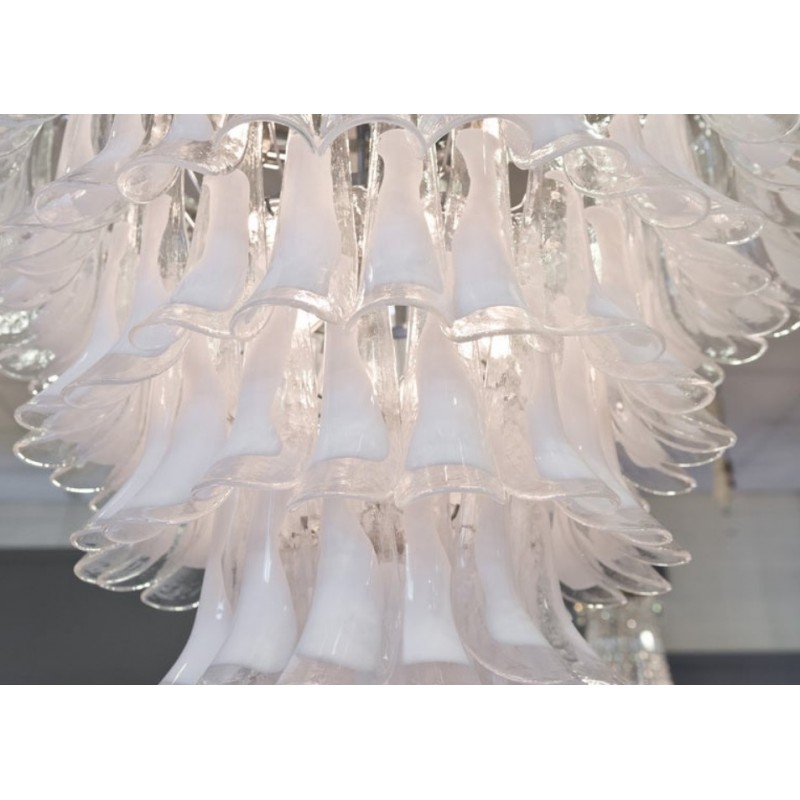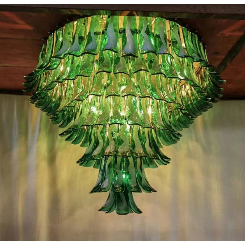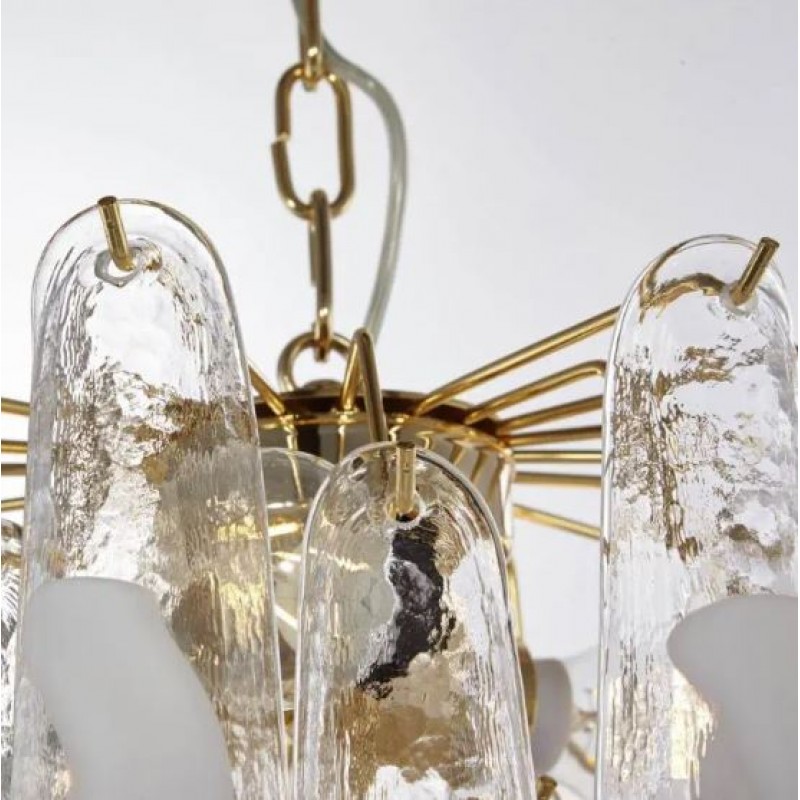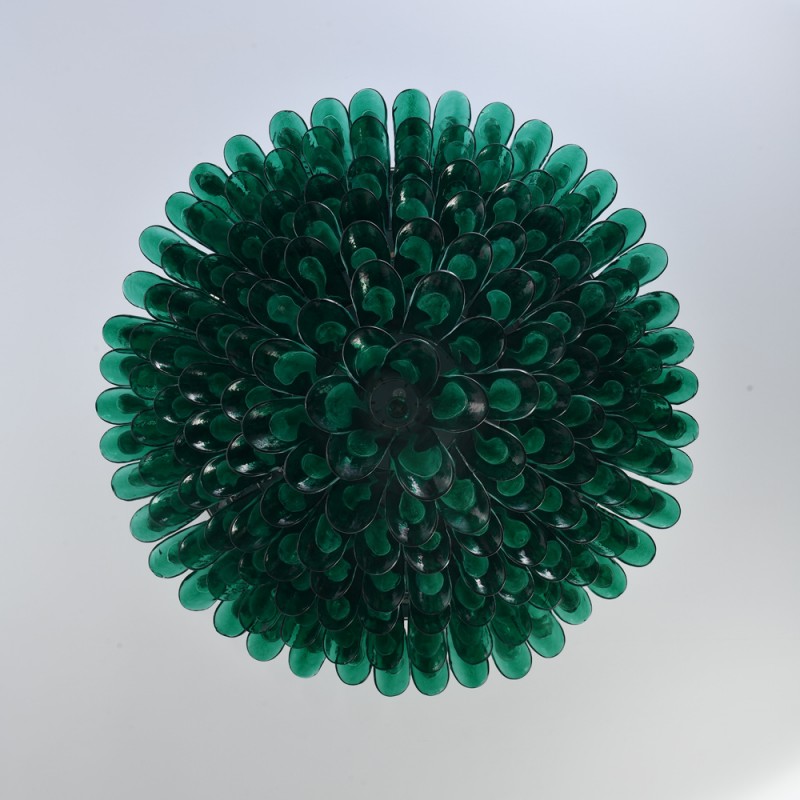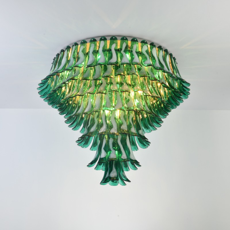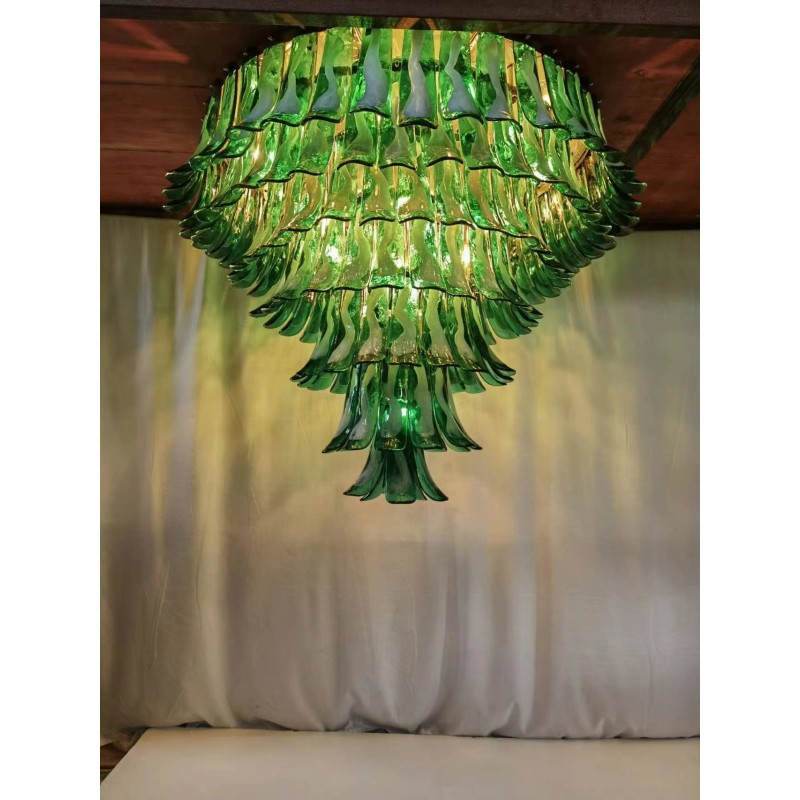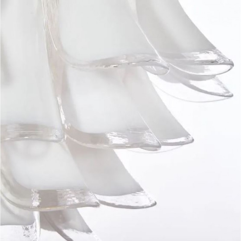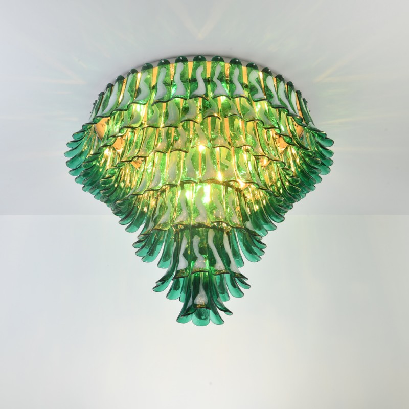 A maximalist chandelier with ombre-painted glass and a delicate, blooming design. Marielle's mid-century petal chandelier marries the best of grand nouveau lighting and maximalism in interior design. The gold chrome on this unique chandelier frame completes this truly stand-out piece. This waterfall chandelier made with faux Murano glass takes your home to the next level. A decorative light fixture with an elegant floral shape accentuates your transitional interior design into a beautiful modern house. This unique chandelier is a masterpiece as a dining room light fixture, lounge or living room ceiling light.