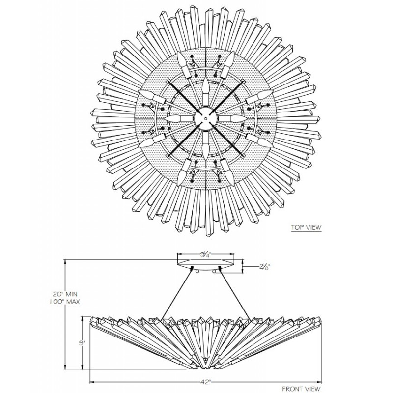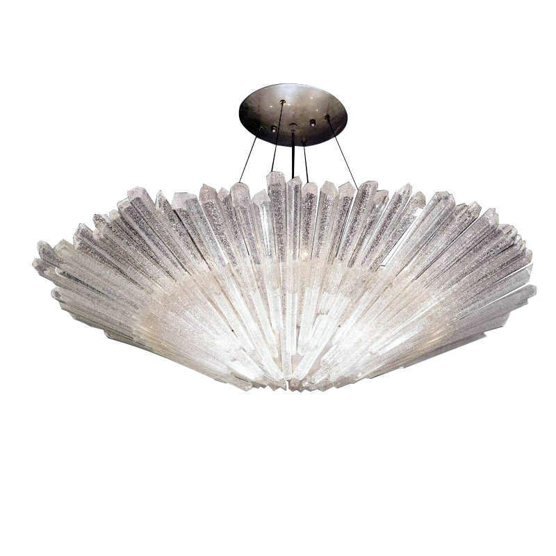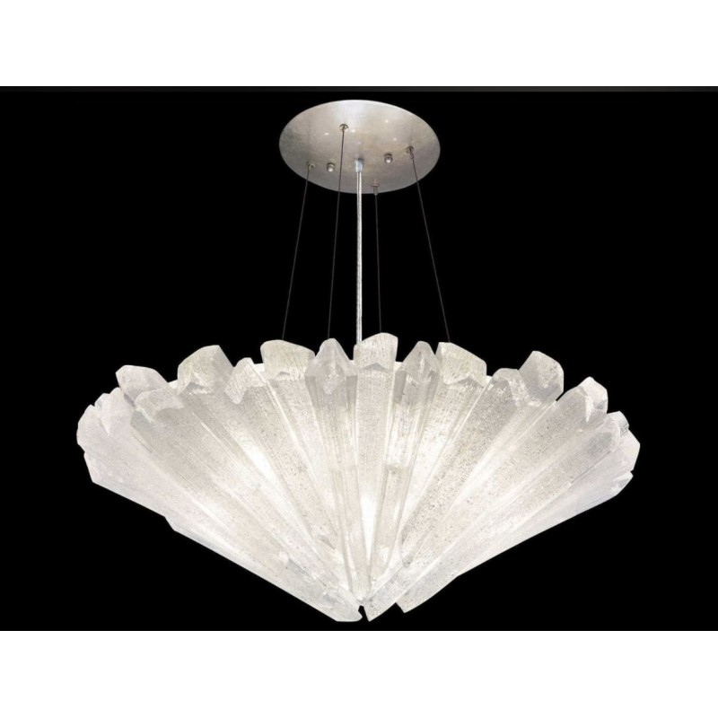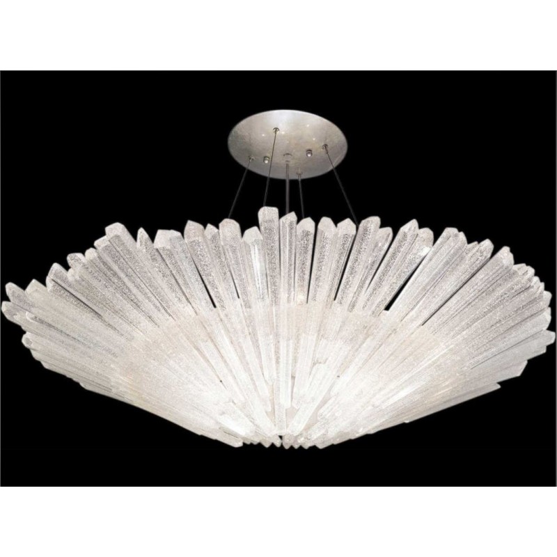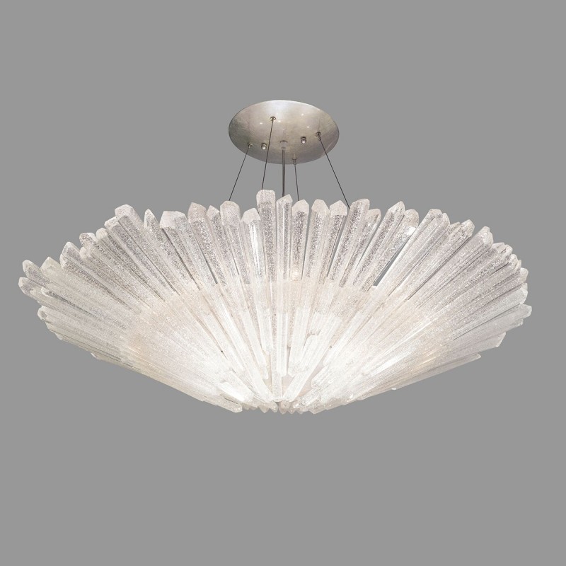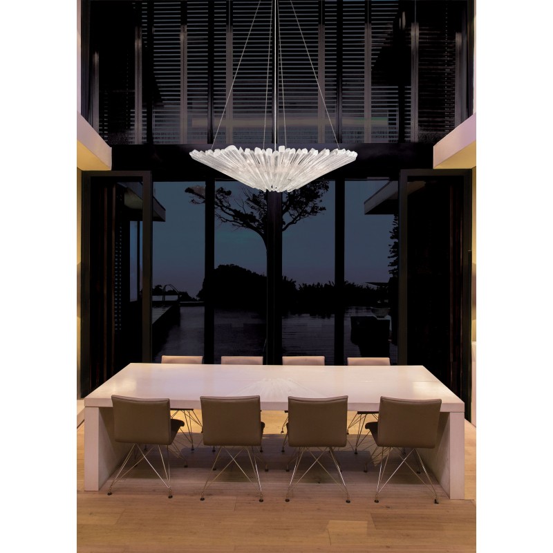 DIAMANTINA is a gem-like old hilltop village in Brazil famed for quartz crystal clusters considered since ancient times to have cosmic connections and psychic healing powers. Building on glass techniques over 2000 years old, and using the core element of natural quartz, the spires are worked by hand at over 2000 degrees. The raw crystal spires are then rough cut and hand polished to expose the inner core to light. As in the natural world, each piece is distinctly unique. All are lit with a state-of-the-art high efficacy dimmable LED, except for the inverted parasol, which contains a dozen incandescent candelabra lights. The effect of all when lit is wonderful. At Alan Mizrahi Lighting Design, we supply and manufacture many highly sought after designer pieces. All Chandeliers can be customized by a number of lights, style, color, and size to meet your specific needs.