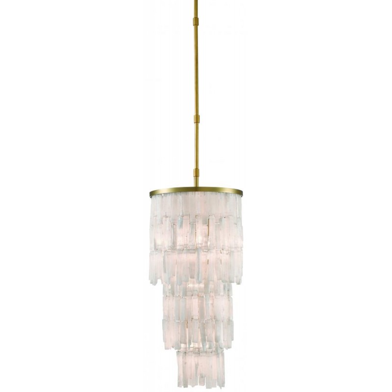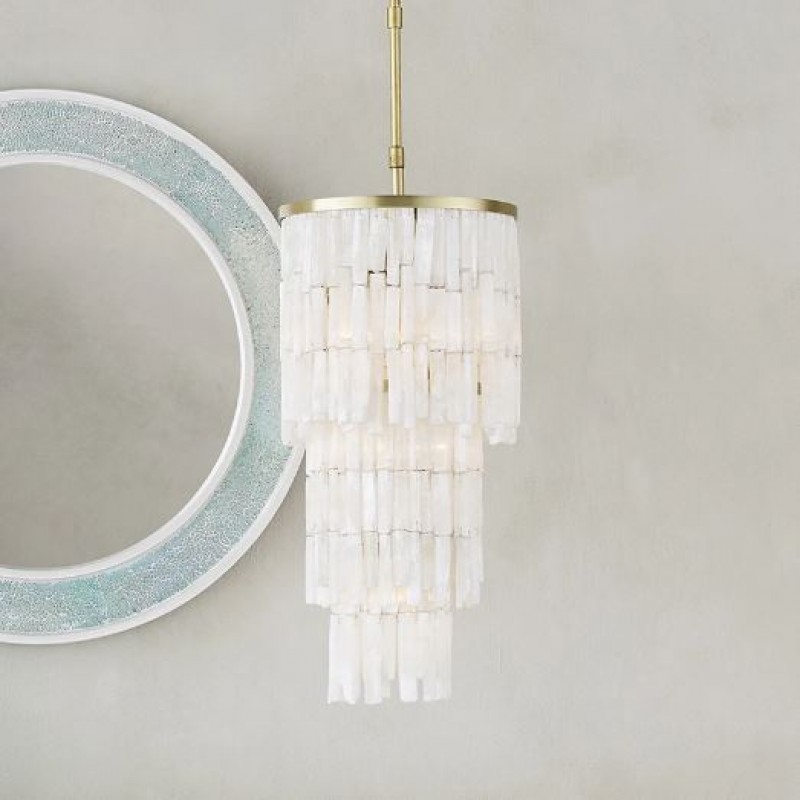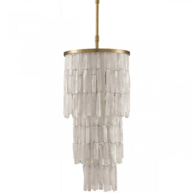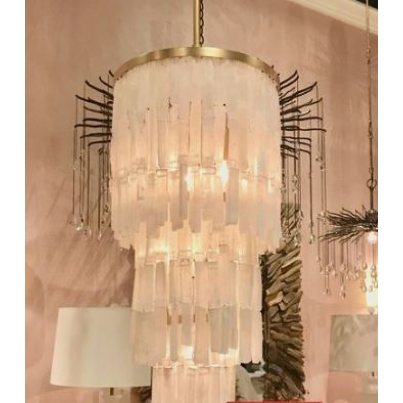 Long irregular pieces of Selenite dangle from a metal shade in an antique brass finish, the crystalline minerals effervescing when the light is switched on. Even when it is not lit, this chandelier is a luminous decorative accent. Because our lighting pieces are made by a workforce that still relies on traditional working methods, each product is unique and carries with it the sensitivity of the artisan. Attract attention, provoke emotion and inspire the imagination with games of light and matter. Such as the ambition and the creative spark of the existing elements of the space.