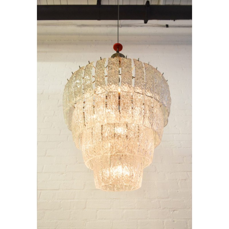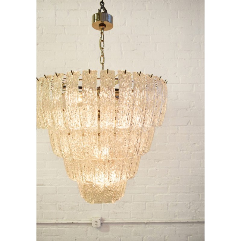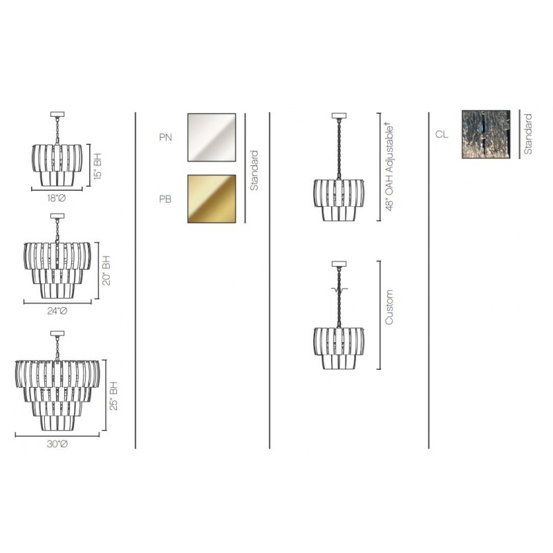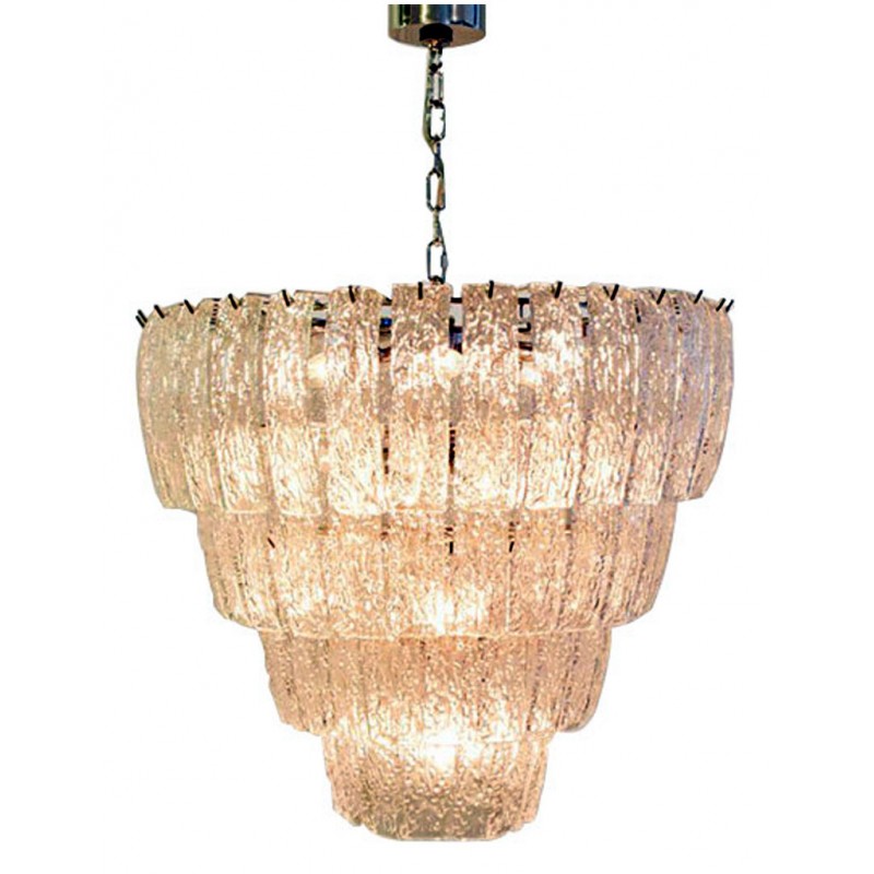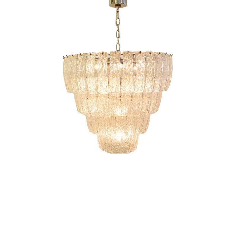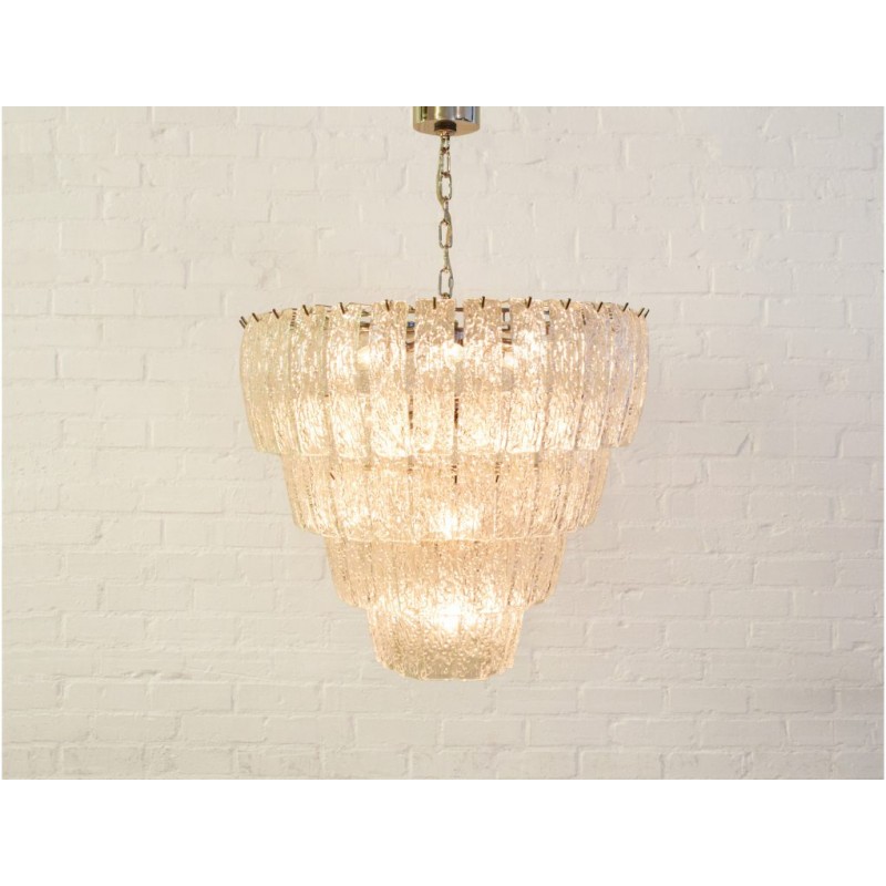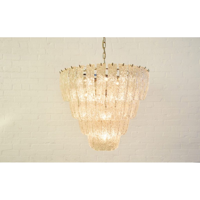 Venetian crystal glass – hand cast to recreate the sensual light play of warm summer sun on the lazy waters of a Venice canal – cascades in undulating tiers to create a classic silhouette. Always alluring, always in style.