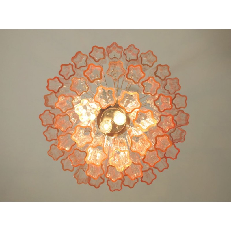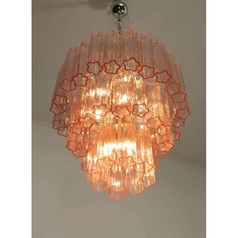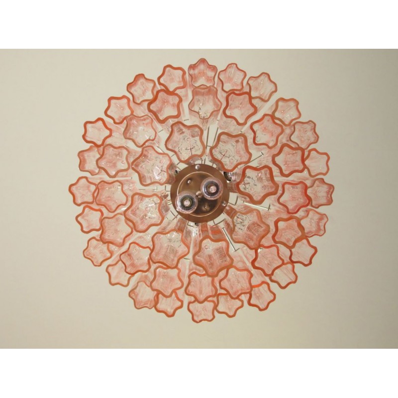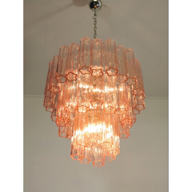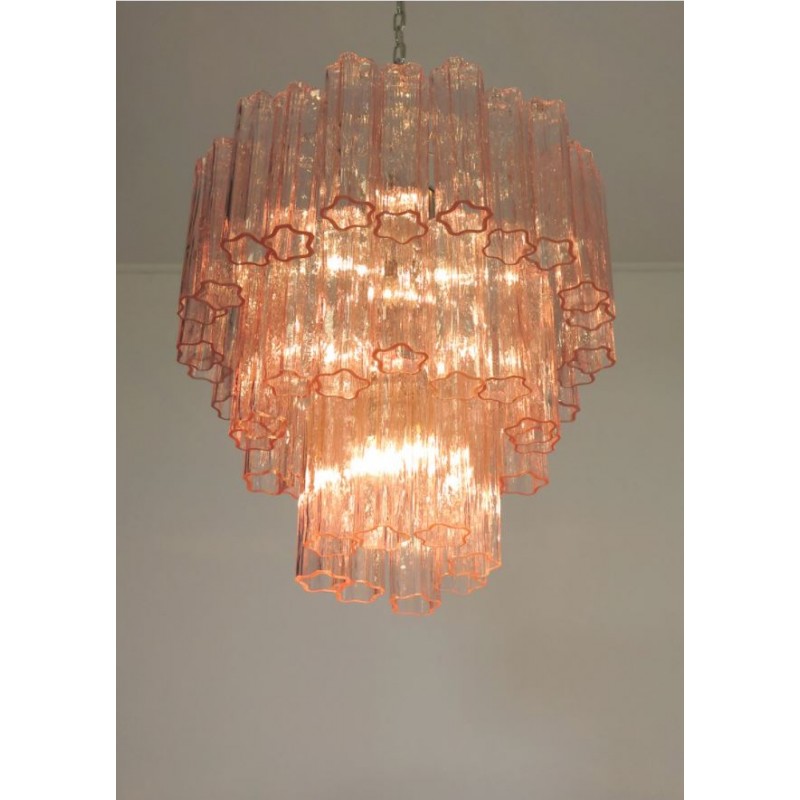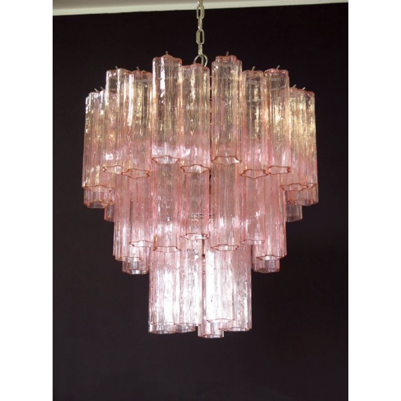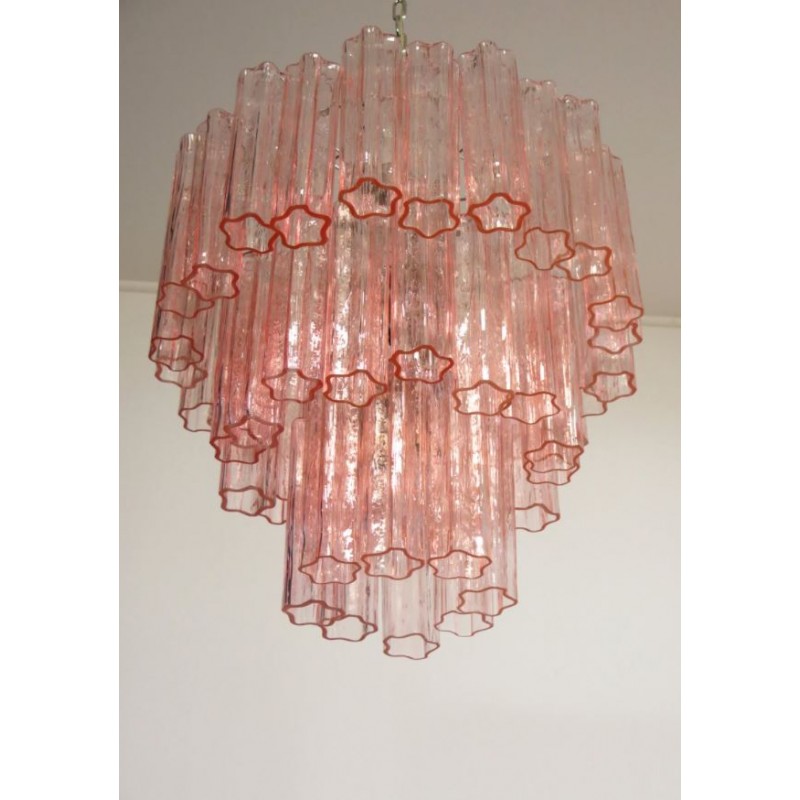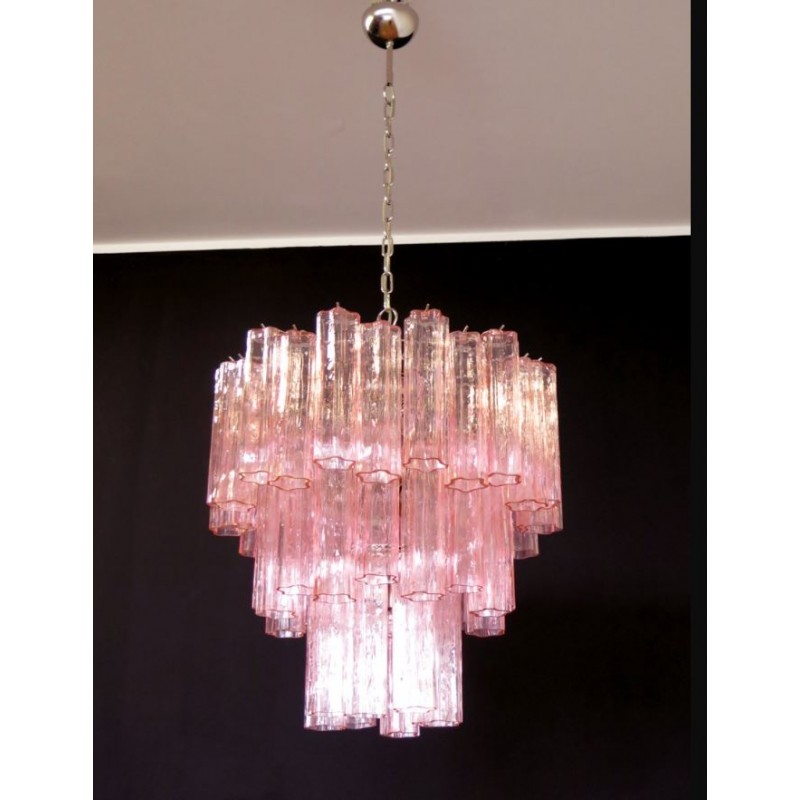 Italian vintage chandelier in Murano glass and nickel-plated metal structure. The armor polished nickel supports 48 large pink glass tubes in a star shape. The glasses have a beautiful color, object of rare beauty. An example of glass art in a vertical setting, ideal for huge dining tables that require an overwhelming statement. This chandelier is a unique display of chic design and modern innovation at its finest. The rediscovery of Murano glass as a conductor of magical rare light has pushed designers to define creation within a repertoire of ever-changing materials, making each piece an original work. The natural and precious nature of this glass becomes the first argument of its seductive illumination. Its size, is the second. As broken lines of light streak across every surface, Murano glass brings additional mystery and uniqueness to these creations.