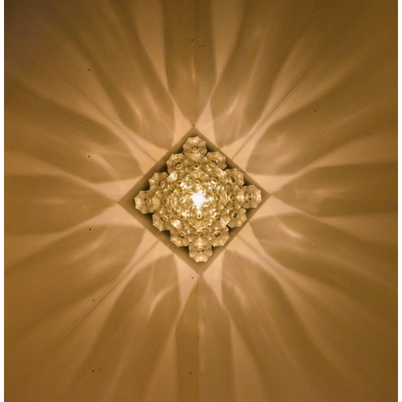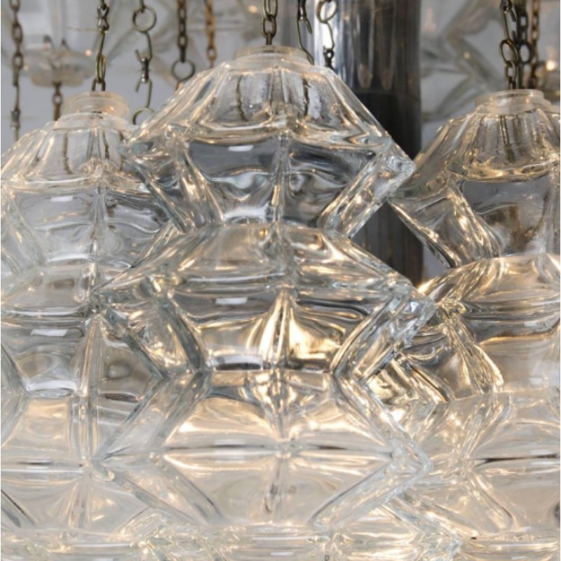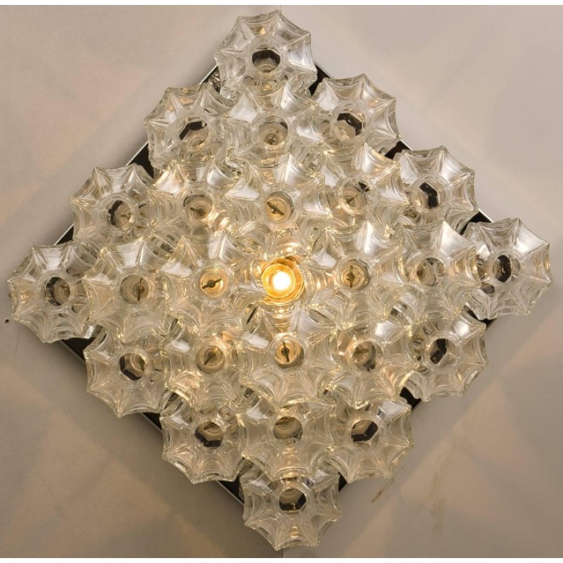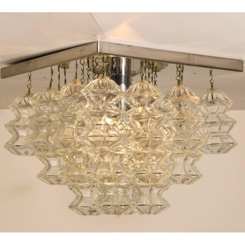 Fantastic and rare Kalmar "Pagoda" pattern glass flushmount chandelier. Manufactured in midcentury. 24 glasses with a pagoda are hanging on a nickel-plated metal frame. In three concentric tiers to form a dramatic and substantial statement. Due to the vintage nature of this fixture, there may be some imperfections in the glasses. Takes a medium base bulb up to 150 watts. In a very good vintage condition. Cleaned, well-wired and ready to use. The chandelier can be disassembled and the crystals individually wrapped for easy transport.