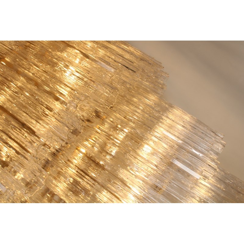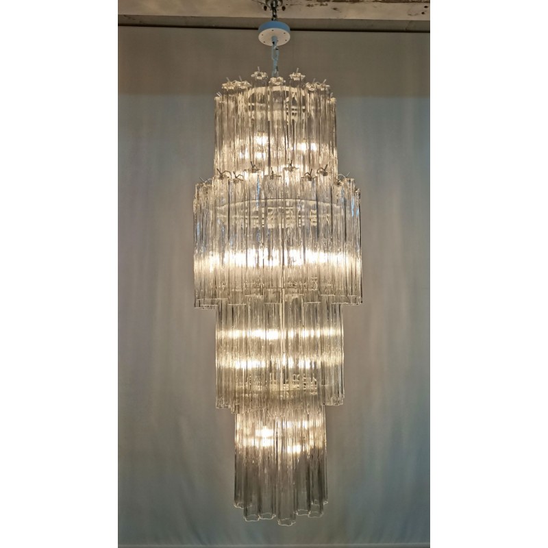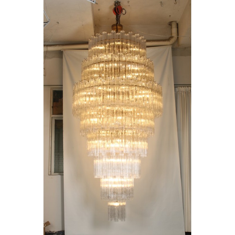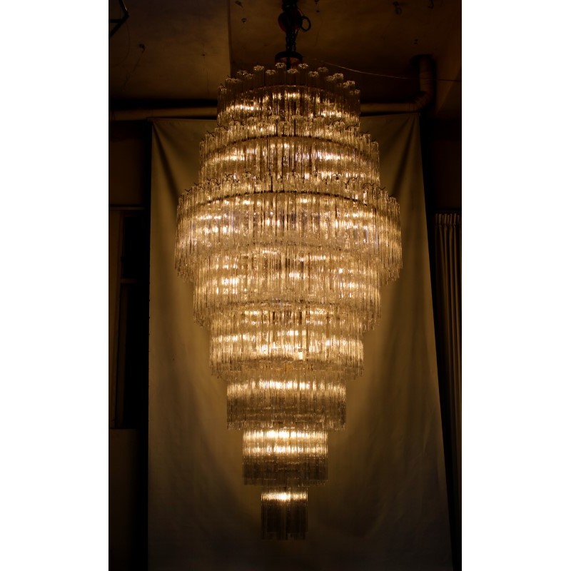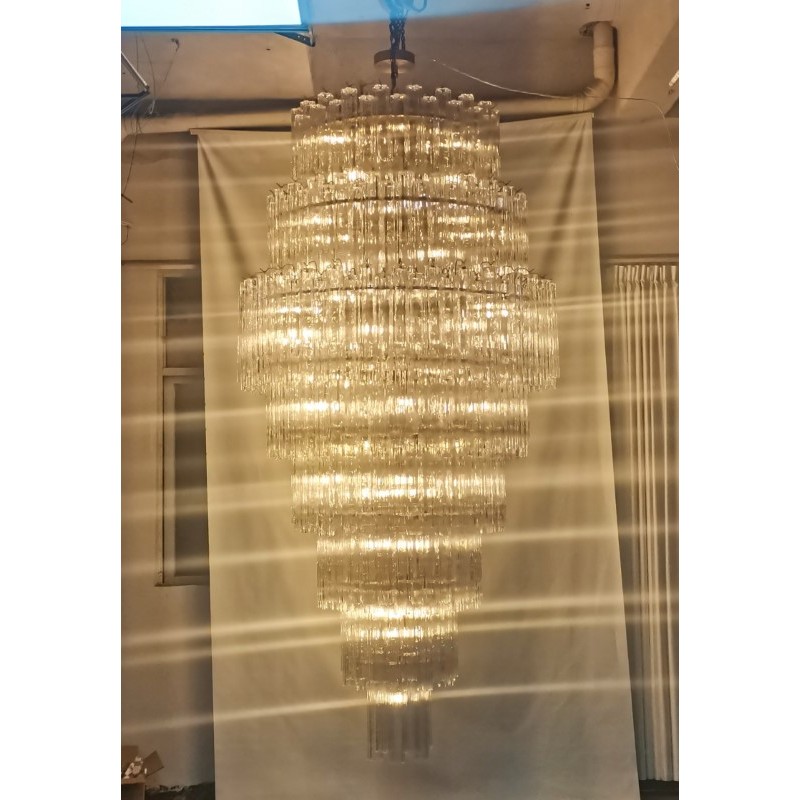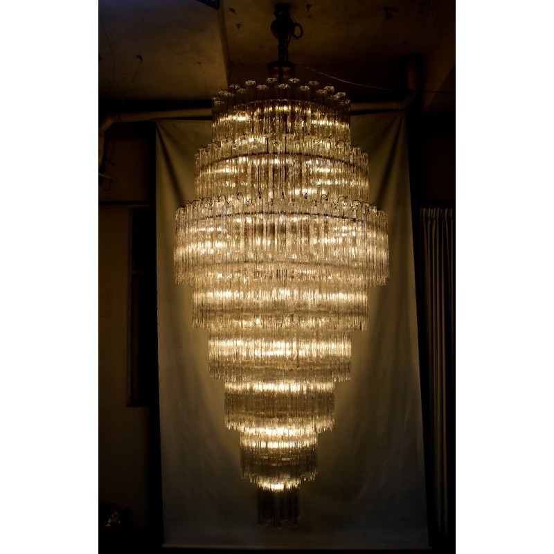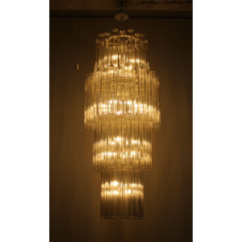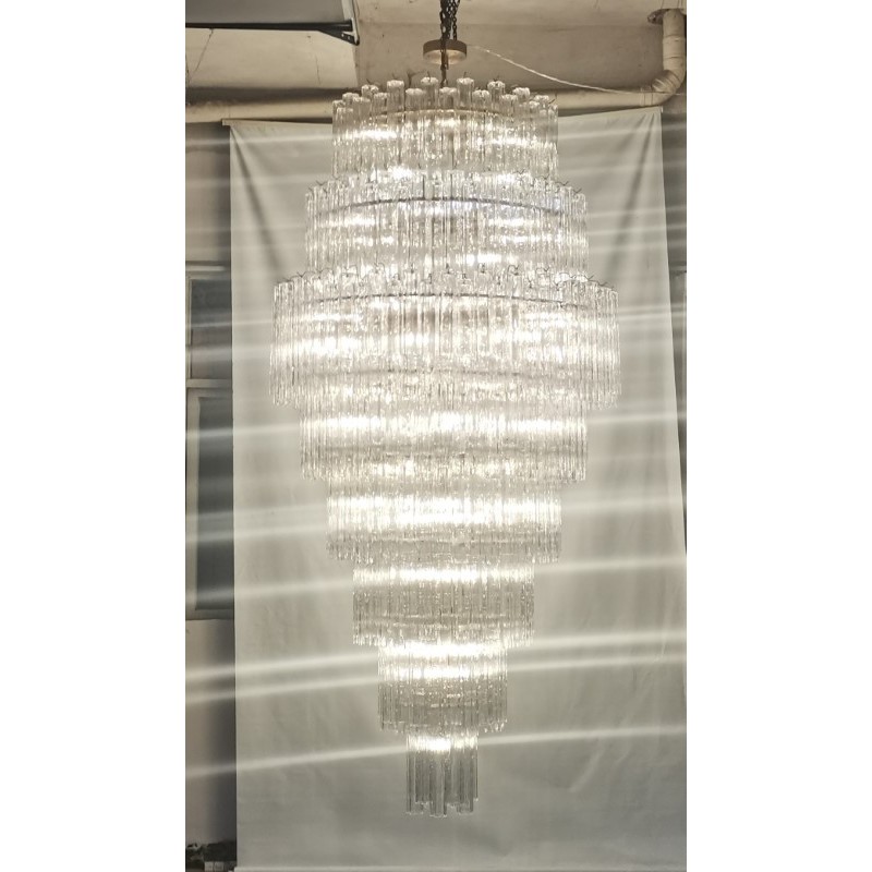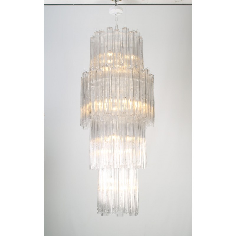 This Gorgeous cascading Multi Tiered chandelier made of hand-blown Murano glass pendants is a grand, statement-making piece that is sure to add luxury and class to your space. It’s beautifully shaped Murano Glass Tubes are hand-blown glass that creates a nice graded structure. The chrome frame in original condition shows ware only visible during assembling. It comes with an original chrome link chain and chrome canopy.
