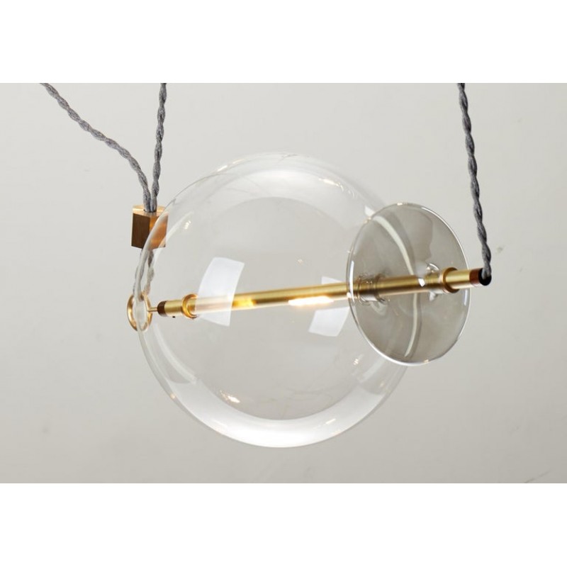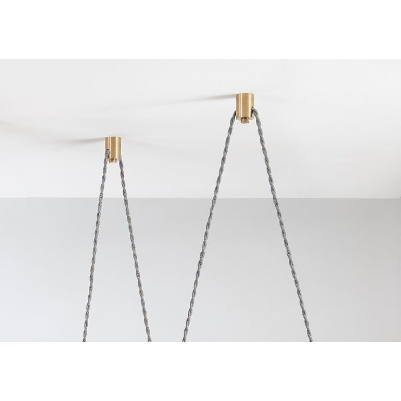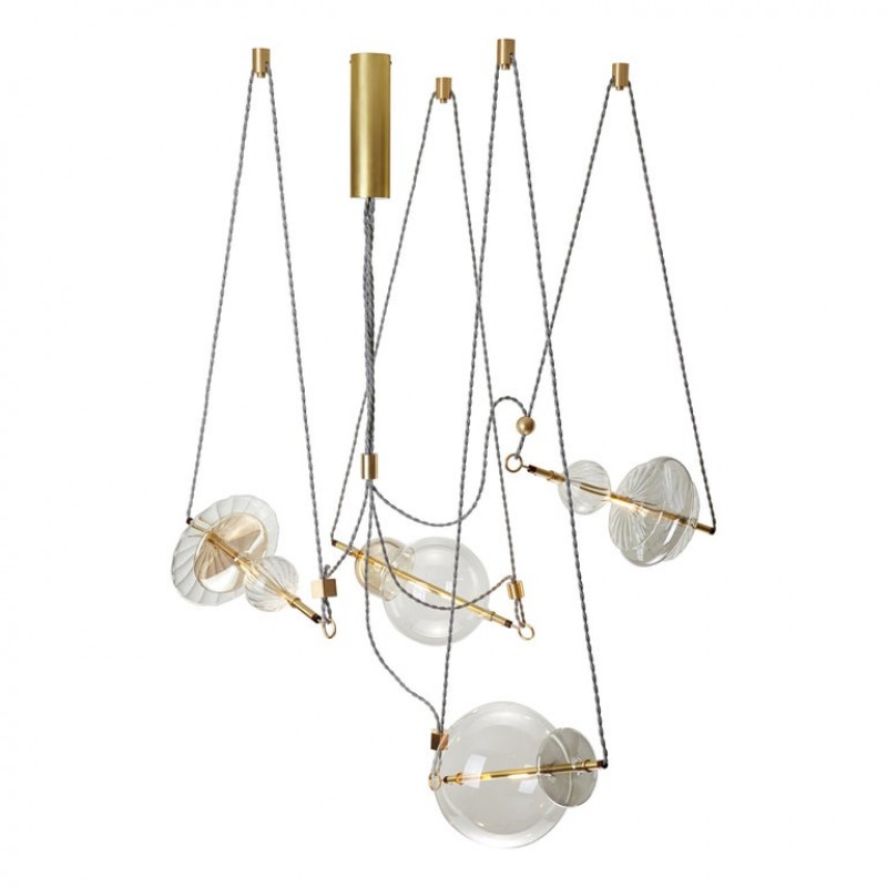 The Trapezi contemporary chandelier is inspired by the idea of a Circus Trapeze Artist. Hand blown glass in a variety of forms and colors is combined with brass bars and hung by Linen Cords from hub units on the ceiling. The glass is left transparent or hand-painted "A Lustro," an ancient technique that mixes the colors with gold particles, this process gives a particularly bright appearance. The arrangement of the lights is entirely flexible, and the hanging cables have a clear aesthetic function within the overall composition. Its loose, modular nature makes it a highly configurable piece based on the needs of the project. This lamp has one LED for each element. The light gets out from the brass rod crossing over the hand-blown glass, and through it is diffused nicely. The direction of each light can be adjusted separately. When brass is brushed with a wax coating to slow down the natural oxidation process, thus creating an alluring finish that ages gracefully over time. Its pertinence of contemporary style lies in its functionality and unpredictability.