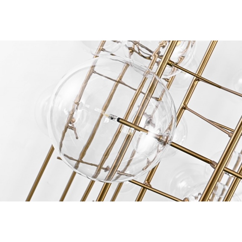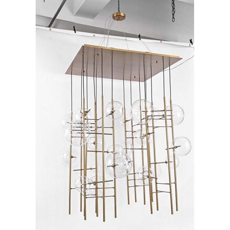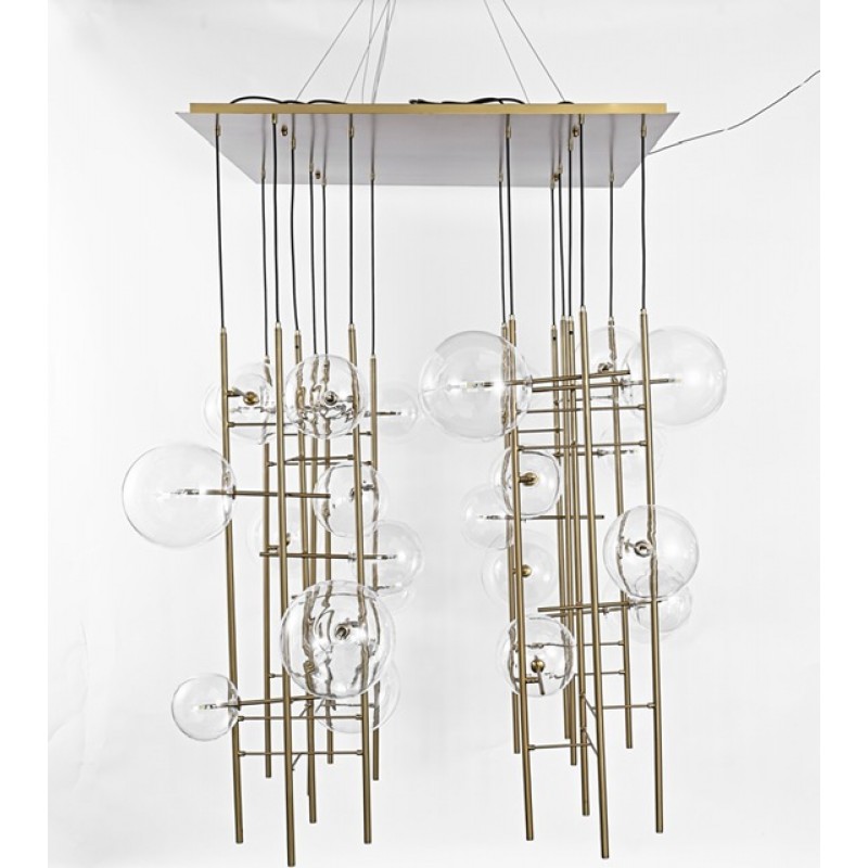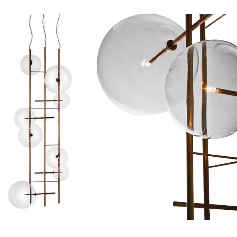 Hanging lamp with halogen point light (20W). Eight transparent blown glass spheres. Metal parts in hand burnished brass. The hand-burnished brass finish looks naturally spotted and irregular. Due to this handmade processing, each product is unique and exclusive. Because our lighting is made by a workforce that still relies on traditional working methods, each product is unique and carries with it the sensitivity of the artisan.