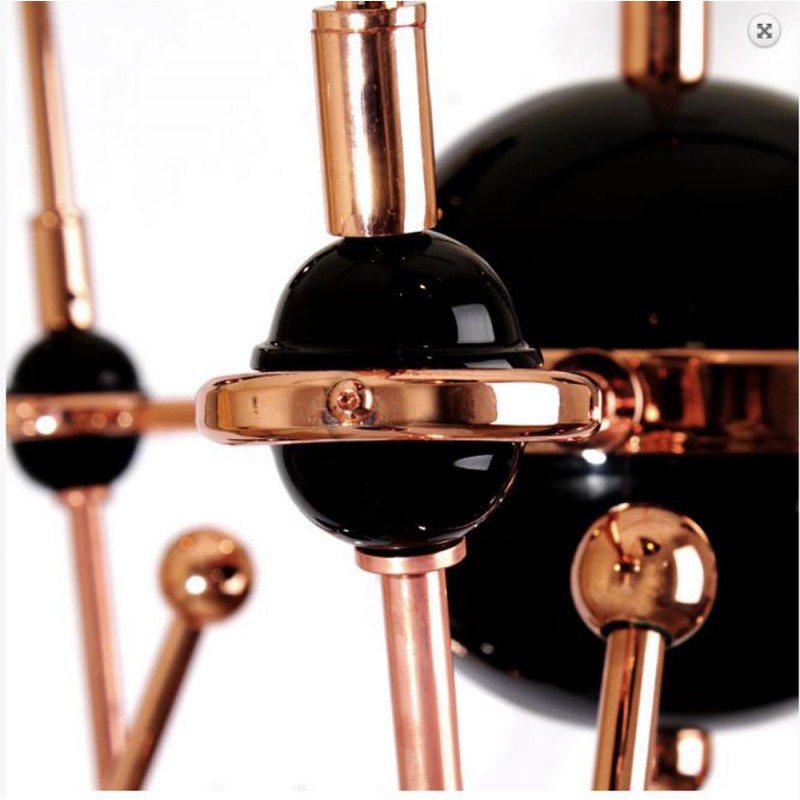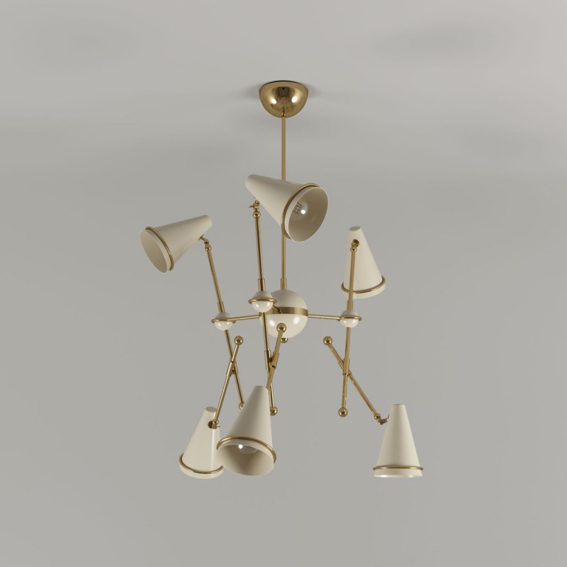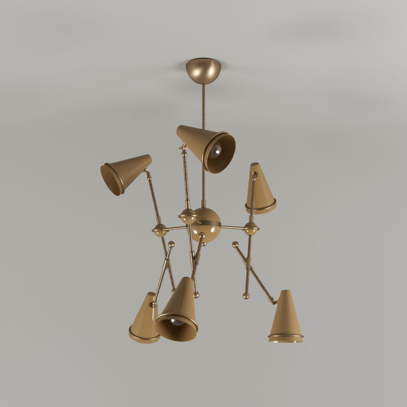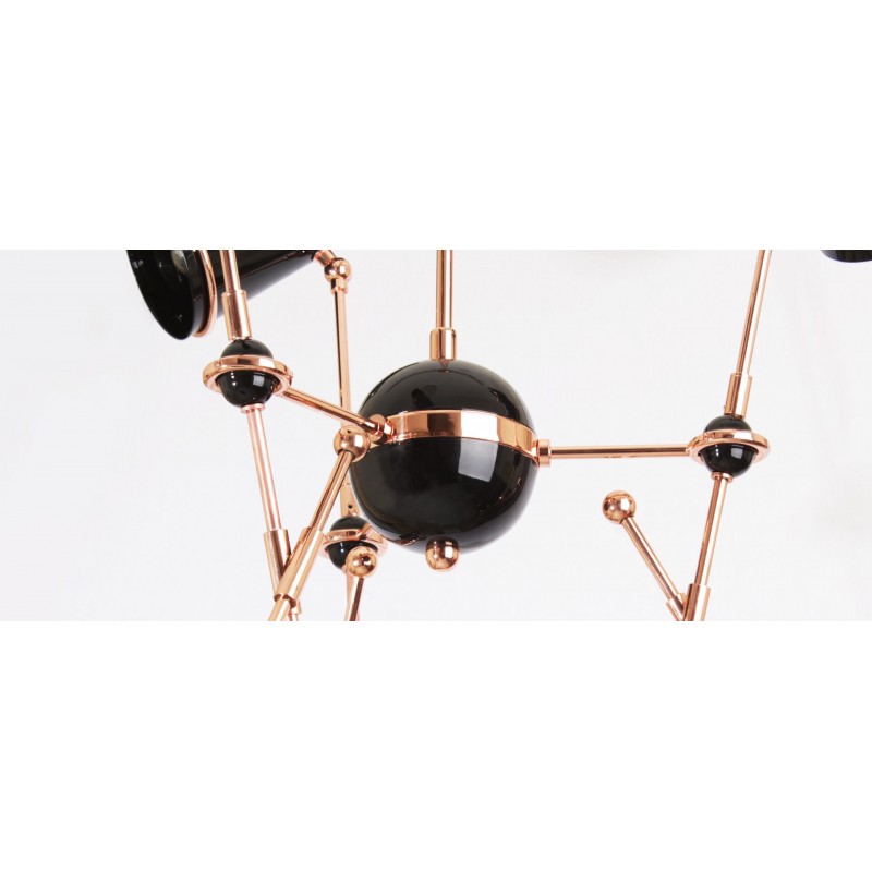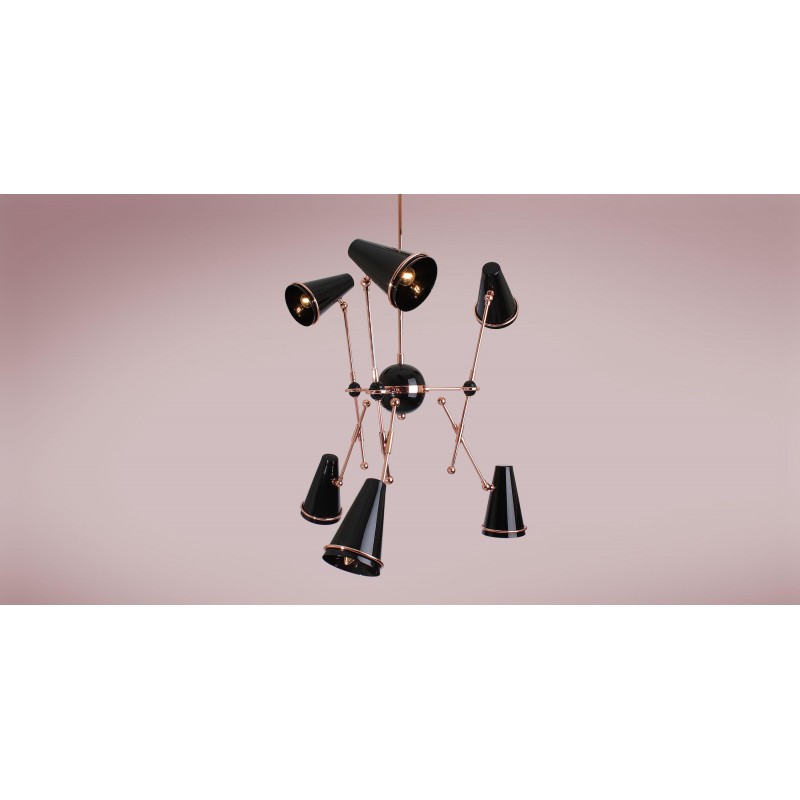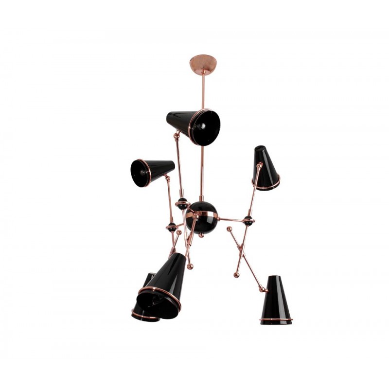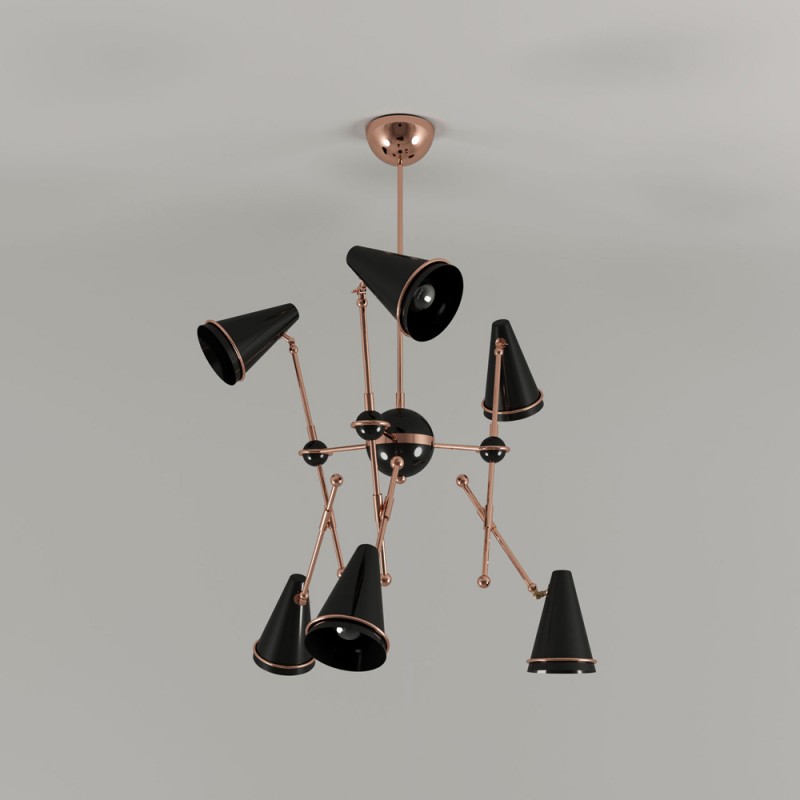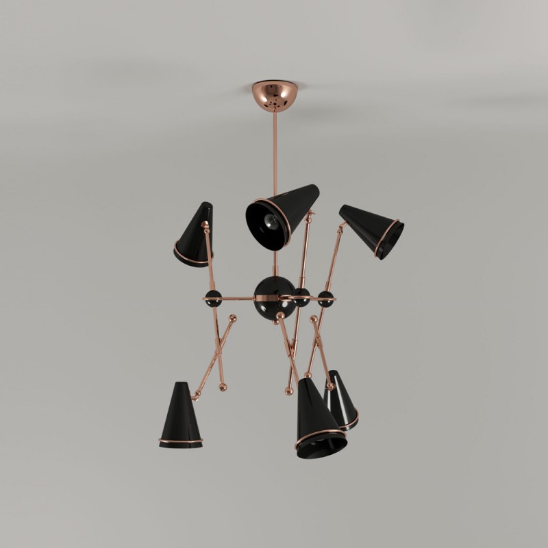 Very stylish Lamp honoring the skills in metalworking of artisans, Tophane modern suspension lamp mixes copper plated brass arms with directional aluminum shades lacquered in black and white. This contemporary lighting piece simultaneously reminds us of the typical Turkish hats as well as the cannons, once made on this old industrial district, currently home of the Tophane-i Amire Culture.  At Alan Mizrahi Lighting Design, we supply and manufacture many highly sought after designer pieces. All Chandeliers can be customized by the number of lights, style, color, and size to meet your specific needs.