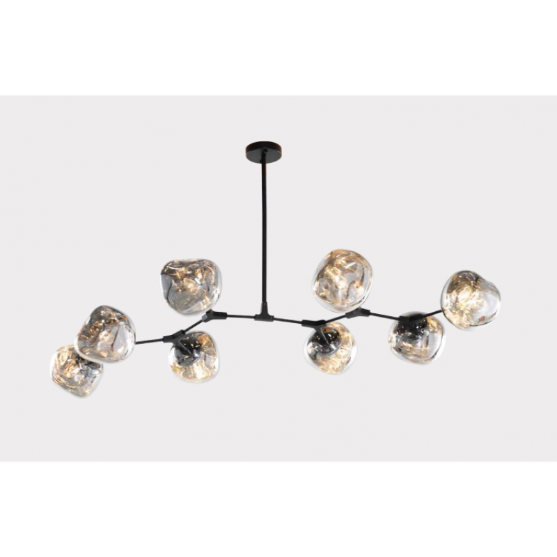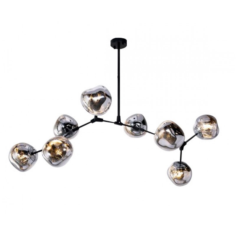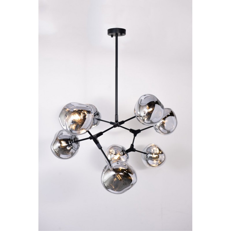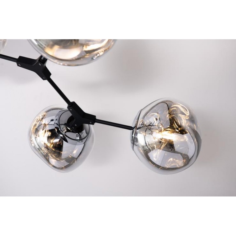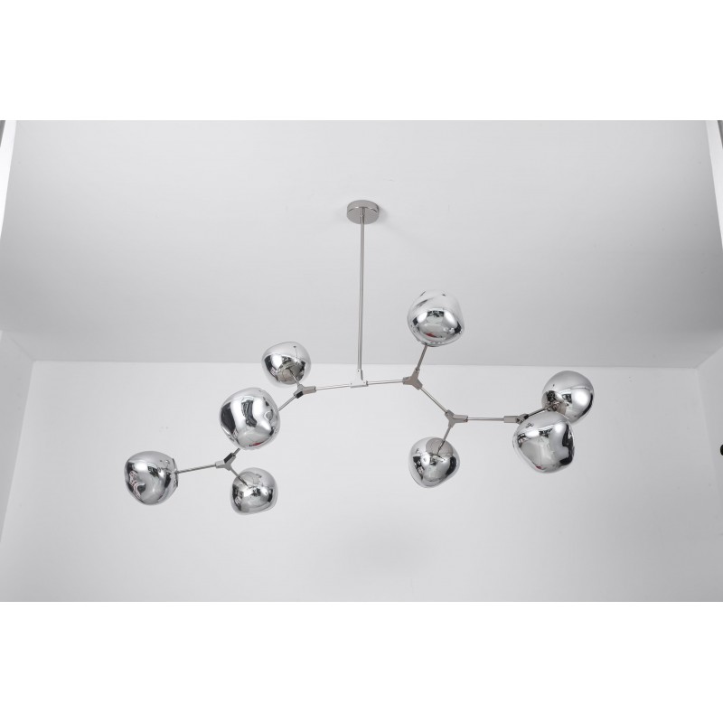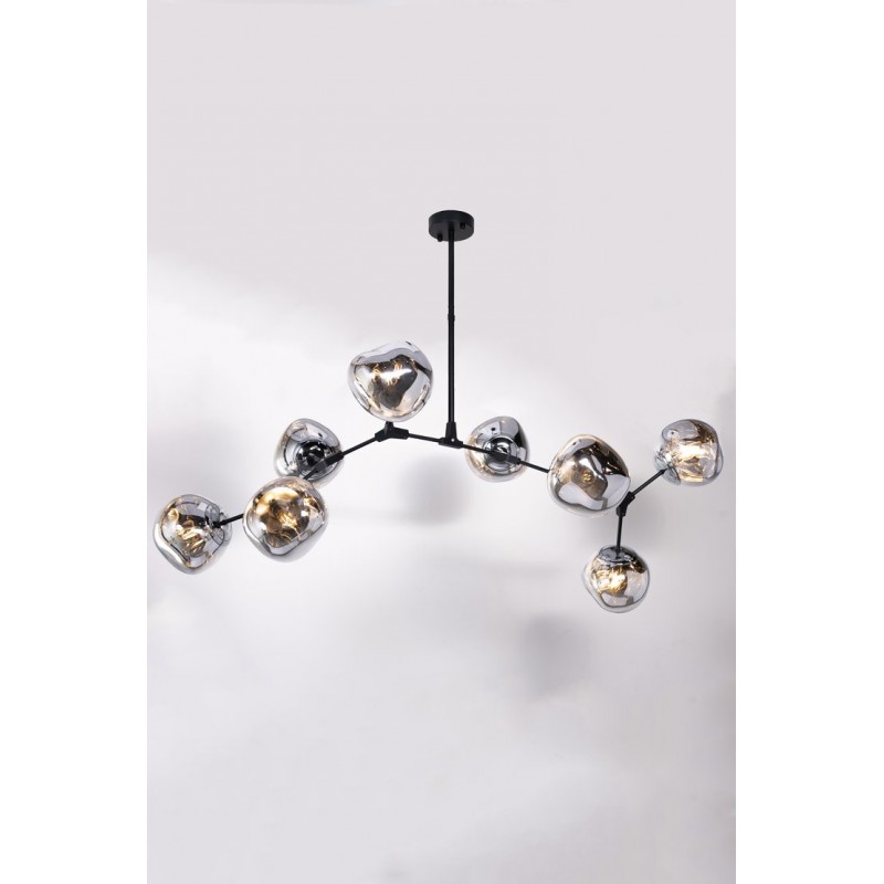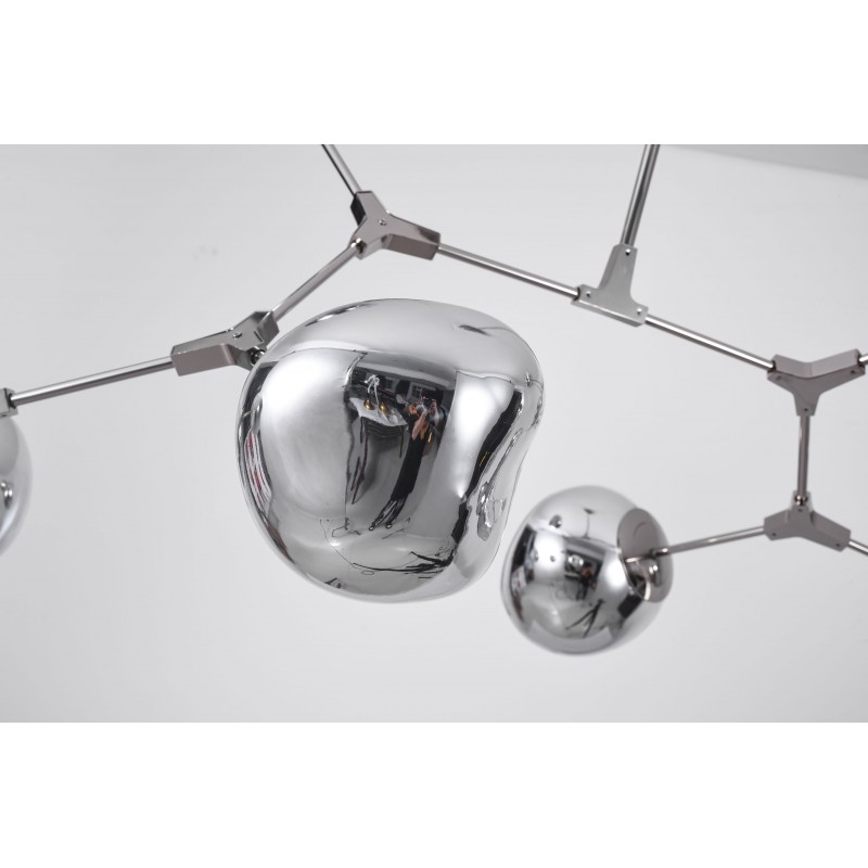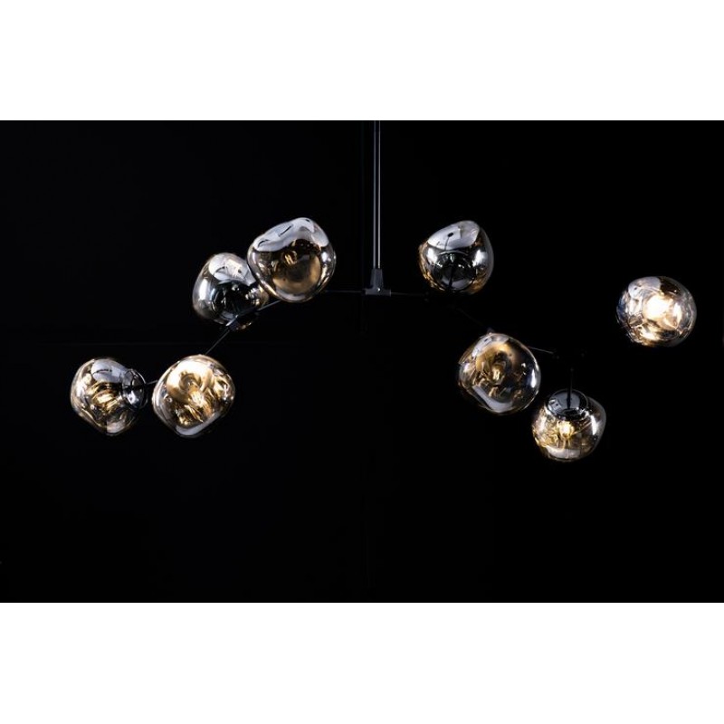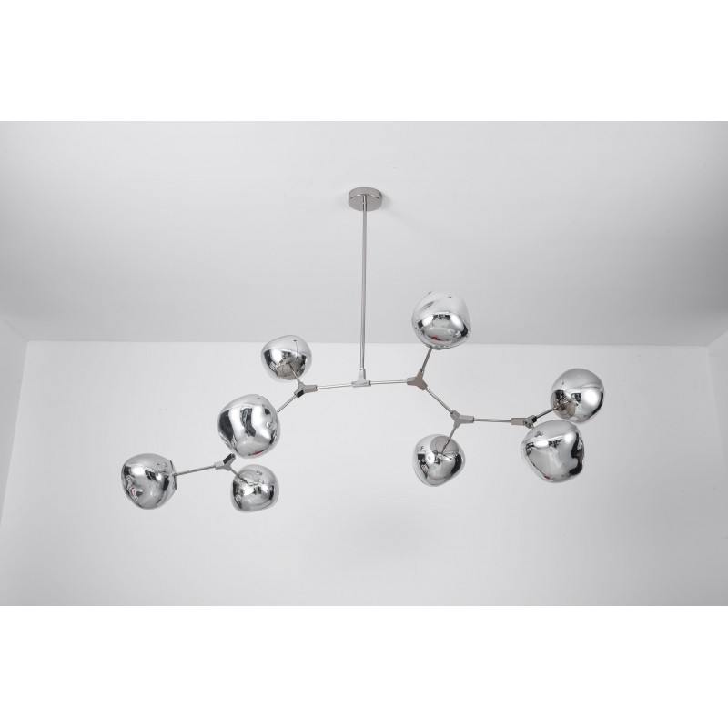 The branching bubble chandelier takes a new form with RHOME II. This interpretation of the classic Sputnik style merges futuristic themes with organic shapes and silhouettes. Eight molten metallic bubbles balance along a matte black frame. The intriguing oblong bubbles act as a mirror, and offer a unique take on chrome. These oblong shades are made of chrome-plated acrylic rather than glass, creating a special effect. When lit, a sparkling array of light shines through the metallic surface--creating a glittering effect.