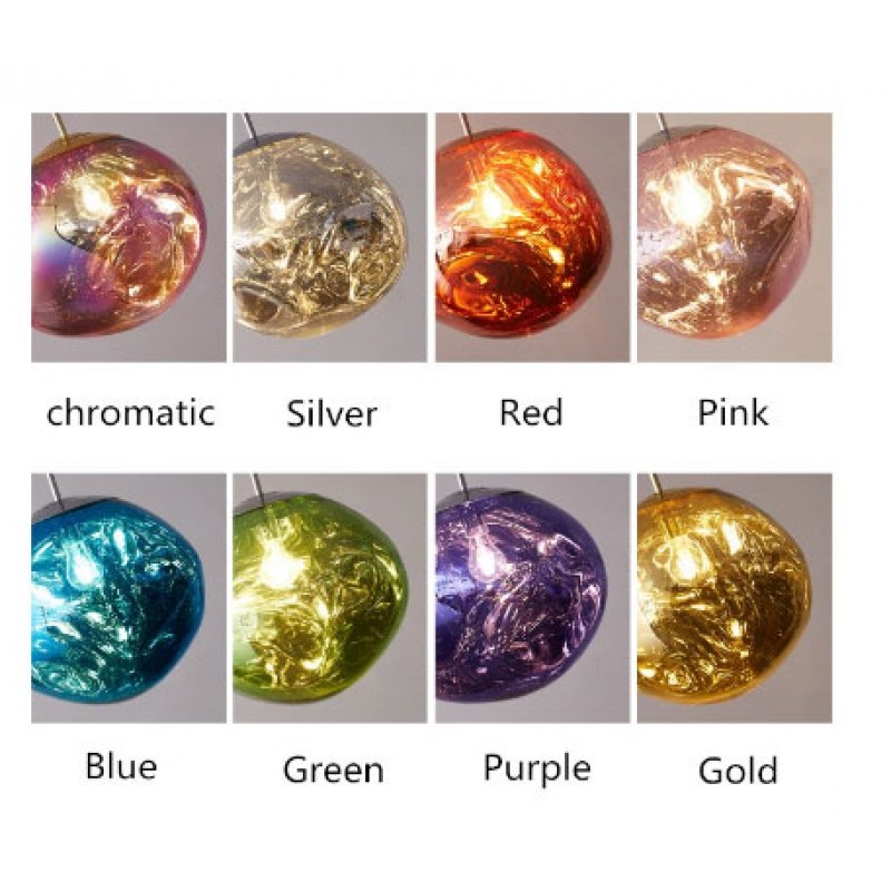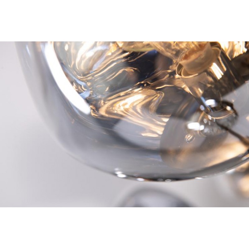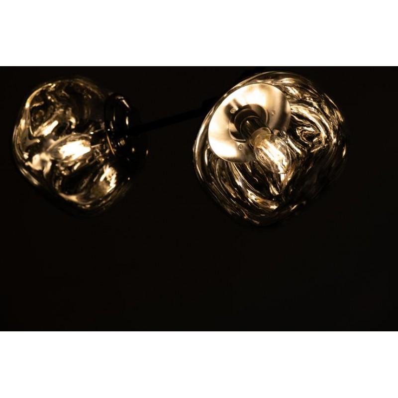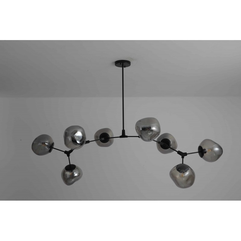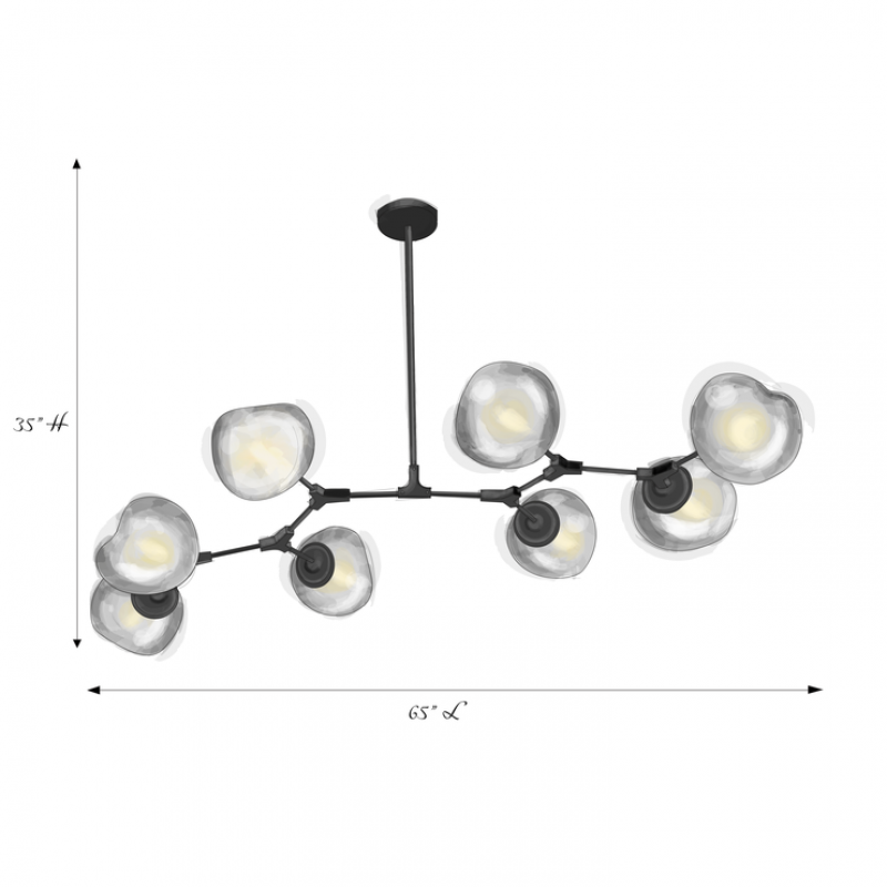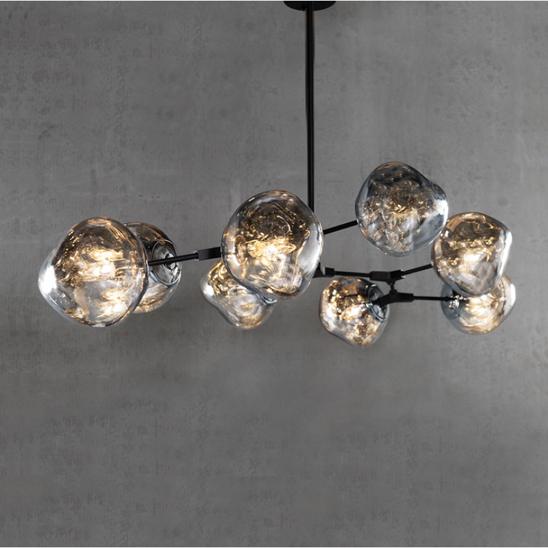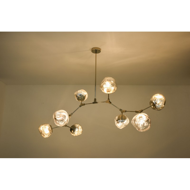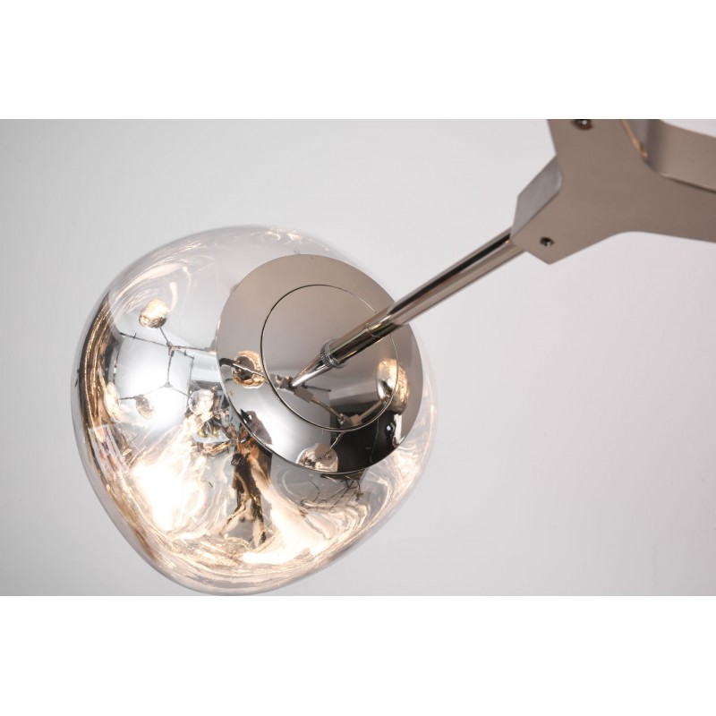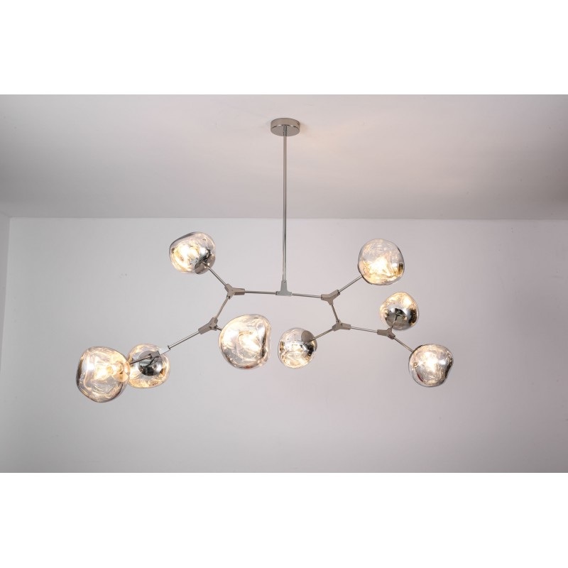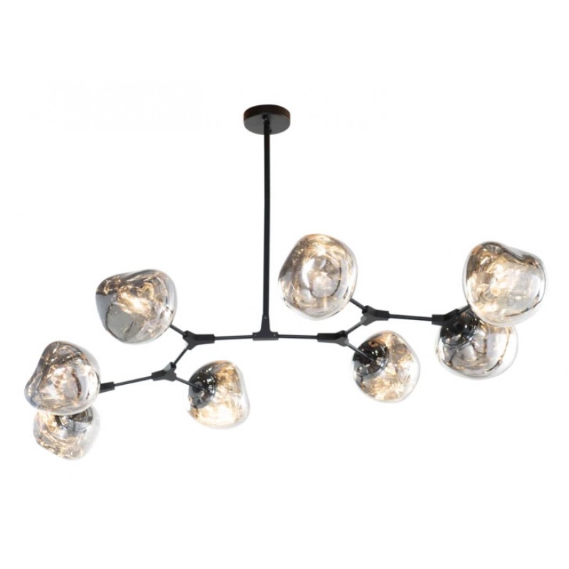 The branching bubble chandelier takes a new form with RHOME II. This interpretation of the classic Sputnik style merges futuristic themes with organic shapes and silhouettes. Eight molten metallic bubbles balance along a matte black frame. The intriguing oblong bubbles act as a mirror, and offer a unique take on chrome. These oblong shades are made of chrome-plated acrylic rather than glass, creating a special effect. When lit, a sparkling array of light shines through the metallic surface--creating a glittering effect.
