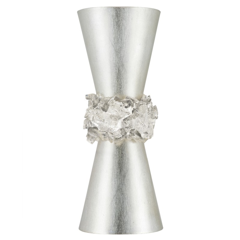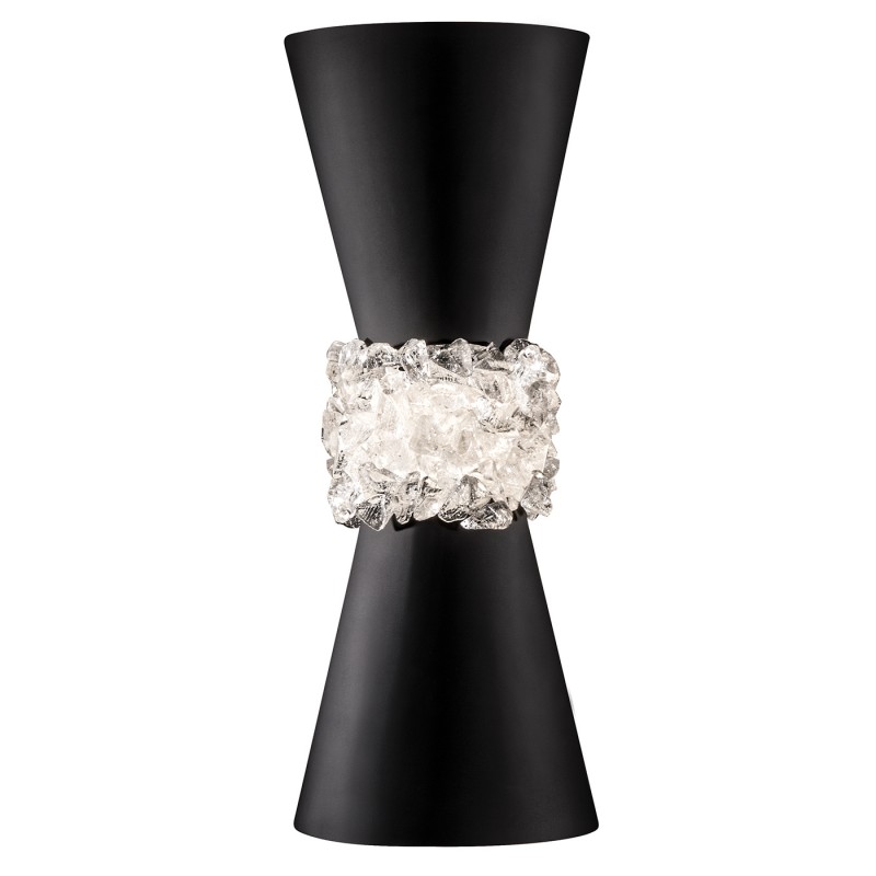 Sconce in a champagne tinted gold leaf finish featuring hundreds of rough cut crystal glass gems that refract light in a manner reminiscent to the cirrus clouds ice crystals that form the lunar halo in the frozen night sky. Also available in platinized silver leaf or matte black.ough cut crystal glass gems that refract light in a manner reminiscent to the cirrus clouds ice crystals that form the lunar halo in the frozen night sky. Also available in platinized silver leaf or champagne tinted gold leaf.