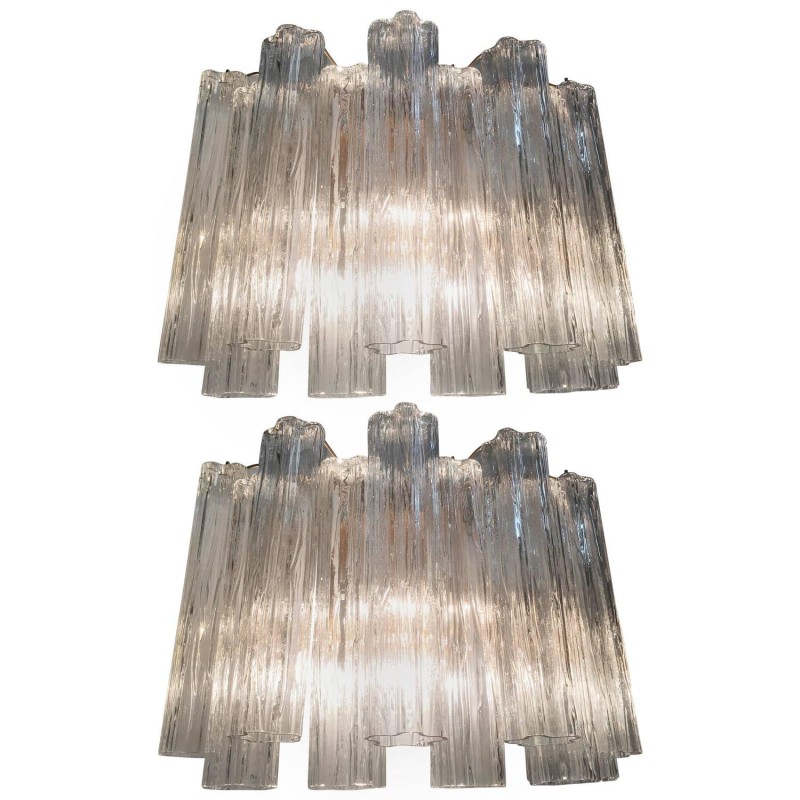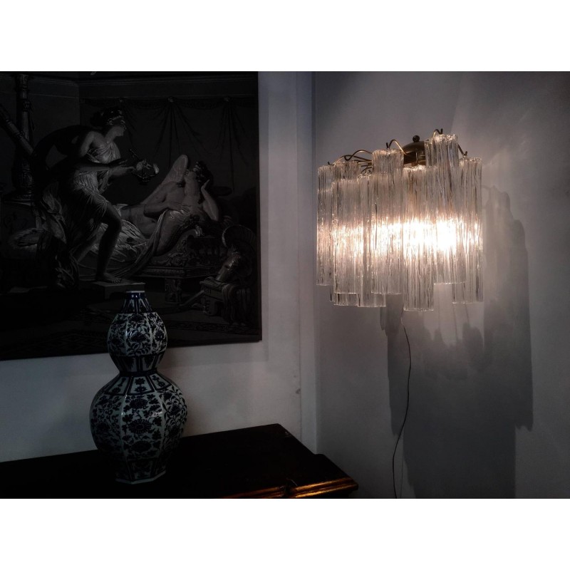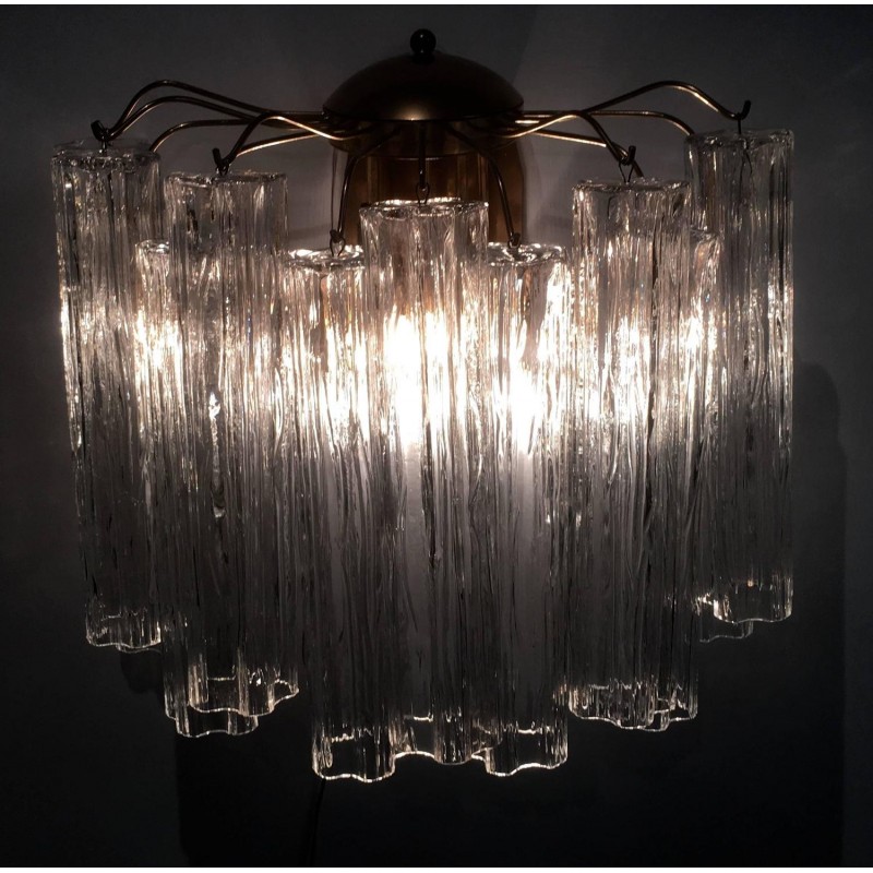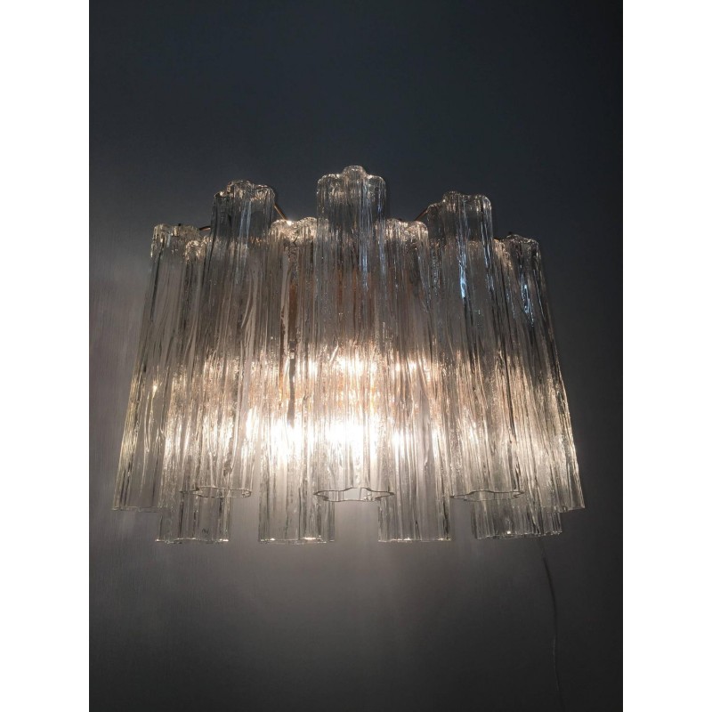 This stunning Venetian style sconce is a statement-making piece that is sure to add luxury and class to your space. It’s beautiful shaped Murano Glass Tubes are hand-blown glass that’s creates a nice gradual structure. This piece is available in different finishes, we also can make the glass in different colors as well.