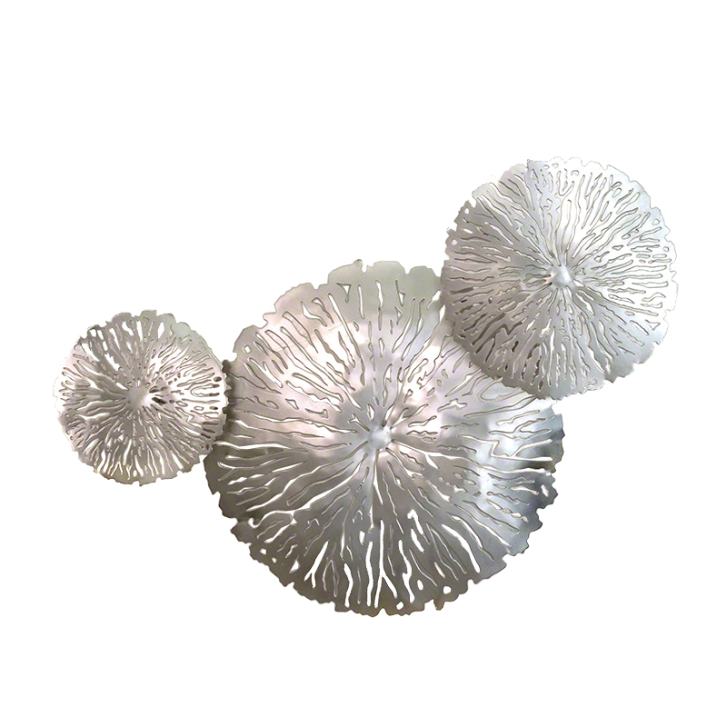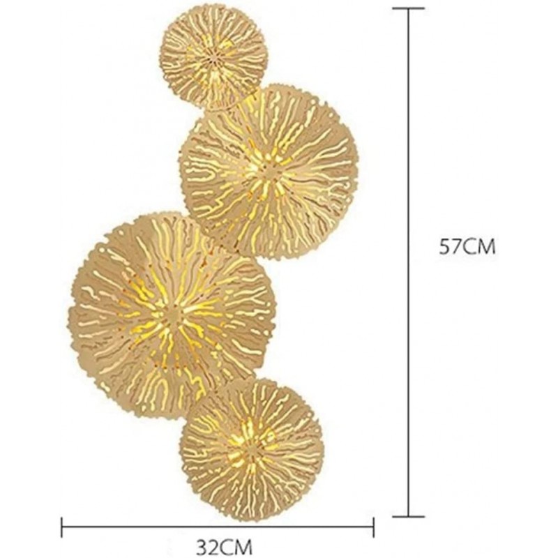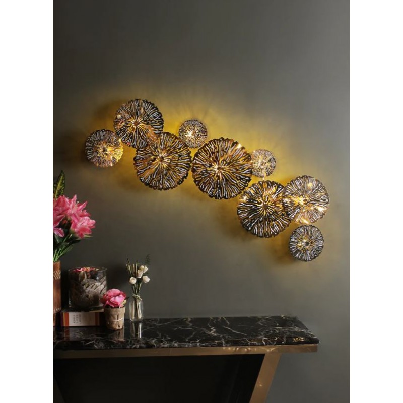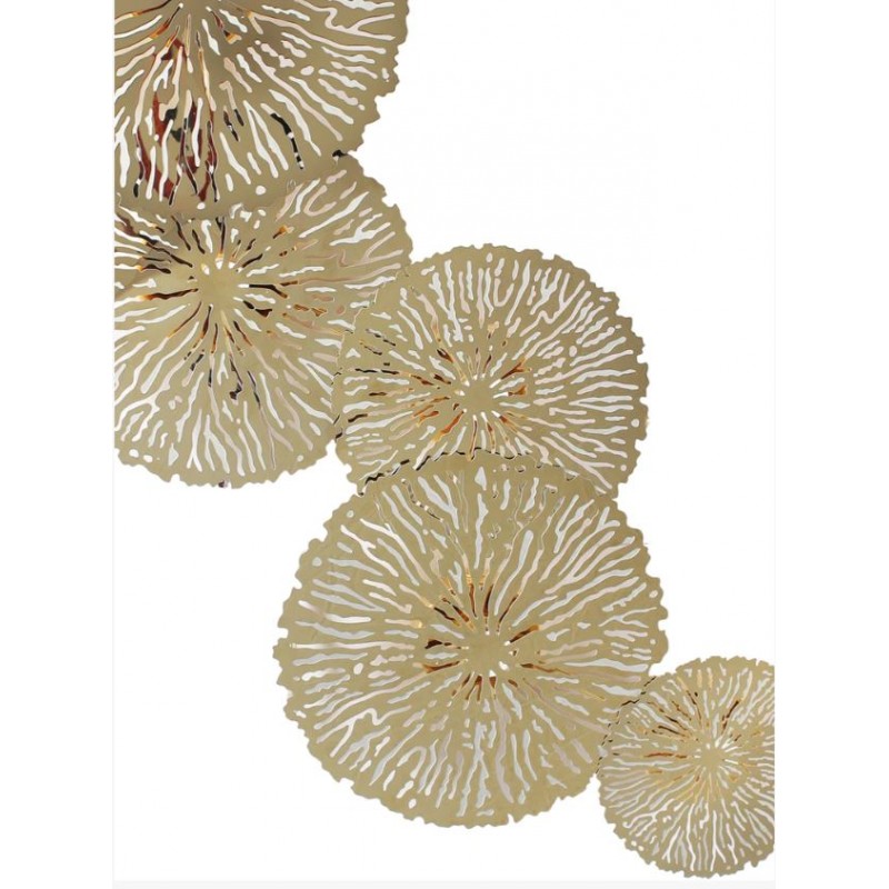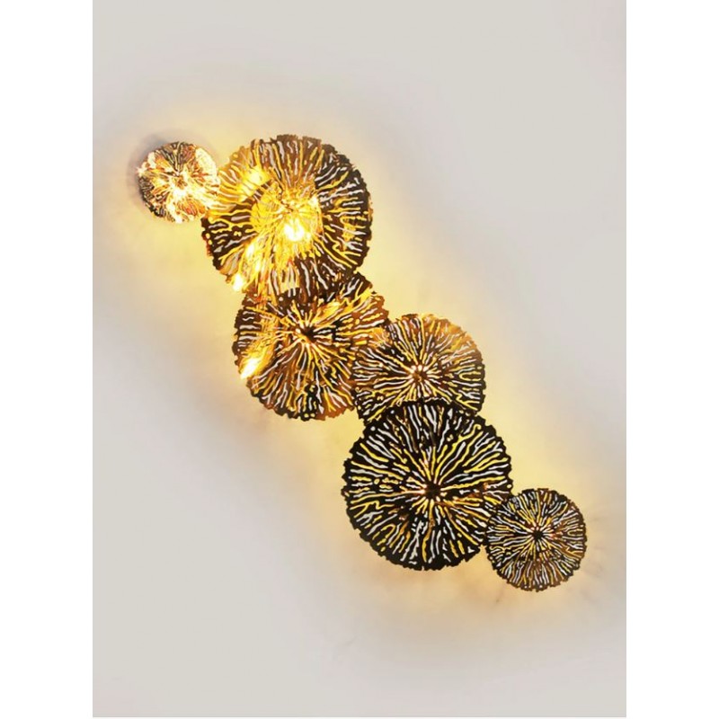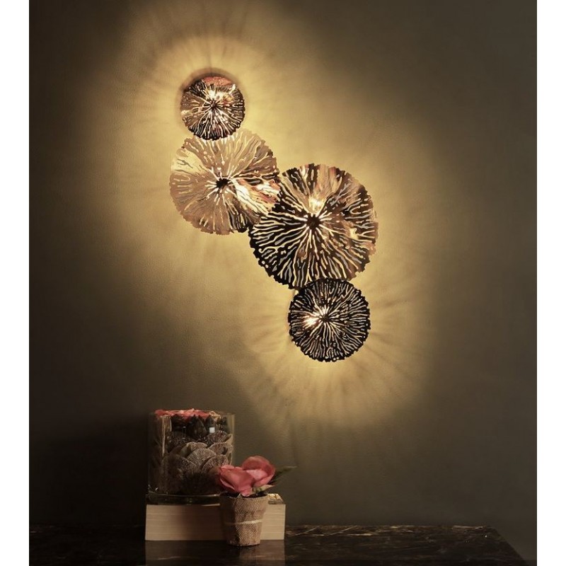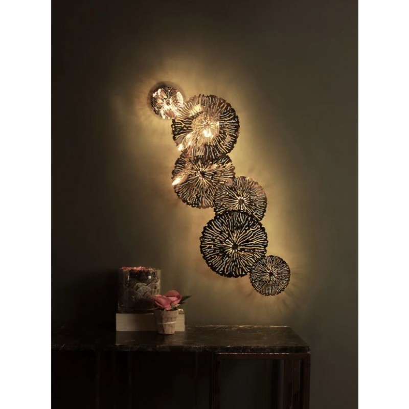 Blending art Deco lighting styles with modern concepts, the LILY PAD Wall Light creates texture and depth in contemporary decor with the intriguing metal circles wall sculpture. The open metalwork on the metal discs add an ethereal element and allows light to pass through to create a stunning light effect on the wall. The LED Wall Light glows from the center to create an impressive lighting effect that will enhance almost any room. Each highly-detailed is delicately perforated to allow only small amounts of light to pass through. Use several clusters to create a multidimensional floral wall. Lily Pad cluster is unique and truly a work of art. Because our lighting is made by a workforce that still relies on traditional working methods, each product is unique and carries with it the sensitivity of the artisan.