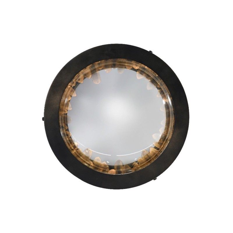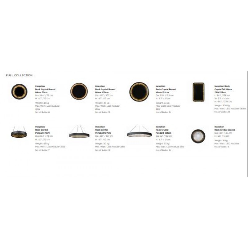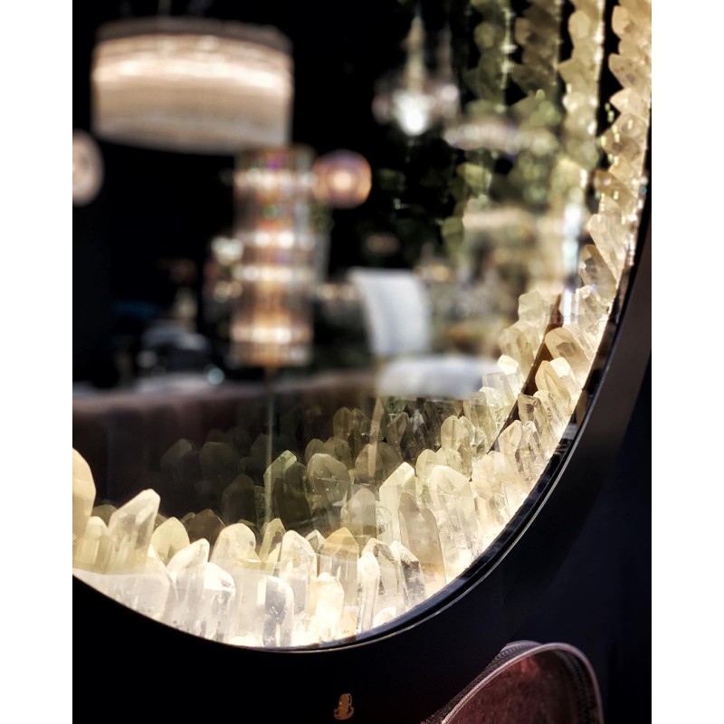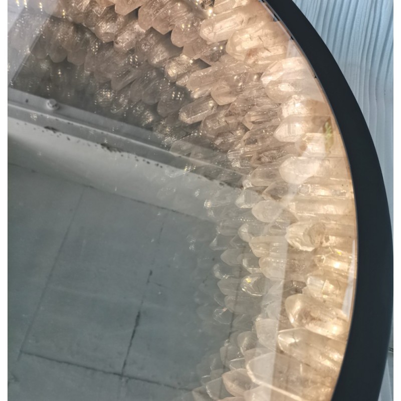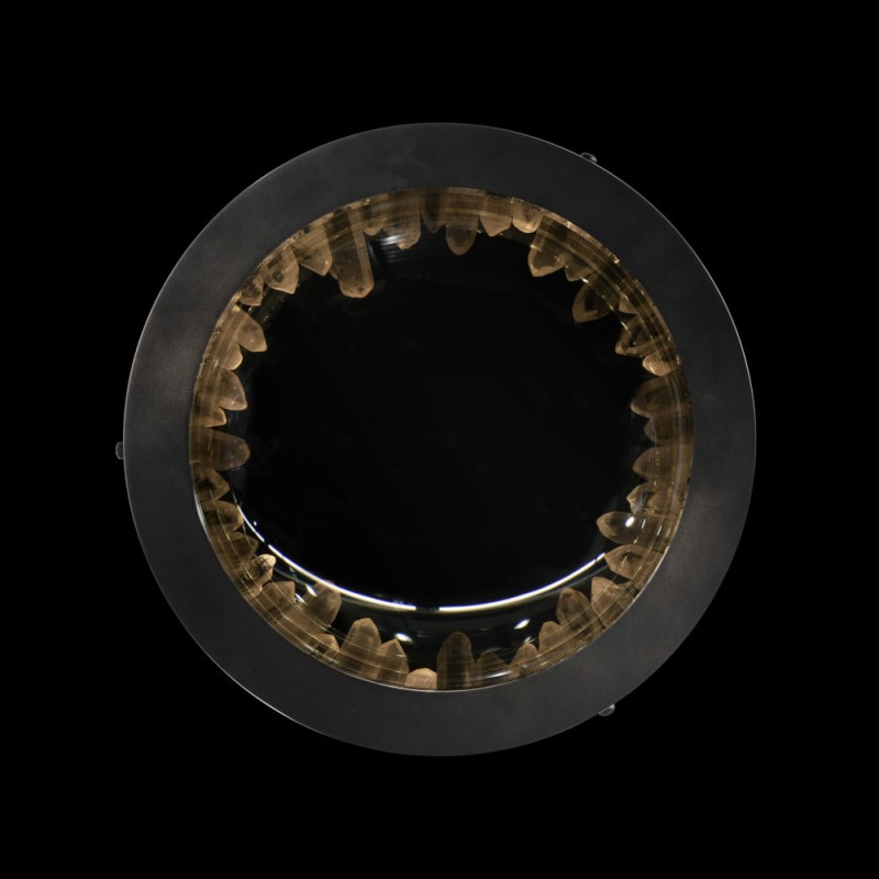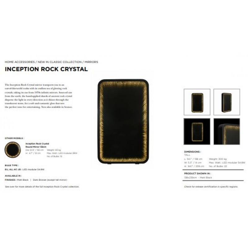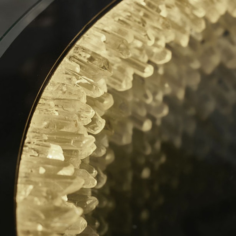 Mesmerizing the eye with an endless sea of glowing crystals, the Inception Rock Crystal mirror takes its cue from 1970s infinity mirrors but infuses it with mankind’s ancient love of precious stones. Sourced raw from the earth, icy shards of rock crystal are individually applied to circle the inner frame, topped by a clear pane of glass. Once turned on, the crystals multiply in a seemingly never-ending line of reflections, transporting you to an out-of-this-world realm. An exceptionally glamorous piece, handcrafted in matt black metal with bronzed edging, mixing echoes of Art Deco opulence with modern cutting-edge design. The multi-faceted rock crystals disperse the light in every direction as it shines through the translucent stone, for a soft and romantic glow that sets the perfect tone for entertaining.