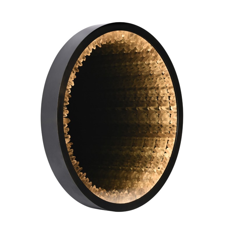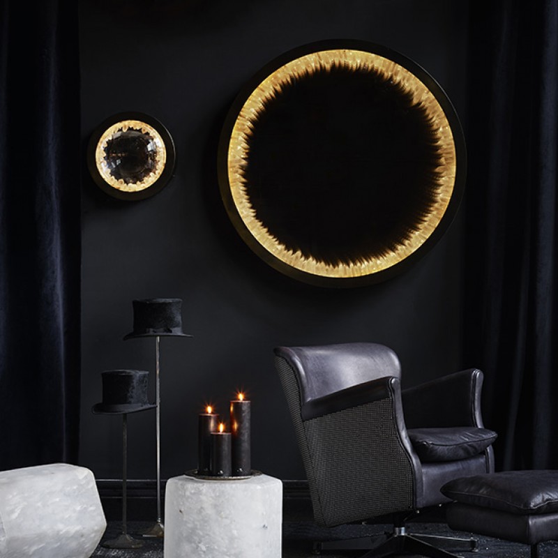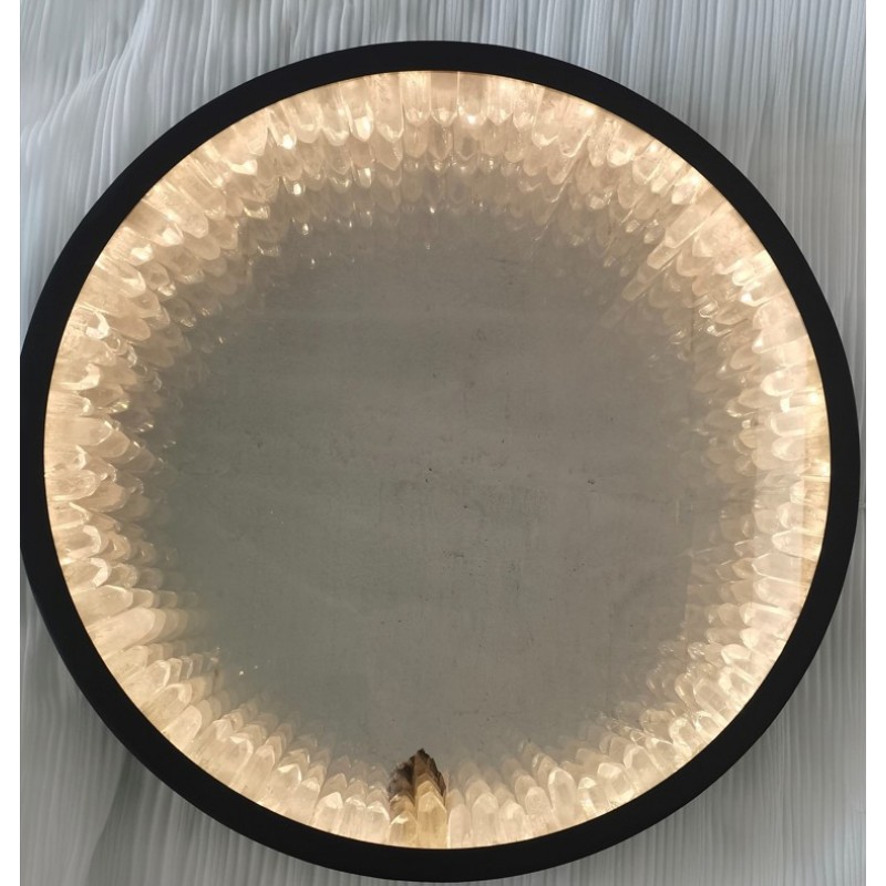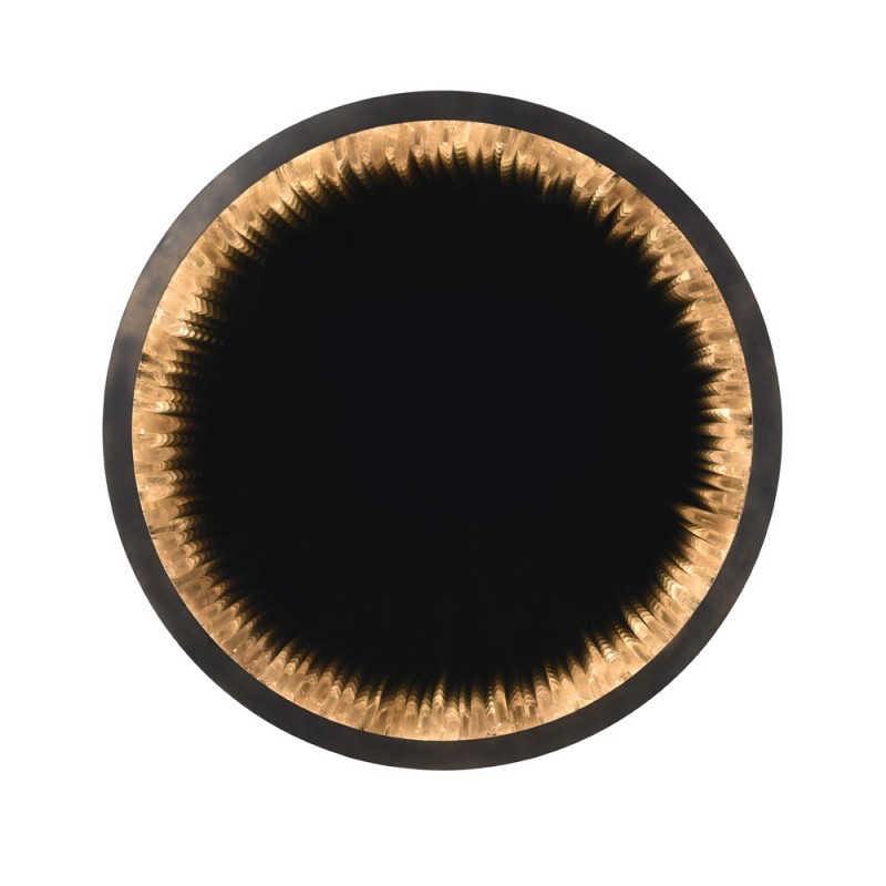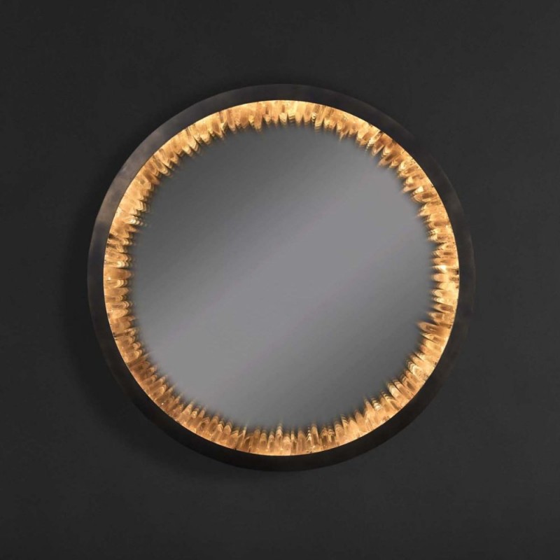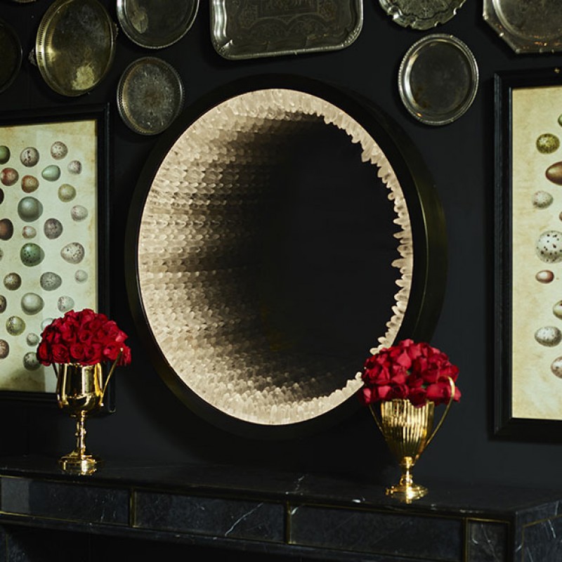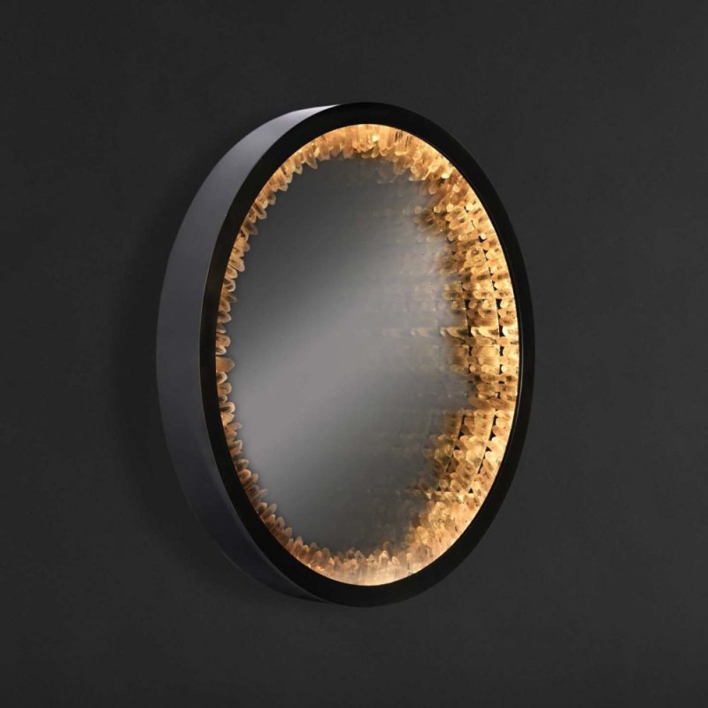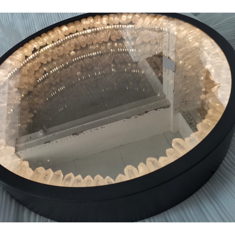 Mesmerizing the eye with an endless sea of glowing crystals, the Inception Rock Crystal mirror takes its cue from 1970s infinity mirrors but infuses it with mankind’s ancient love of precious stones. Sourced raw from the earth, icy shards of rock crystal are individually applied to circle the inner frame, topped by a clear pane of glass. Once turned on, the crystals multiply in a seemingly never-ending line of reflections, transporting you to an out-of-this-world realm. An exceptionally glamorous piece, handcrafted in matt black metal with bronzed edging, mixing echoes of Art Deco opulence with modern cutting-edge design. The multi-faceted rock crystals disperse the light in every direction as it shines through the translucent stone, for a soft and romantic glow that sets the perfect tone for entertaining.
